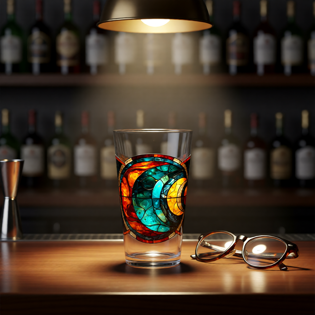 Elevate your home bar with this stained glass–look mixing glass, featuring an Arcane geometric design that glows with layers of color, mystery, and energy. Rich jewel tones, swirling mosaic fragments, and bold lead-like lines create the illusion of a handcrafted stained glass panel—while the surface remains smooth, durable, and strikingly modern.