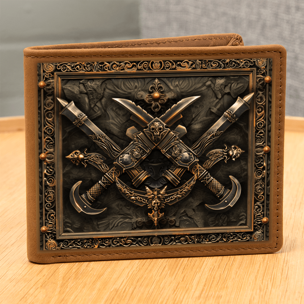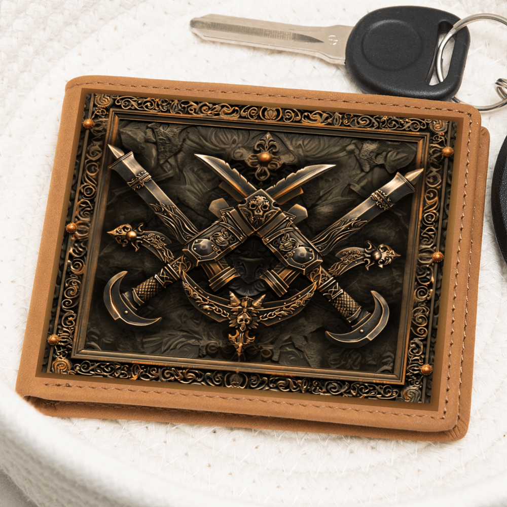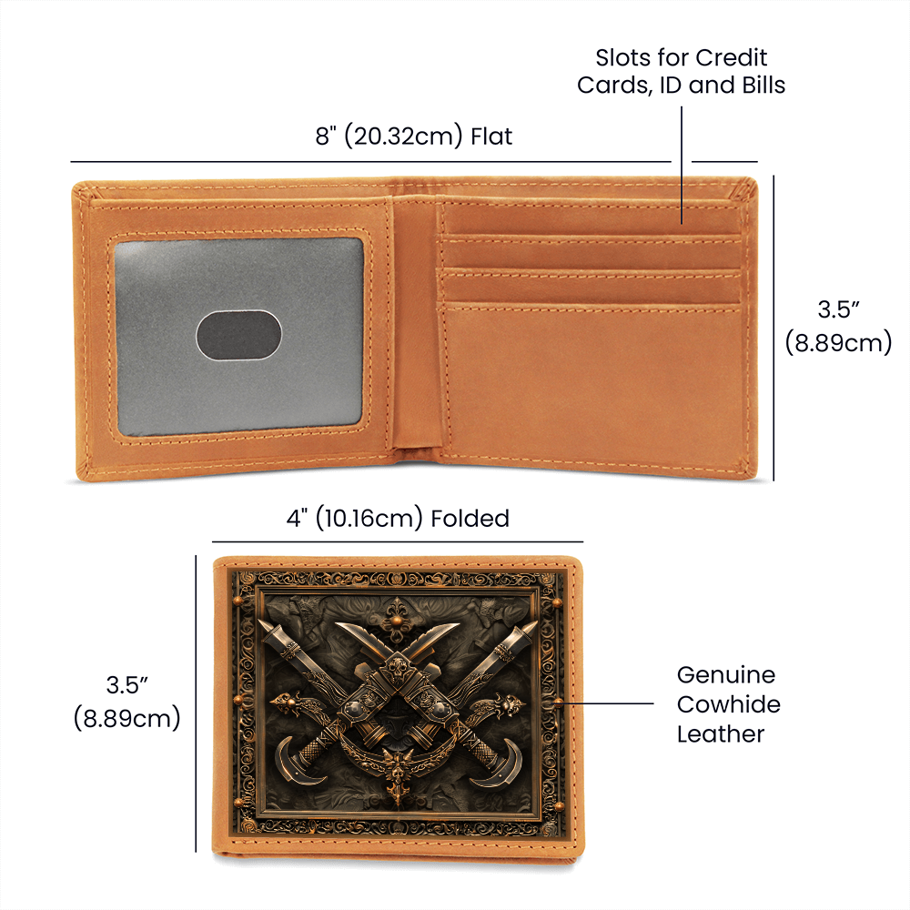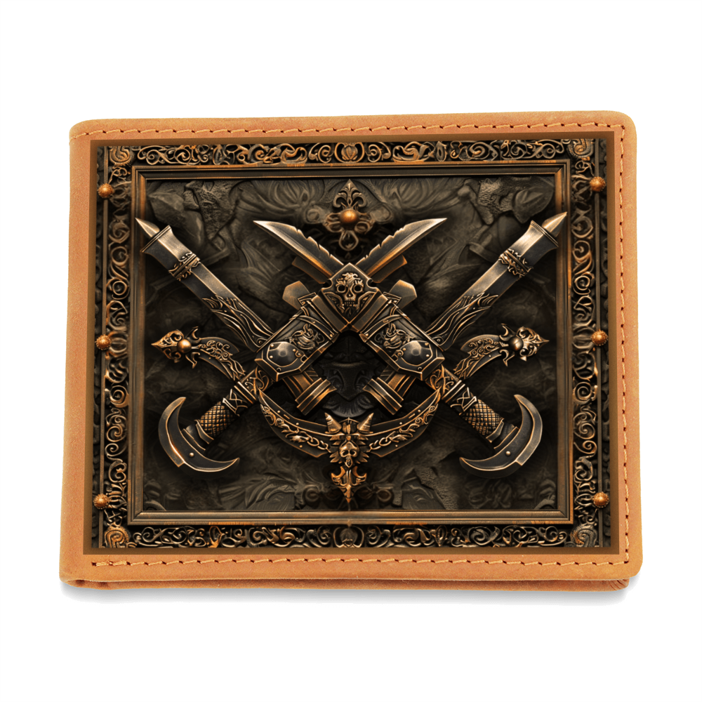 Step into the shadows of legend with the strength of the dagger. This embossed-look leather wallet from the Armory Collection features crossed daggers framed by intricate detailing, symbolizing precision, cunning, and the courage of warriors past. A bold design perfect for those who value medieval artistry in everyday life.
