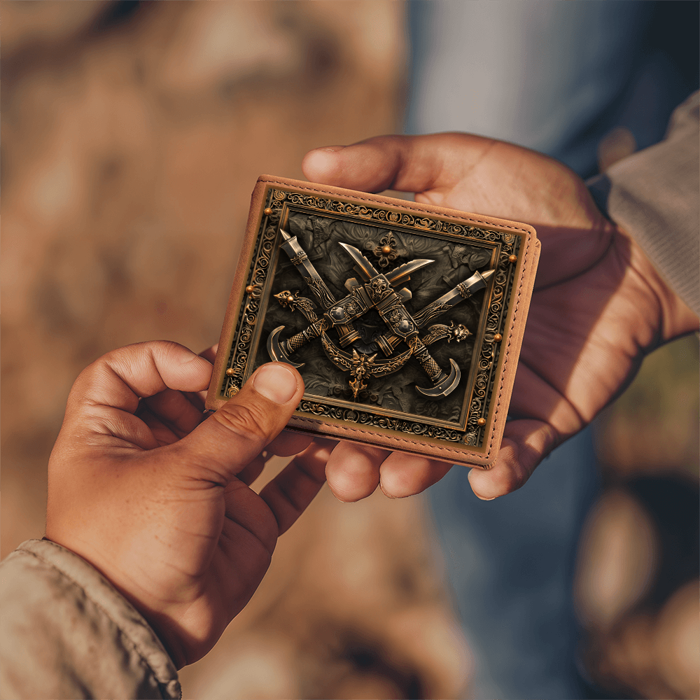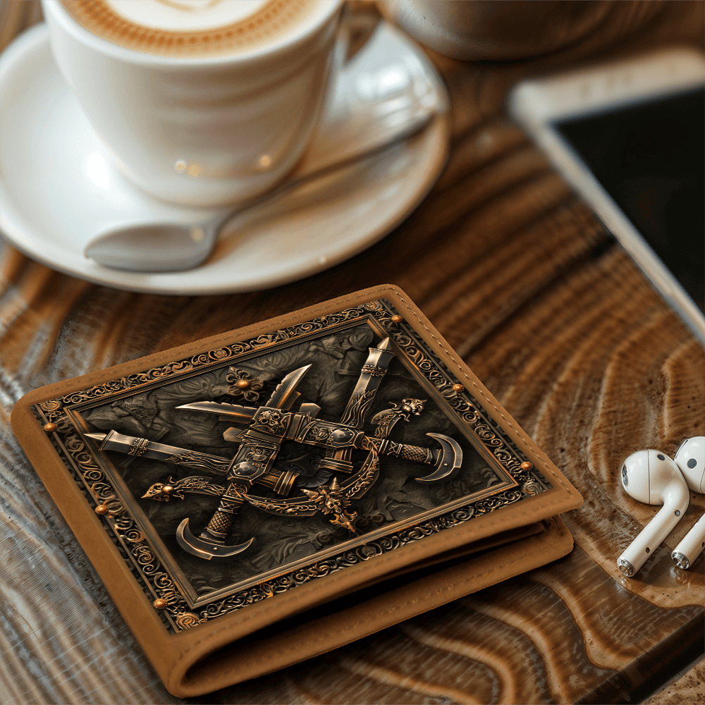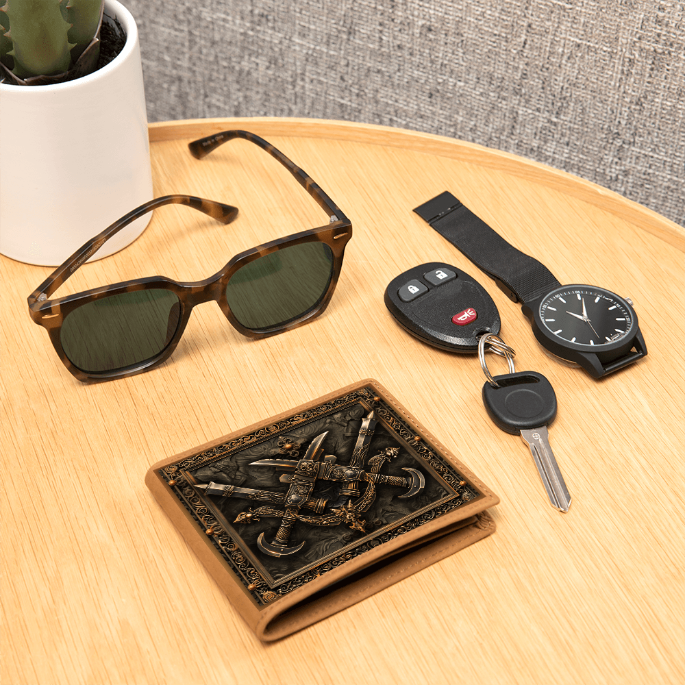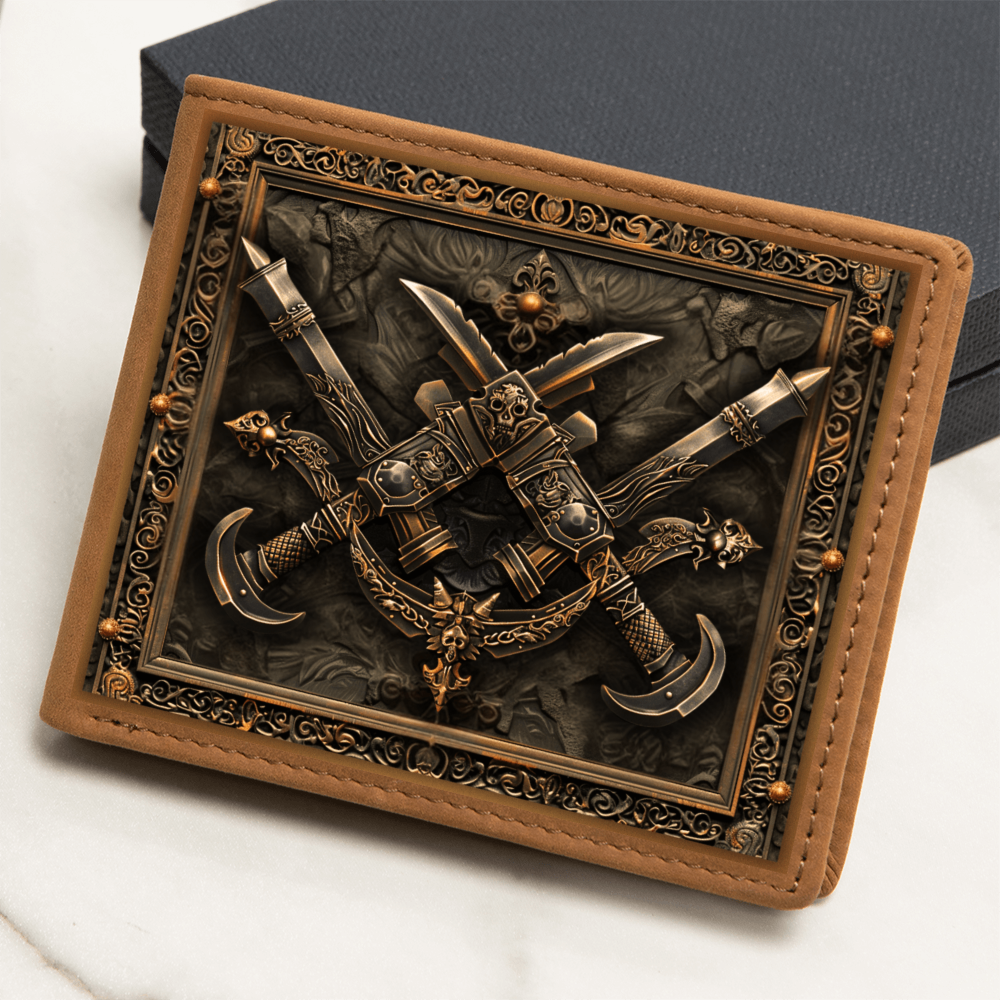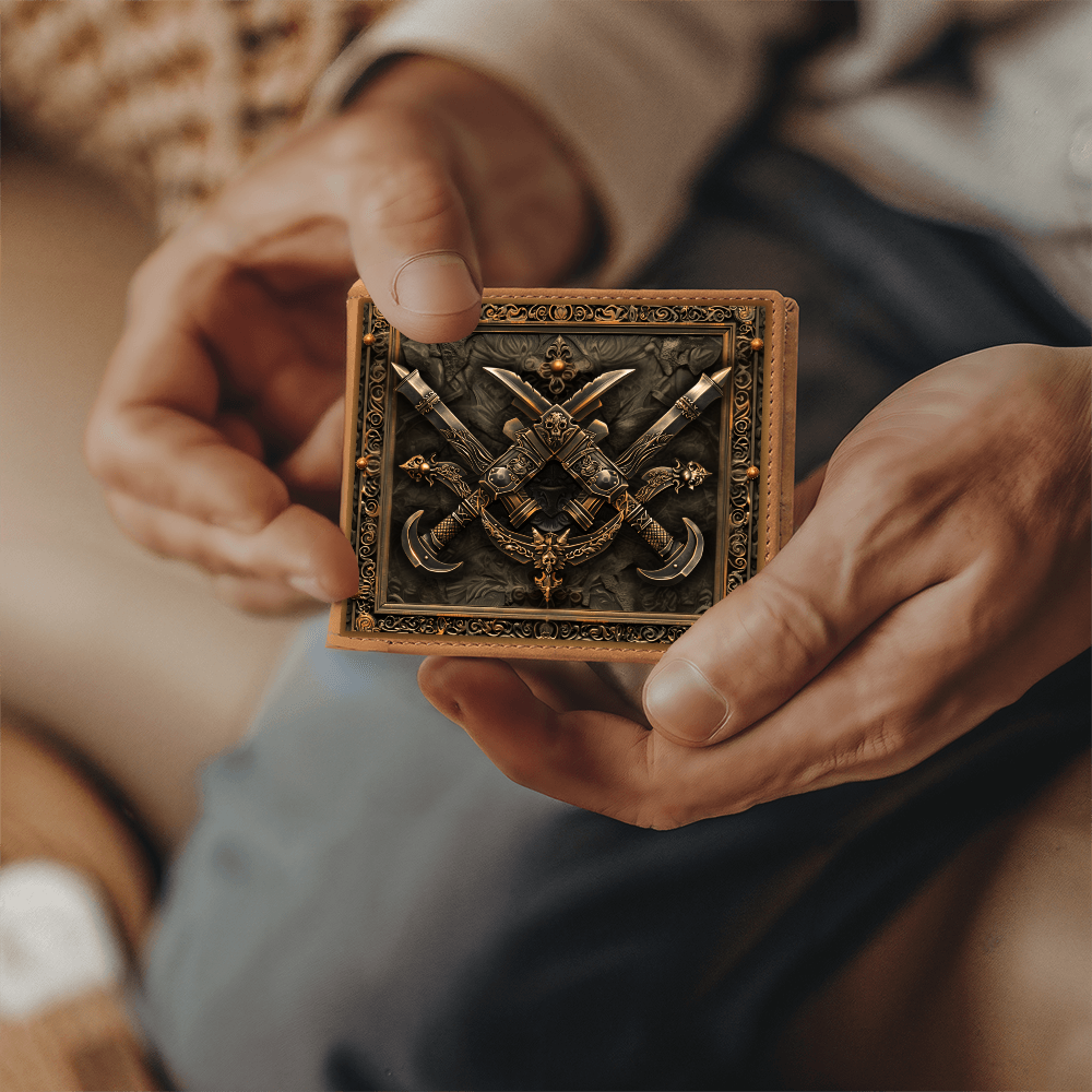 Step into the shadows of legend with the strength of the dagger. This embossed-look leather wallet from the Armory Collection features crossed daggers framed by intricate detailing, symbolizing precision, cunning, and the courage of warriors past. A bold design perfect for those who value medieval artistry in everyday life.
