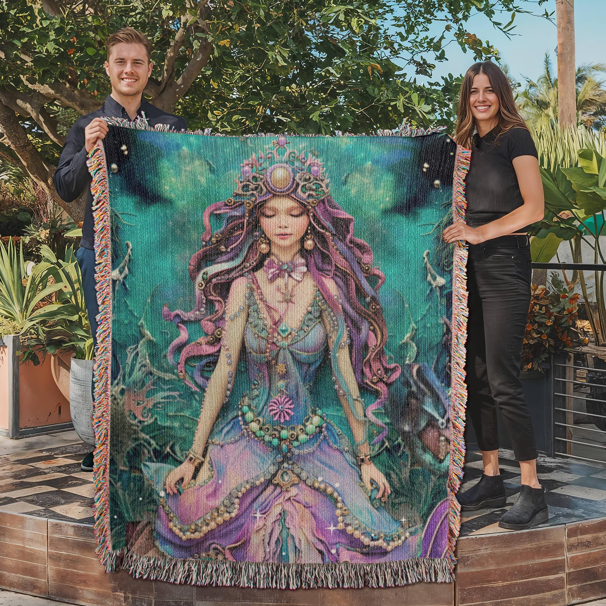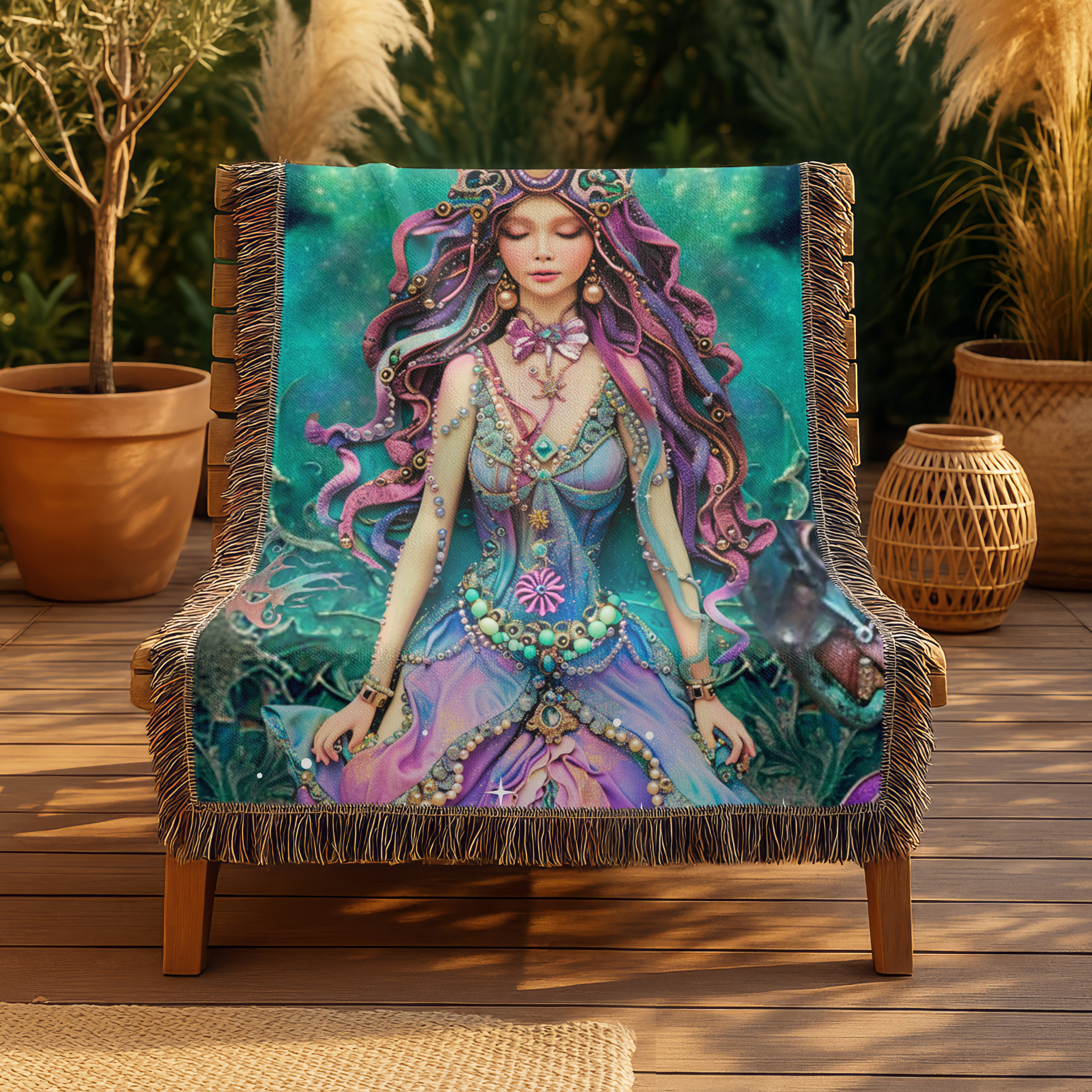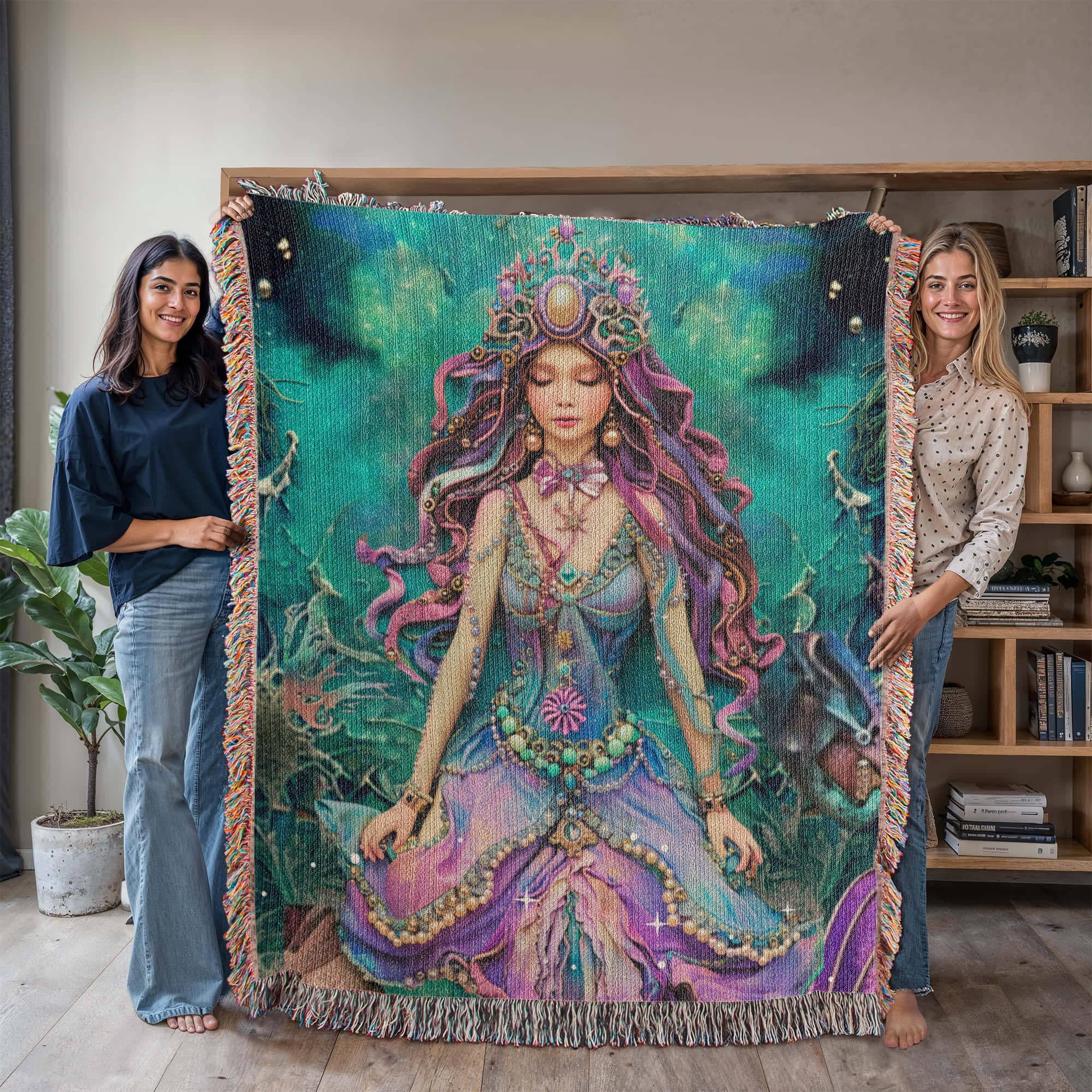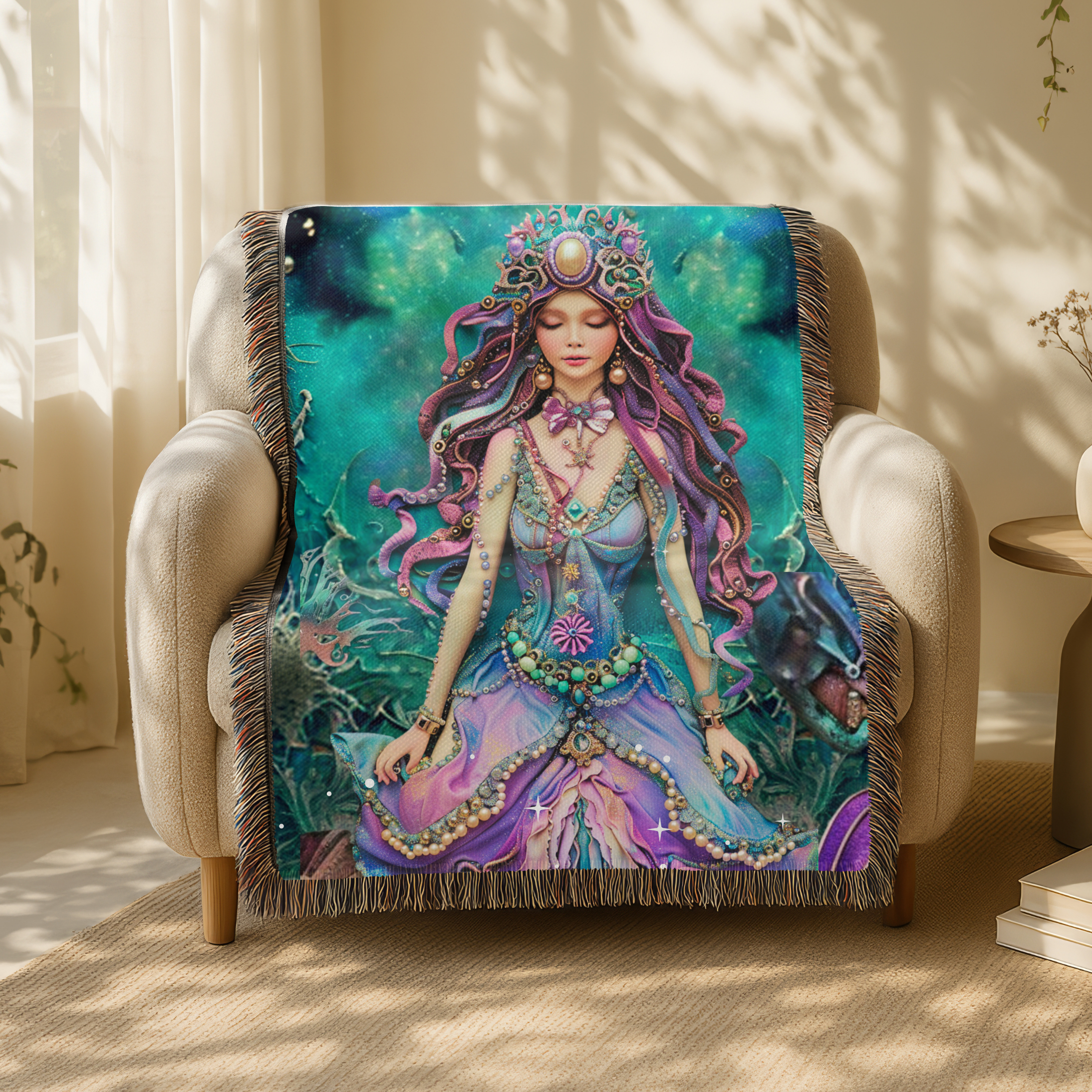Rendered in a captivating beaded-look woven design, the artwork creates the illusion of intricate beadwork, metallic embellishments, and ornamental embroidery—without raised texture. Flowing hair, layered adornments, and jewel-toned details give this goddess a celestial presence, evoking ancient sea mythology while maintaining a smooth, flat printed surface.