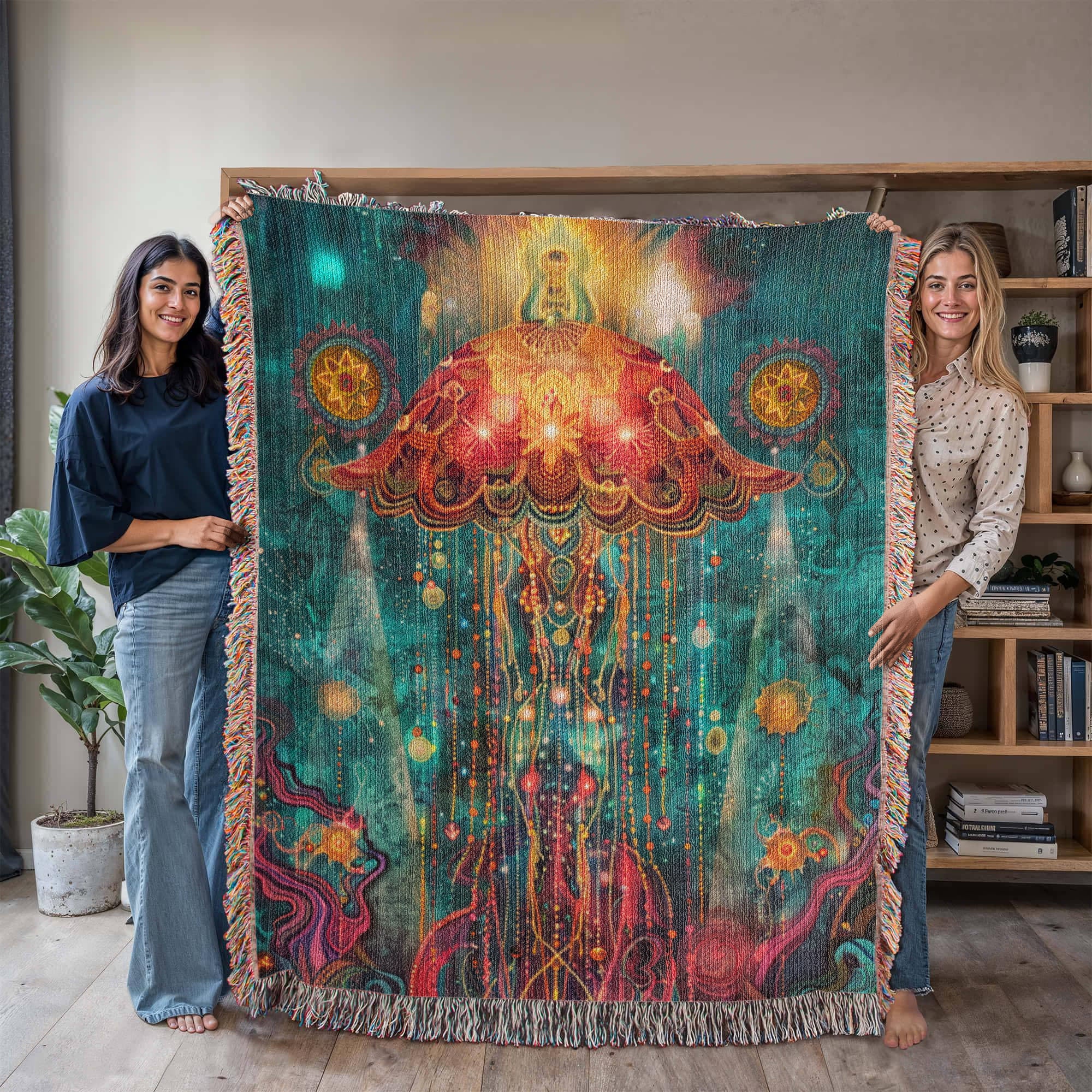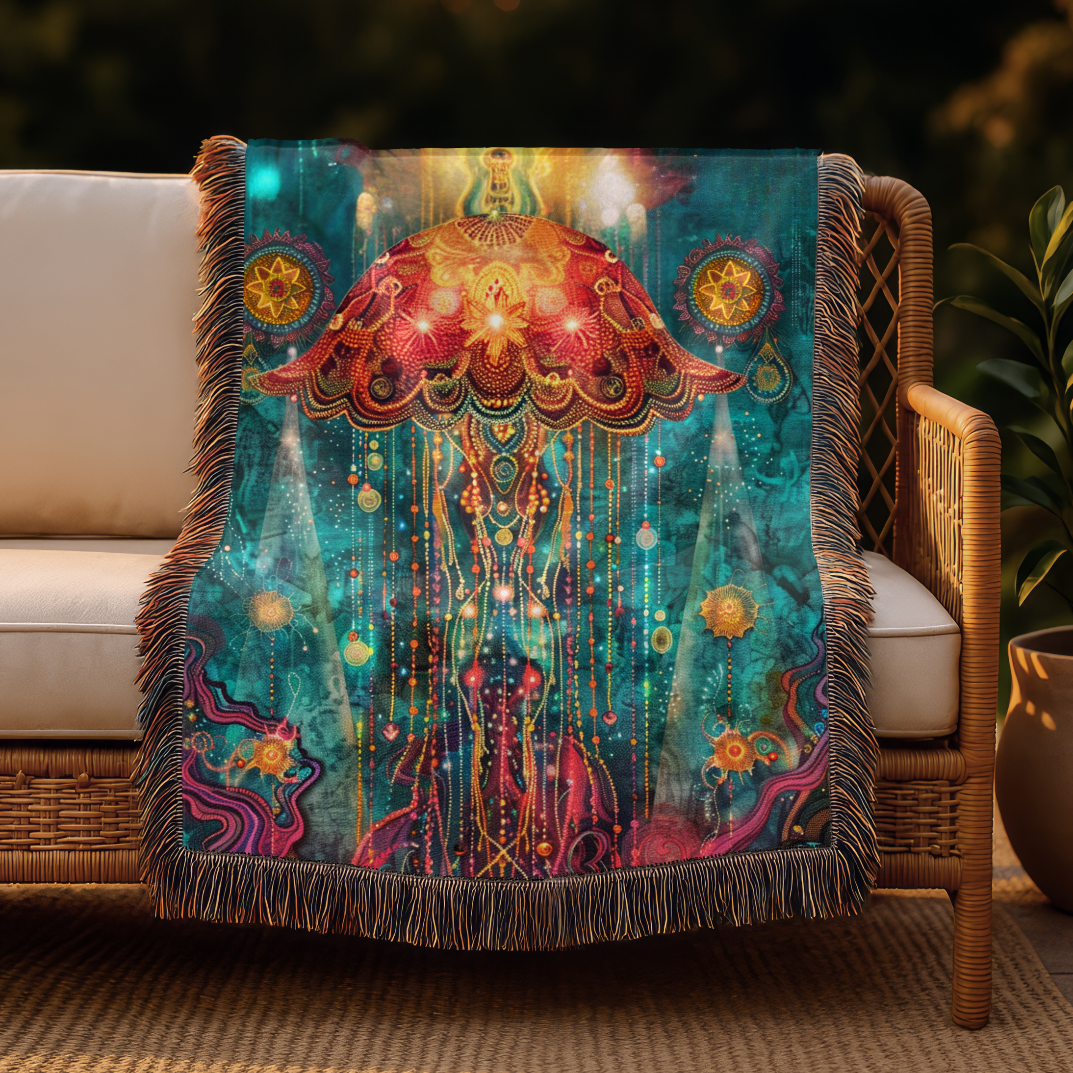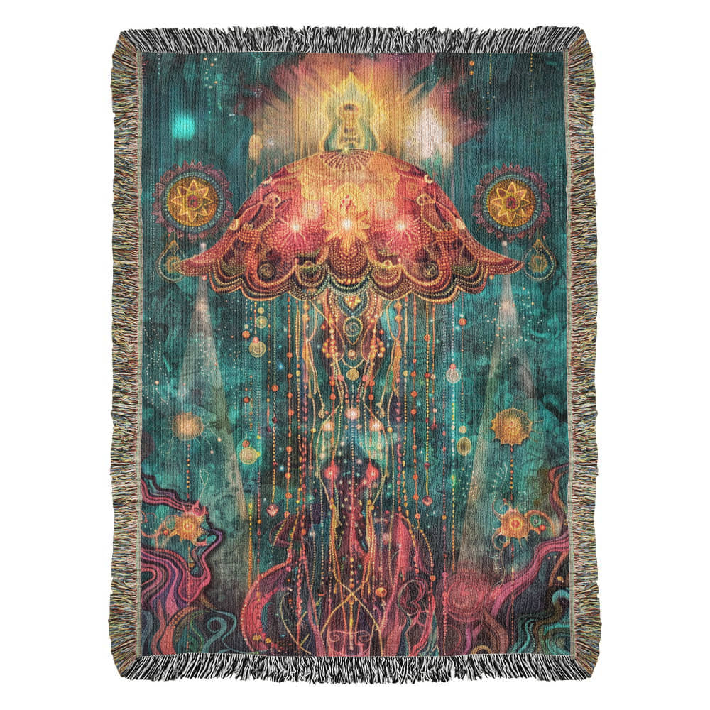 Drift into luminous ocean magic with this Beaded Look Jellyfish Blanket, featuring a radiant jellyfish guardian glowing beneath the sea like a living constellation. Cascading tendrils of light, sacred symbols, and celestial accents flow downward in a mesmerizing display, creating a sense of movement, serenity, and quiet power. Rich teal waters, warm amber highlights, and jewel-toned details combine to form a design that feels both ethereal and grounding.