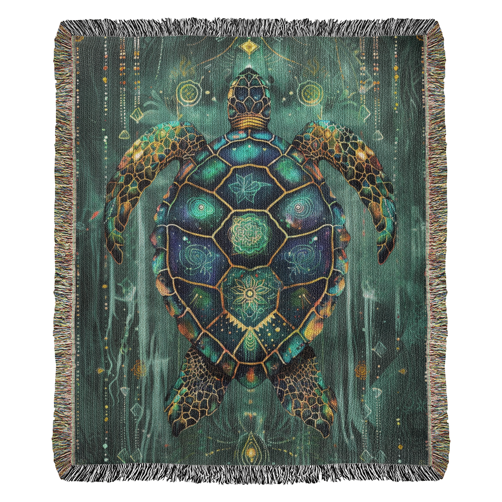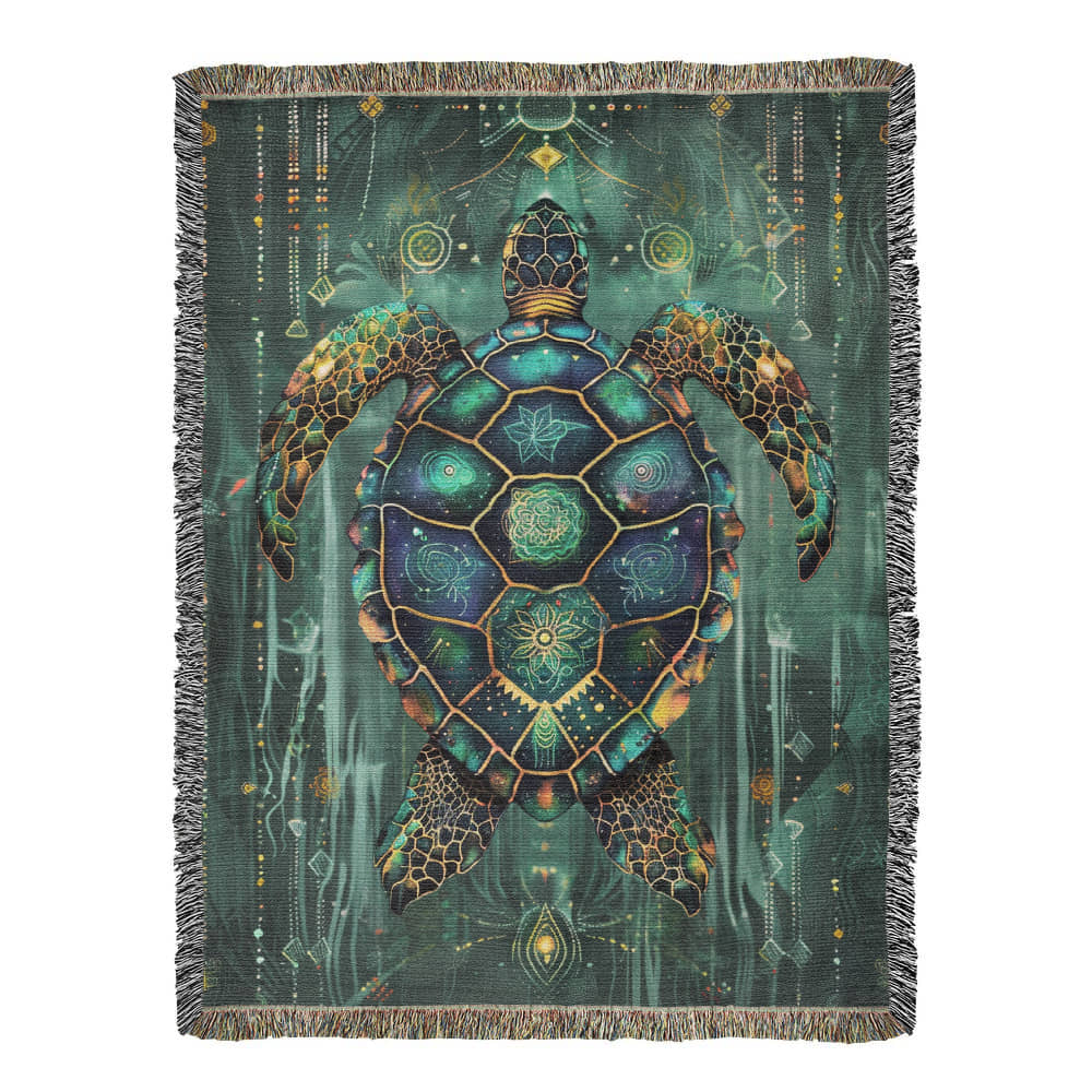 Wrap yourself in ancient ocean wisdom with this Beaded Look Sea Turtle Guardian Blanket, inspired by the symbolism of protection, endurance, and sacred passage. The design features a luminous sea turtle rising through a glowing portal of light, surrounded by ethereal currents and celestial accents — each detail woven to create the illusion of intricate beadwork and artistry. Deep jewel tones of emerald, teal, and sapphire blend into a mystical underwater realm, bringing depth, calm, and quiet strength to any space.