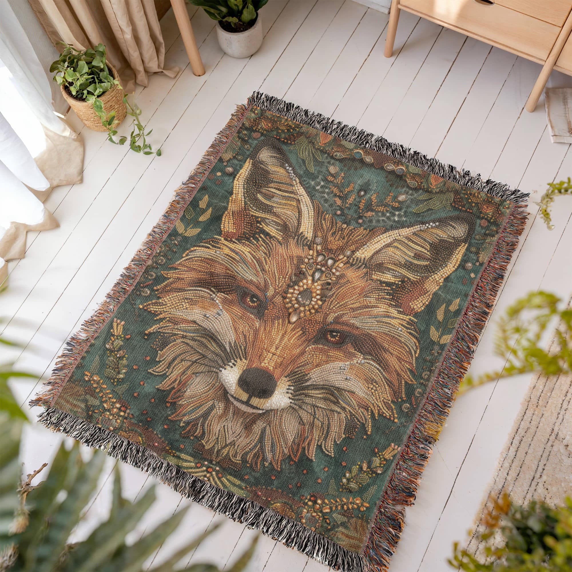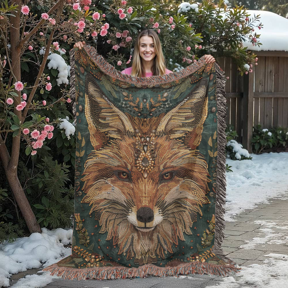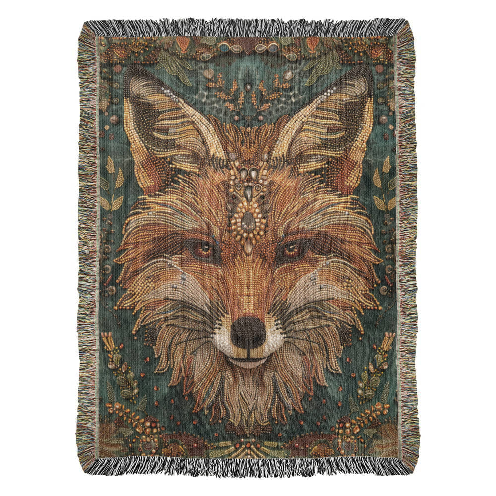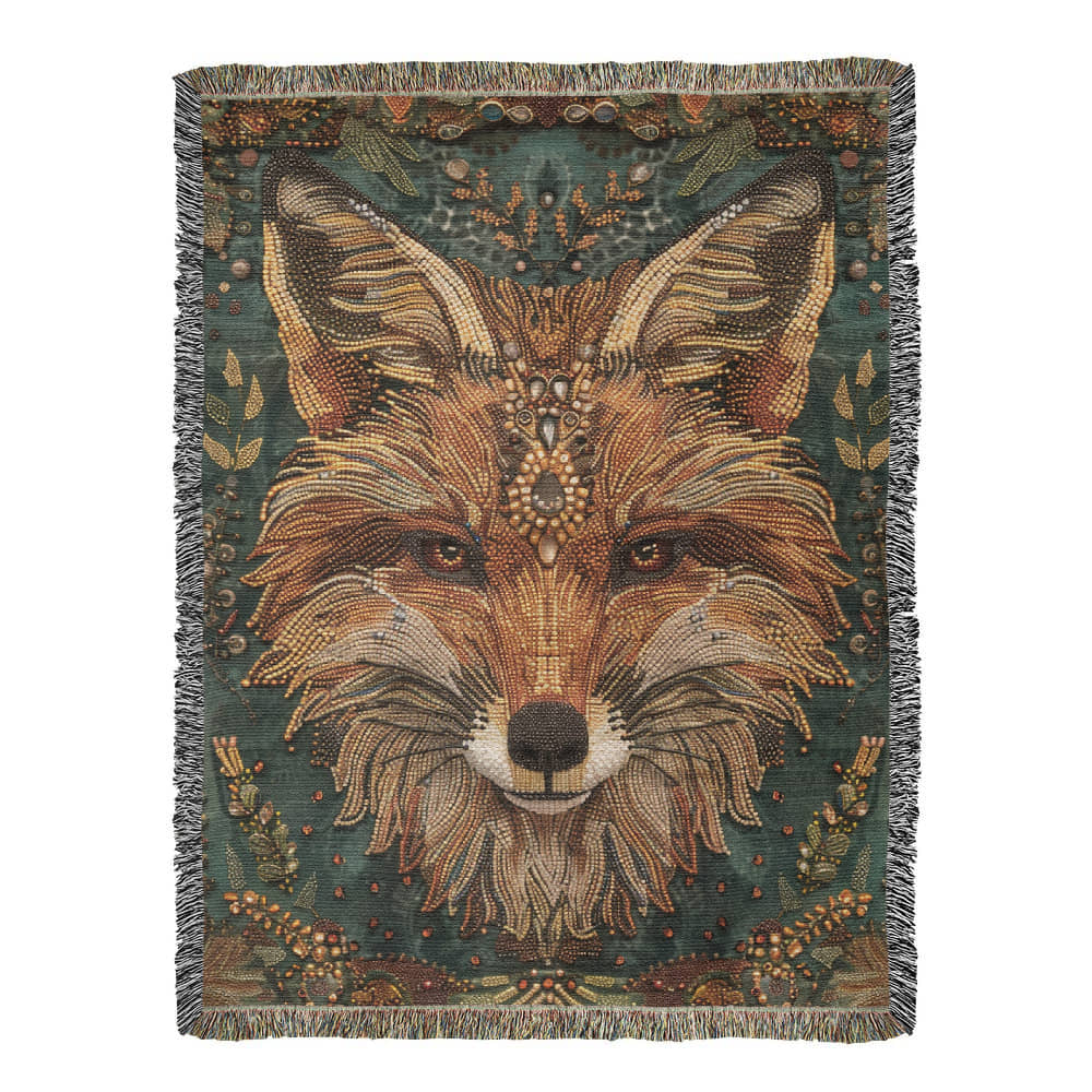 🧡 Bring home the mystique of the wild with this intricately beaded fox design woven blanket. Adorned with detailed beadwork-style accents and earthy autumn tones, this stunning throw adds warmth and artistry to any space. The rich forest green background enhances the fox's wise, centered gazeβ€”perfect for cozy evenings or rustic wall display.