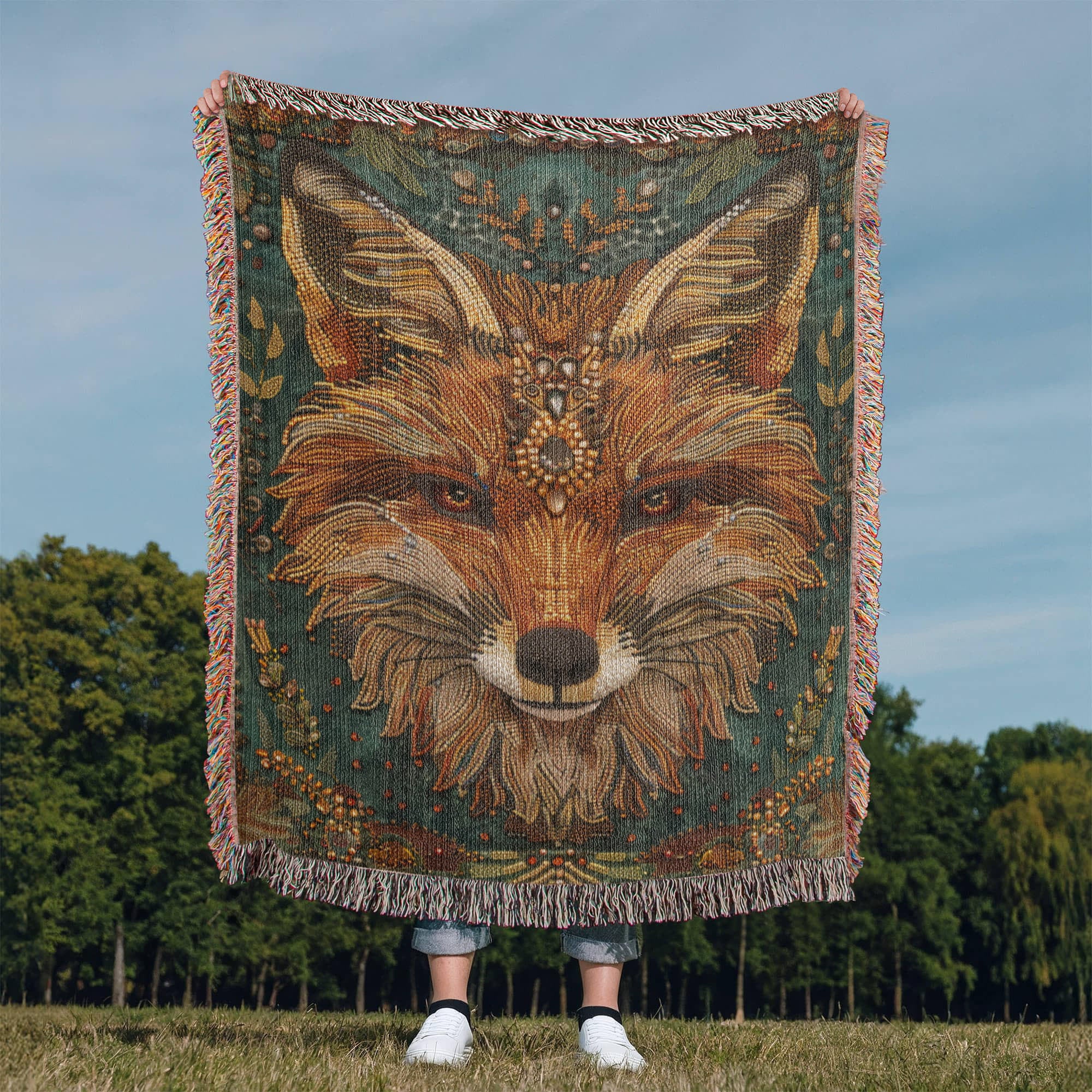Boho Beaded Fox Blanket – Intricate Woven Art with Forest Green Background | Rustic Animal Decor Throw