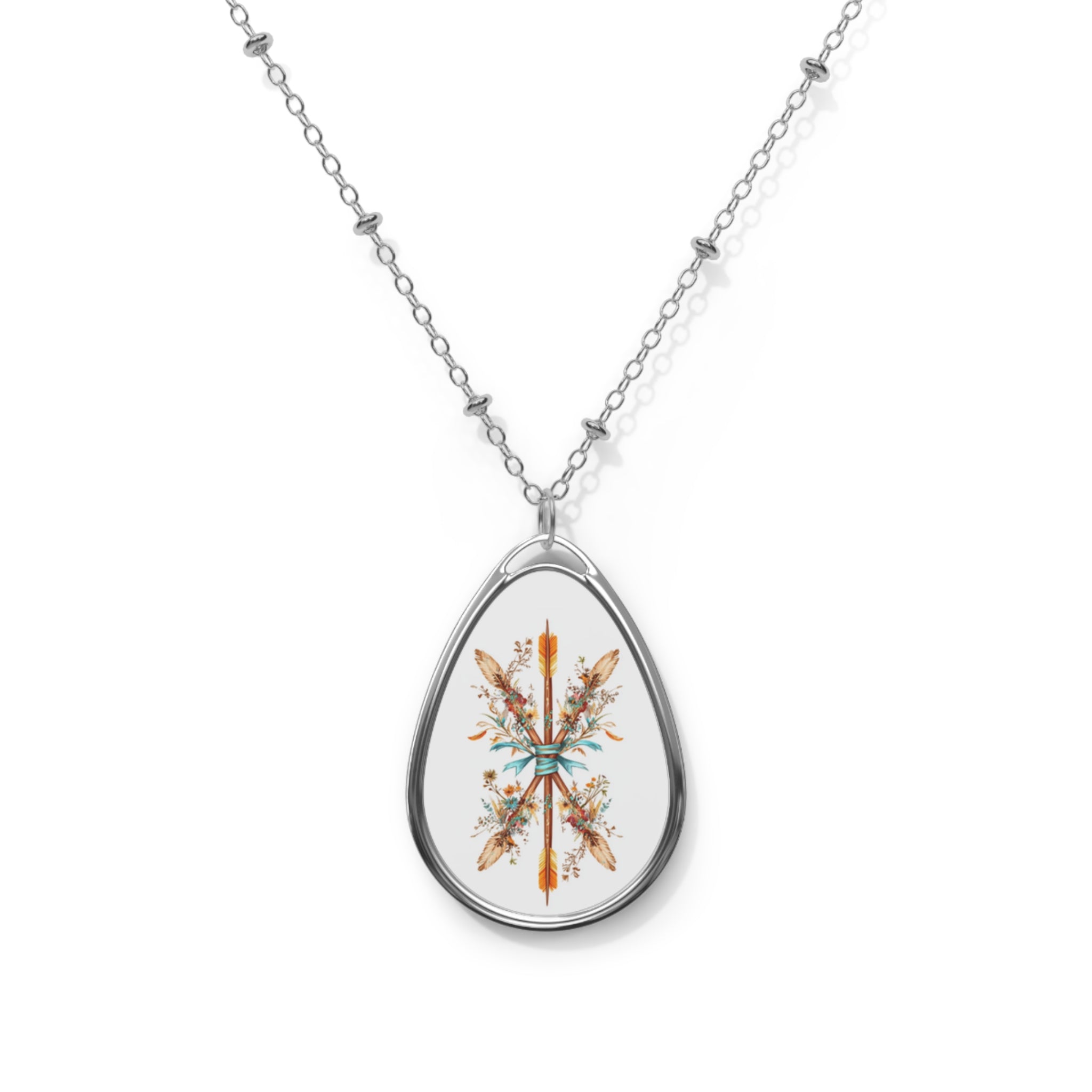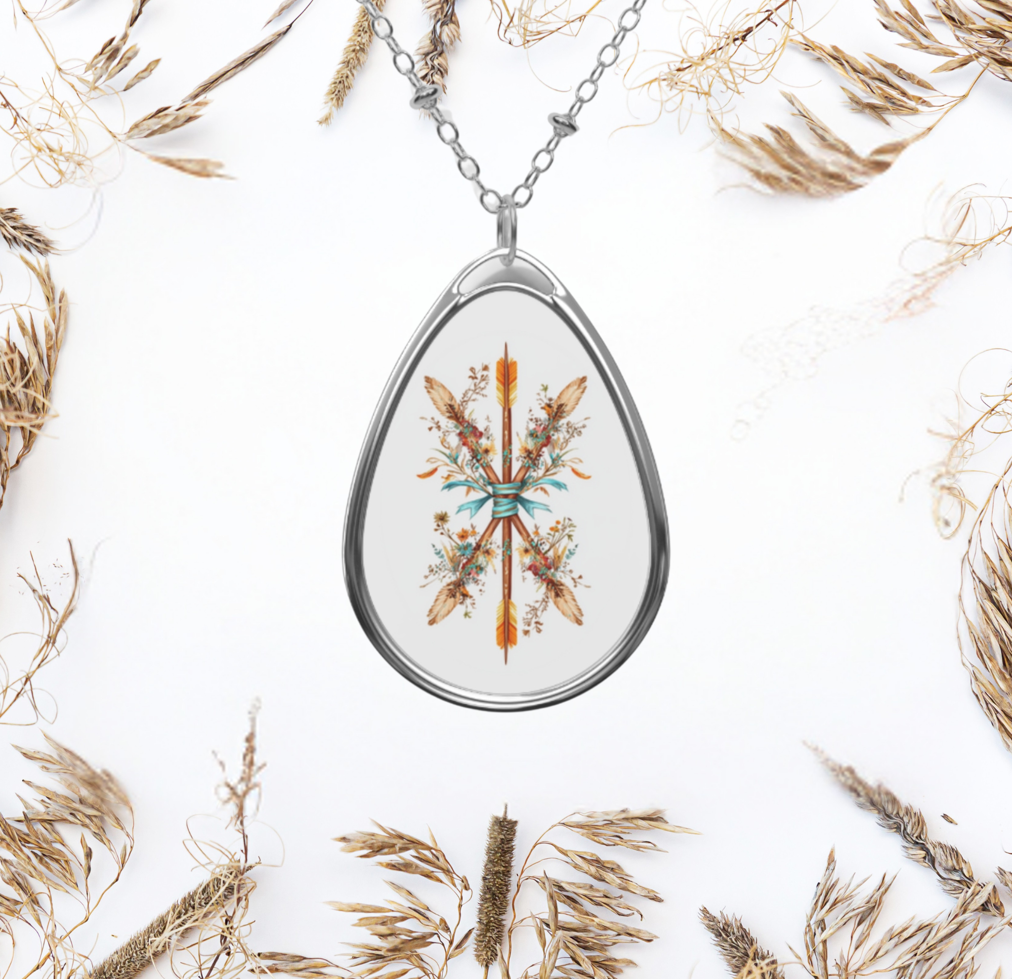 Honor your inner wanderer with this Boho Crossed Arrows Teardrop Necklace, a beautifully symbolic piece that channels strength, direction, and natural harmony. The delicate design features two rustic arrows crossed at center, surrounded by blooming wildflowers and soft feather accents — all printed within a glossy teardrop frame.