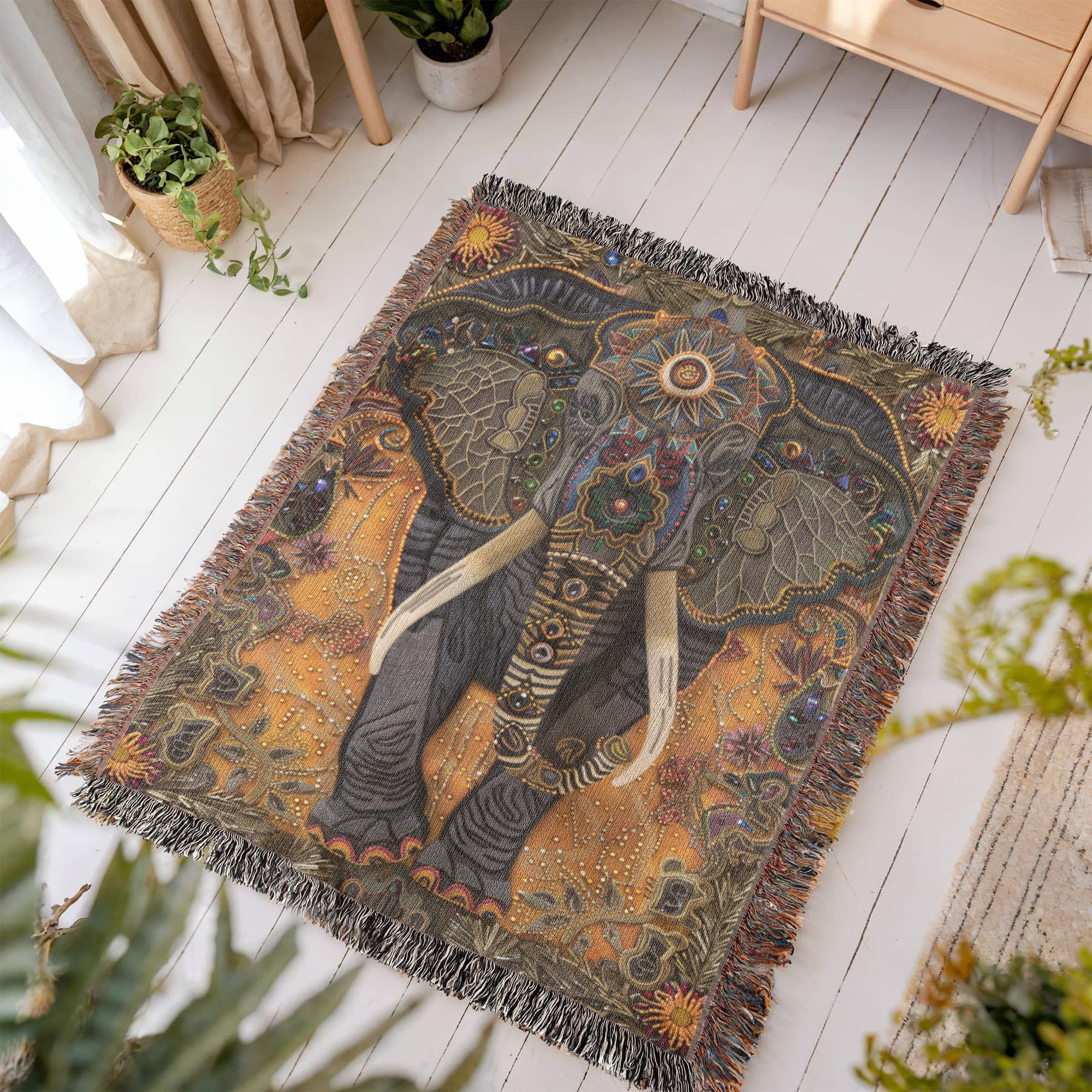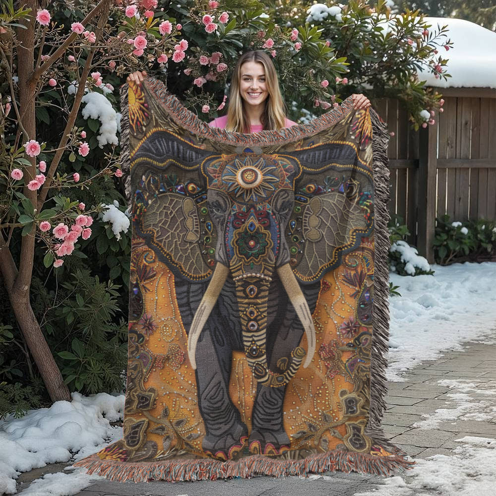 Beaded Look Elephant Blanket – Boho-Inspired Woven Throw | Tribal Floral Art by Lace & Grit