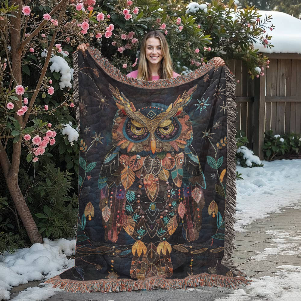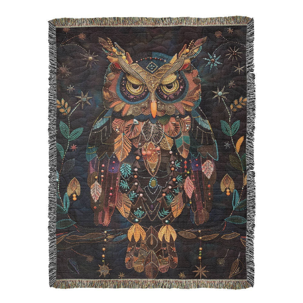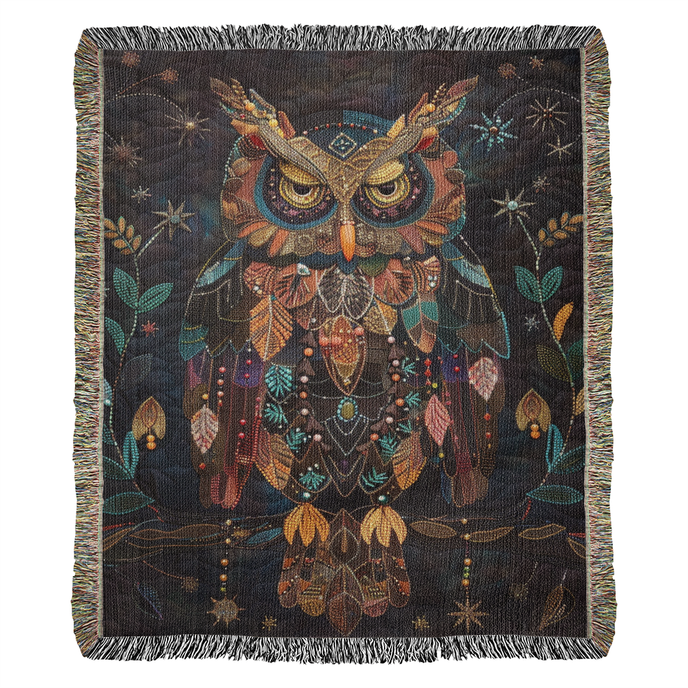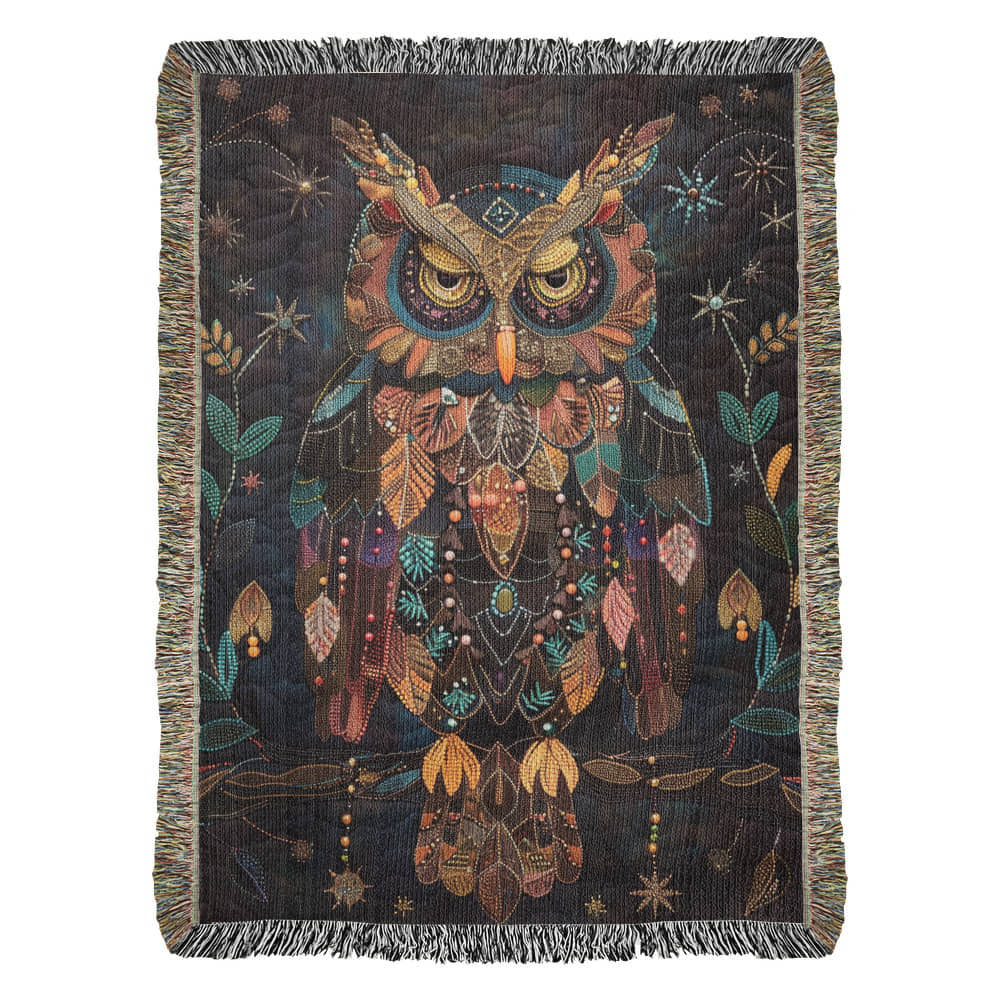 Boho Owl Woven Blanket – Beaded Look Design with Celestial Forest Accents