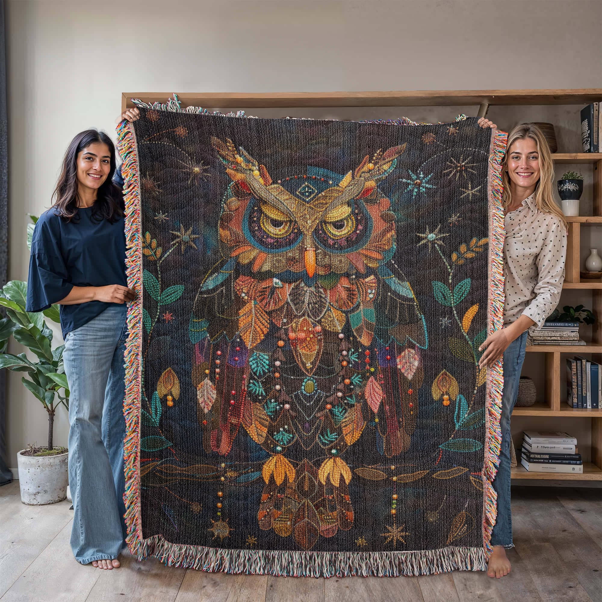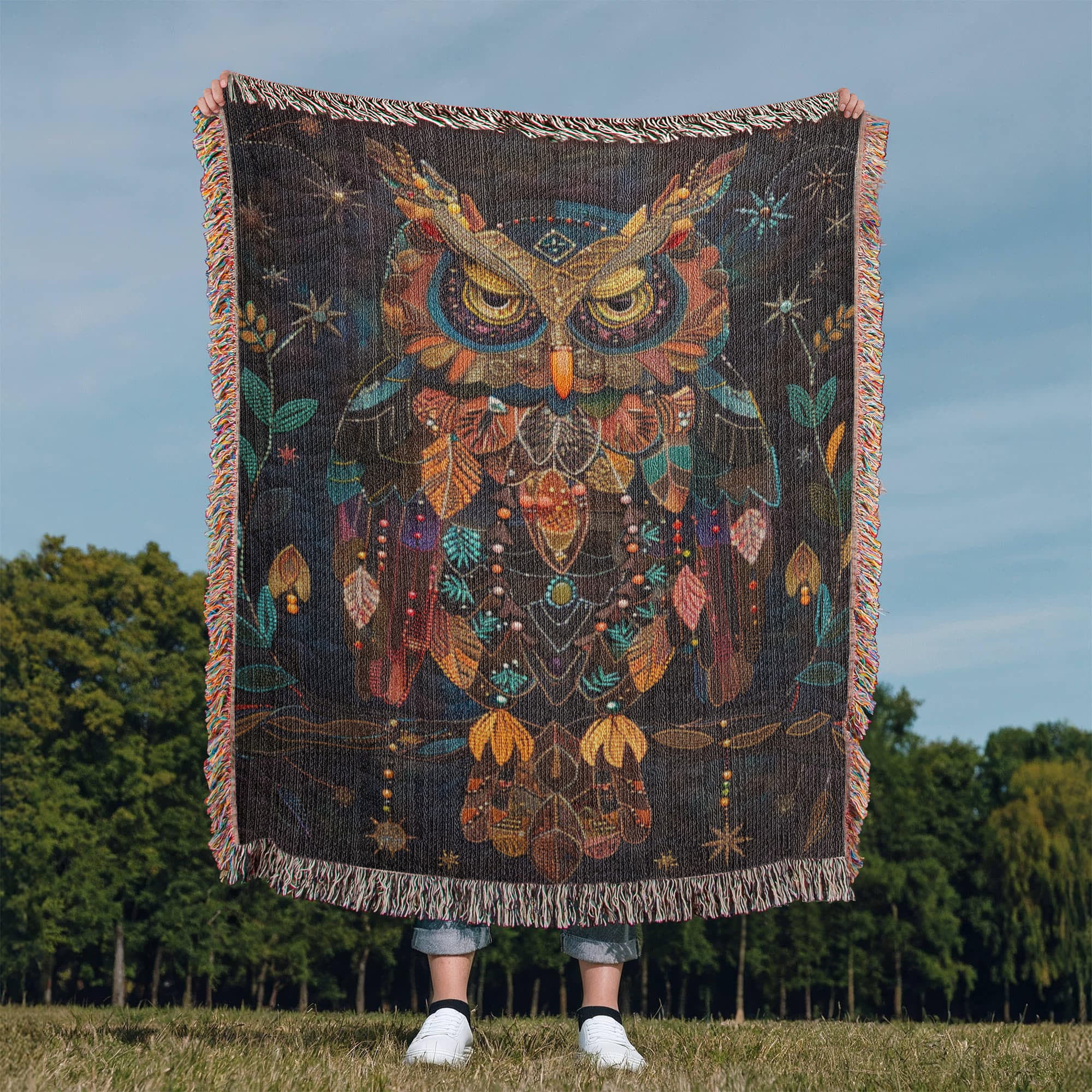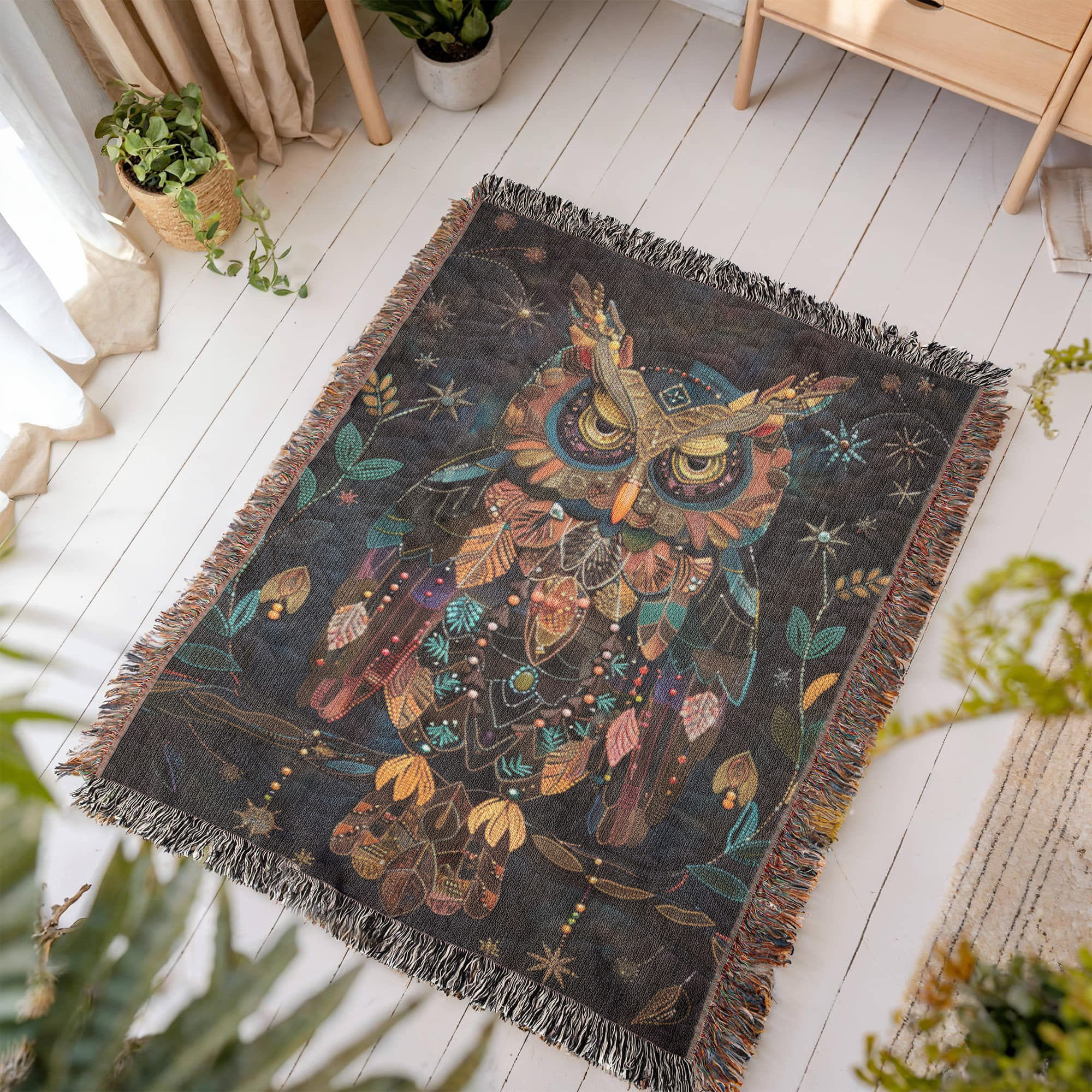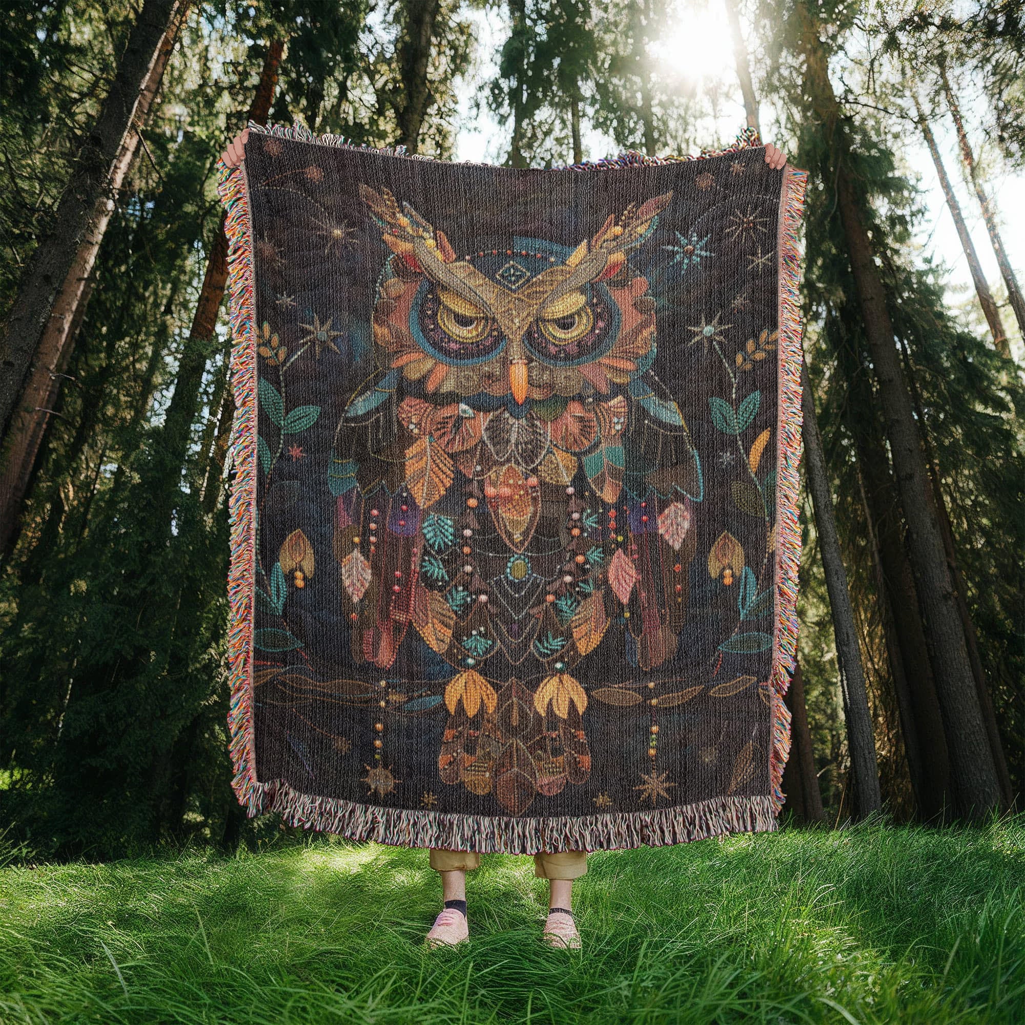 Boho Owl Woven Blanket – Beaded Look Design with Celestial Forest Accents