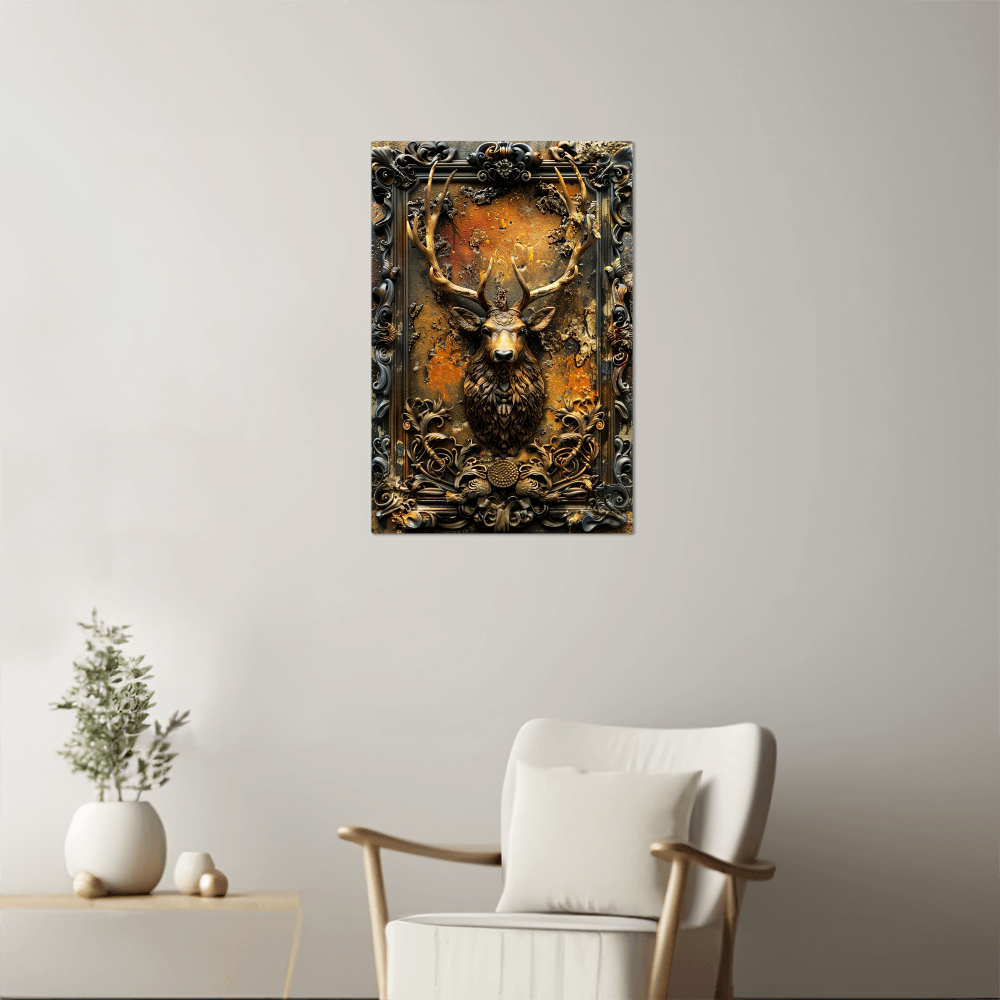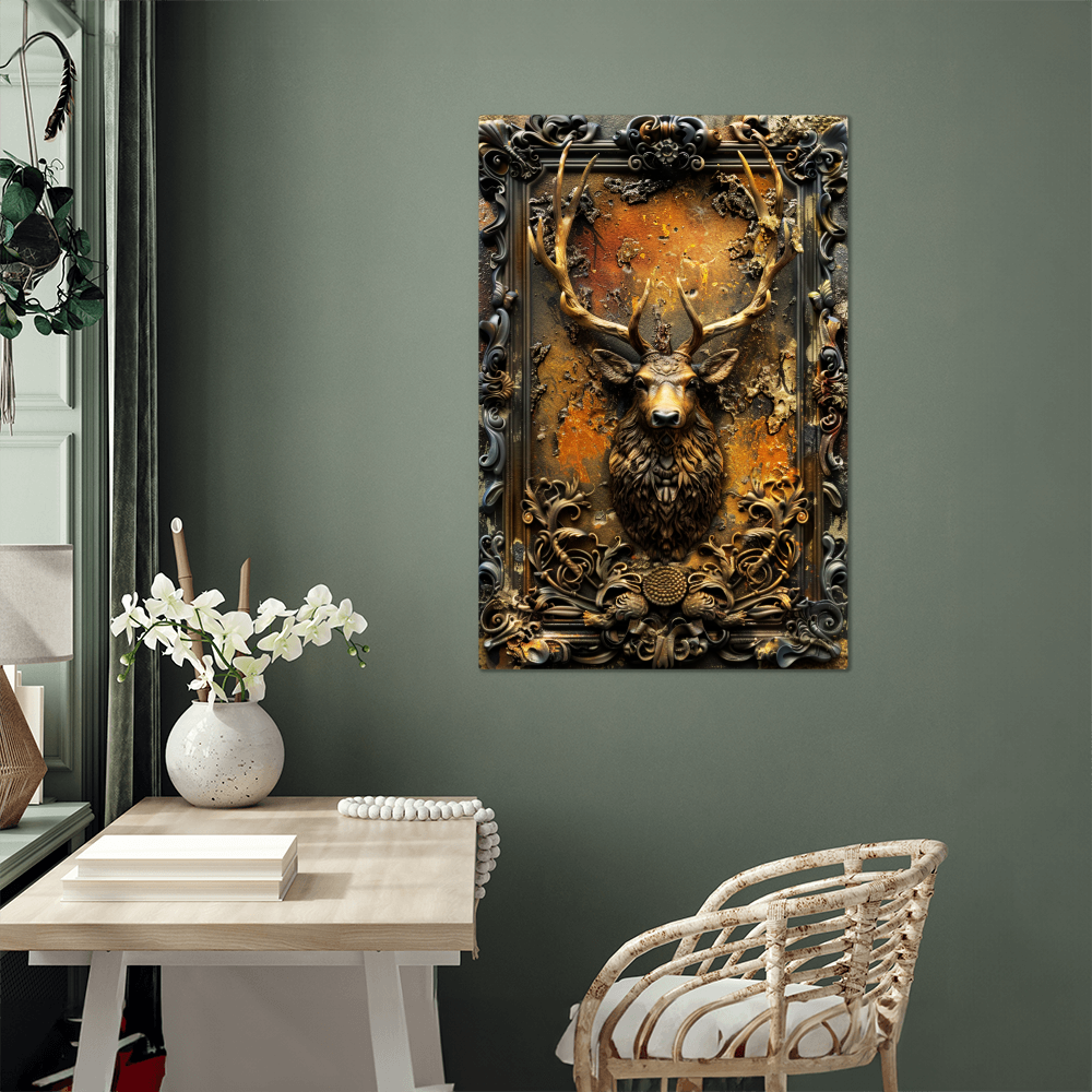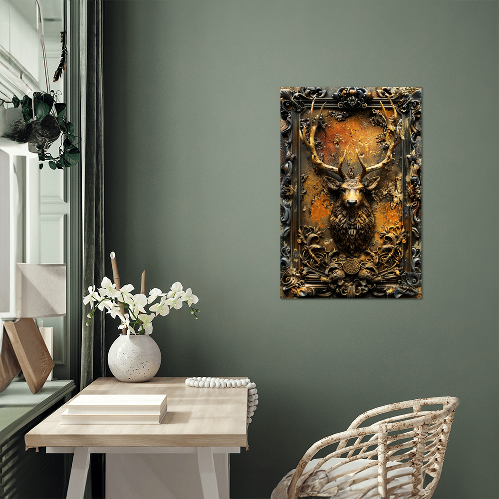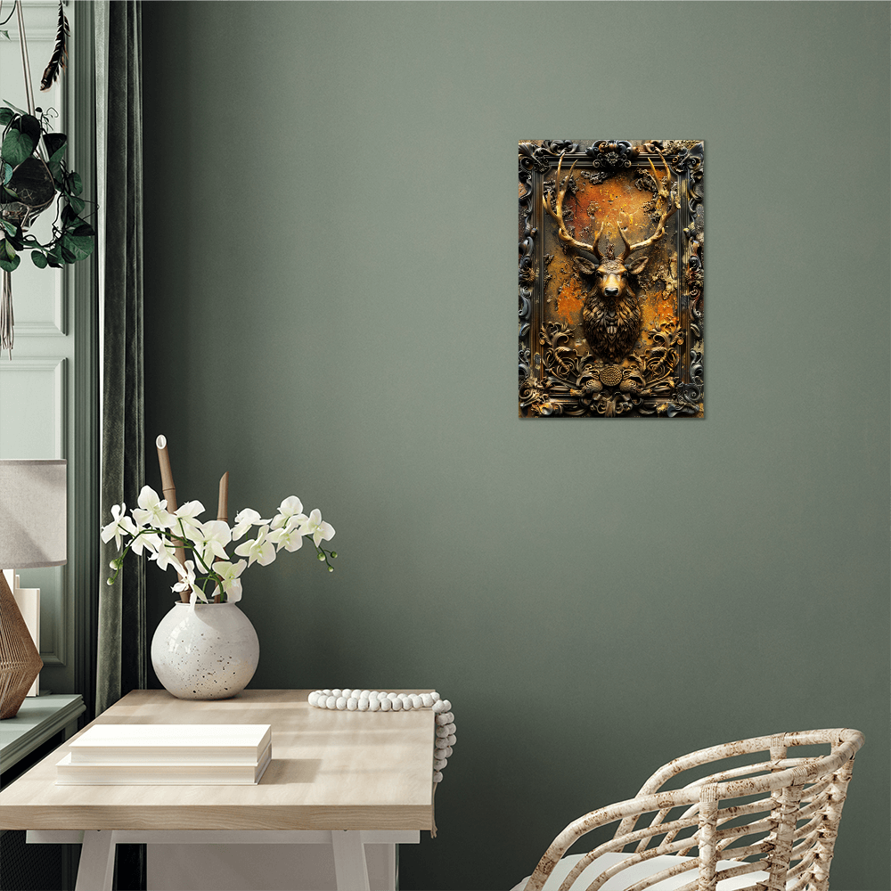 Meet *Caelthorn*: A divine sentinel captured in a high-gloss metal print. Rendered with intricate antlers and framed in ancient elegance, he looks chiseled from bronze and bark — but this is a **flat, high-resolution print** that mimics the illusion of embossed metal through texture, light, and depth.
