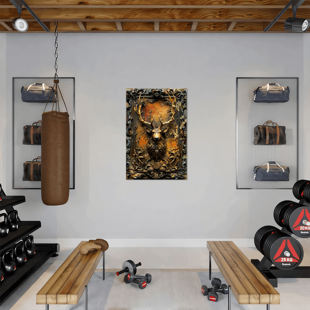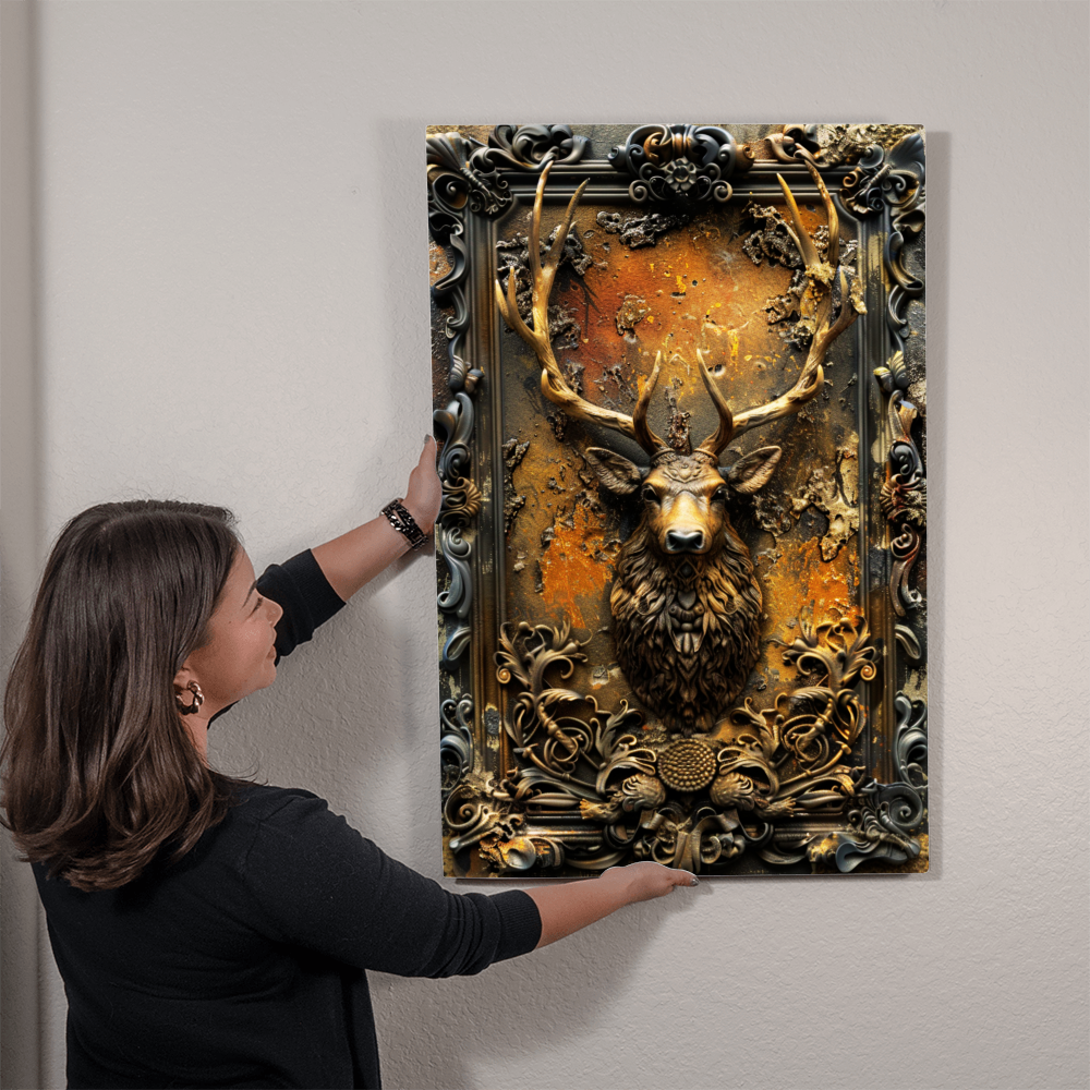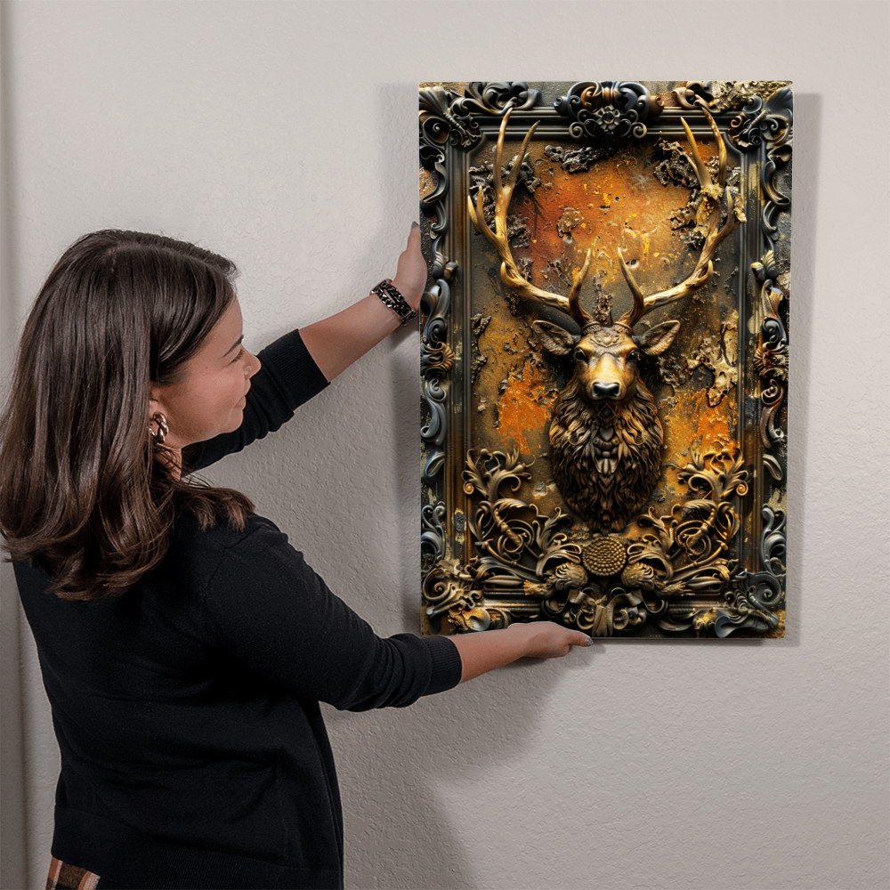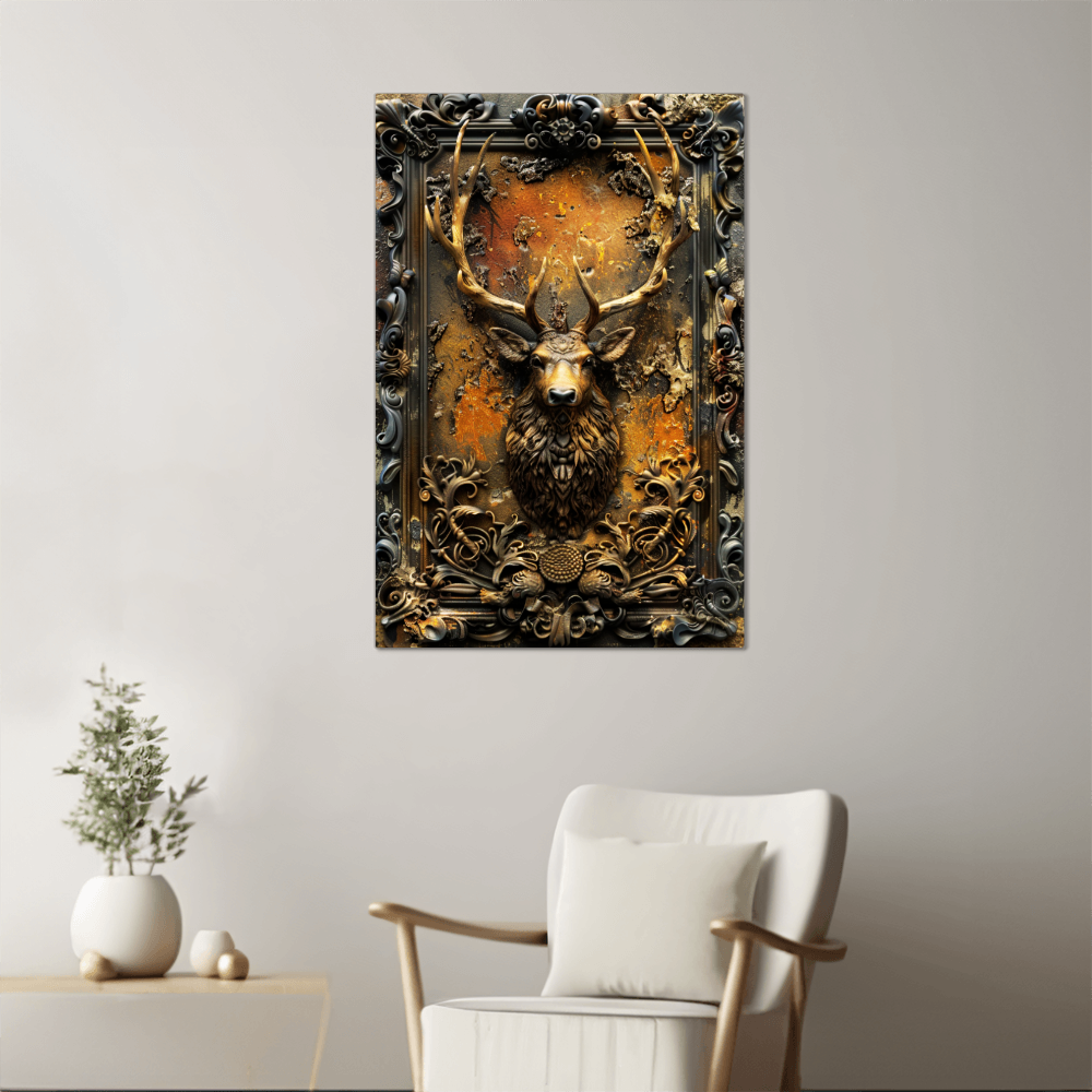 Meet *Caelthorn*: A divine sentinel captured in a high-gloss metal print. Rendered with intricate antlers and framed in ancient elegance, he looks chiseled from bronze and bark — but this is a **flat, high-resolution print** that mimics the illusion of embossed metal through texture, light, and depth.