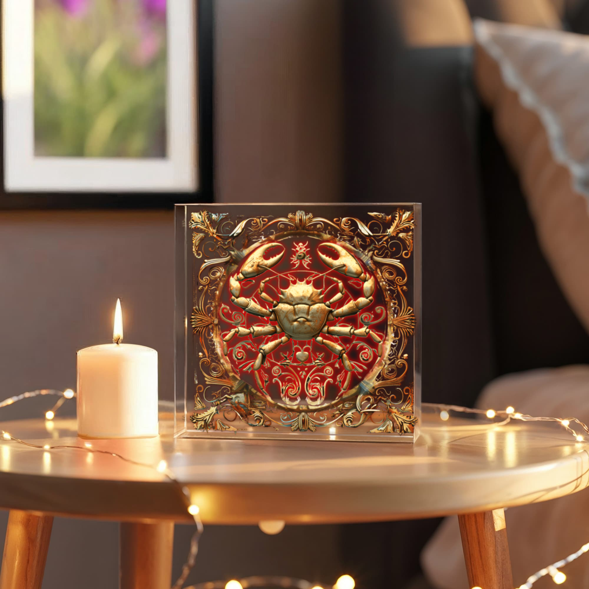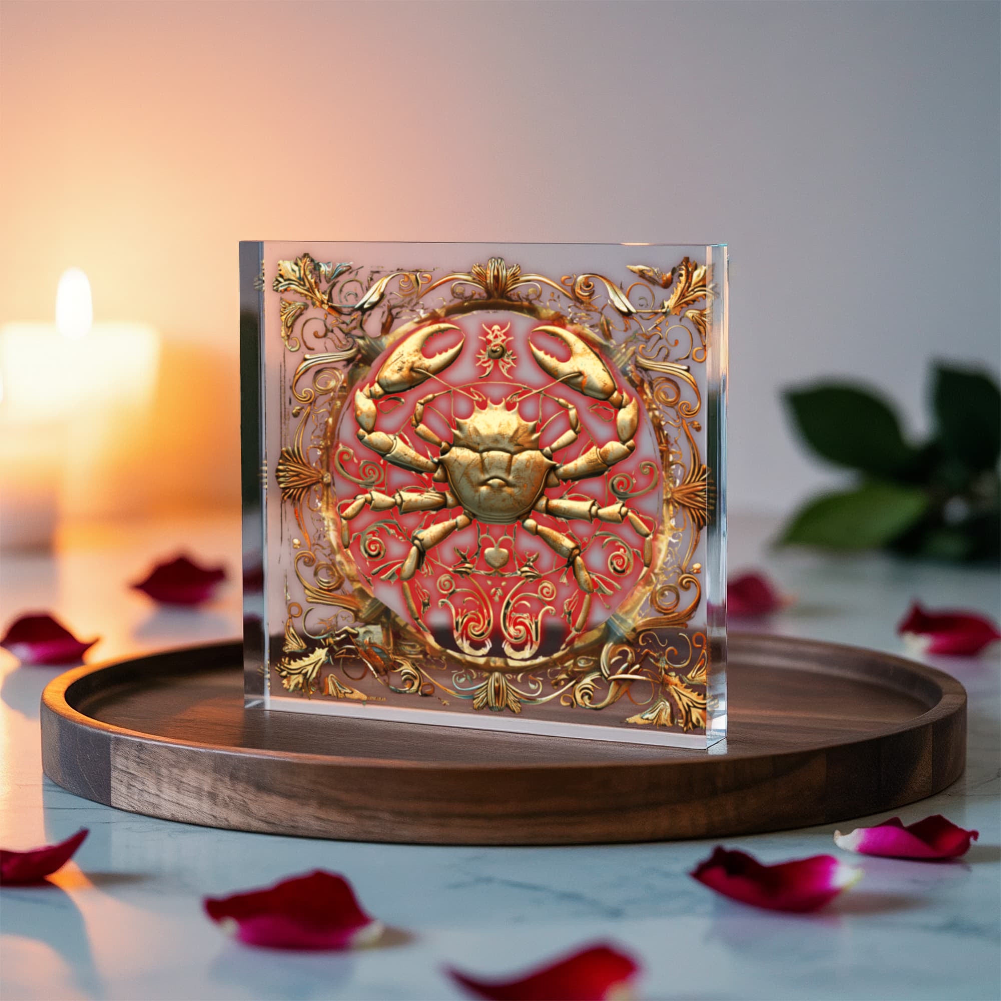 Honor the nurturing energy of Cancer with this radiant Zodiac Art Block. Featuring an intricately detailed crab framed by ornate filigree and floral scrollwork, this design embodies Cancer’s deep emotional strength and intuitive nature. The warm copper and gold tones glow against a rich background, creating the illusion of embossed metal that adds warmth and soul to any space.