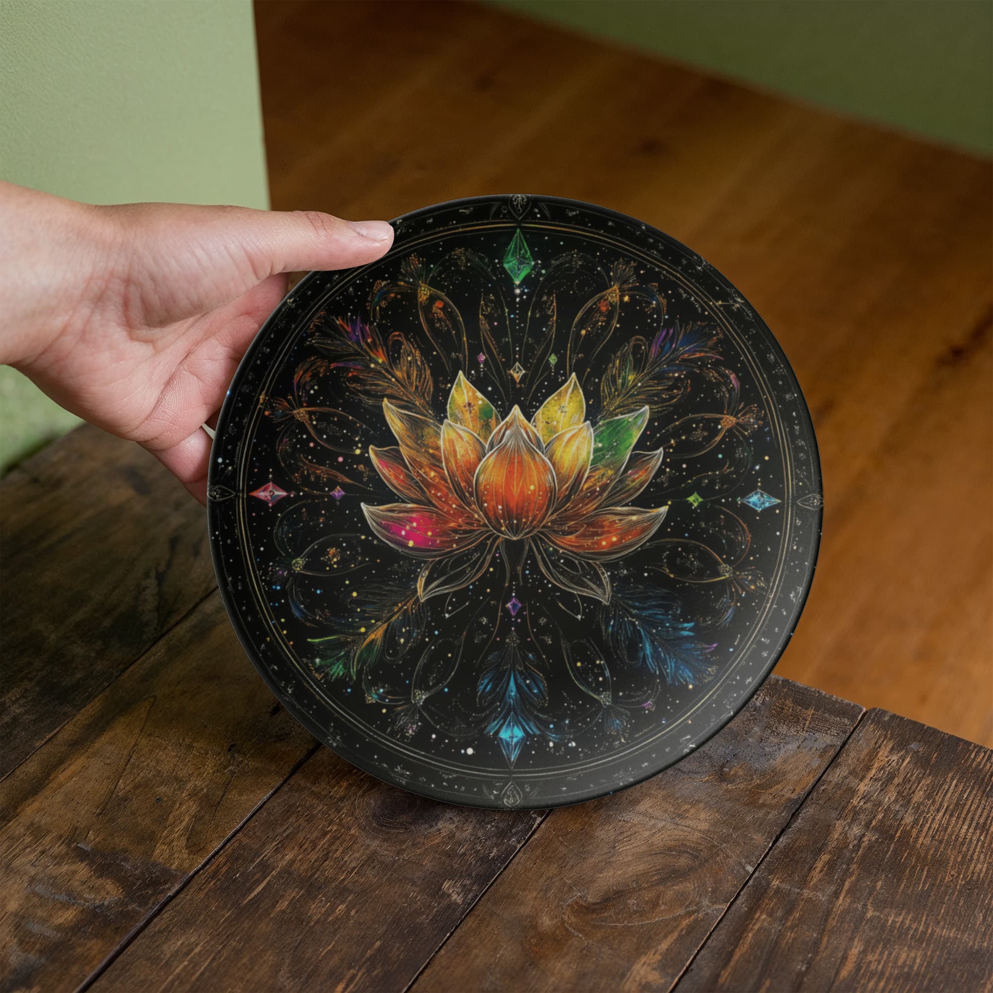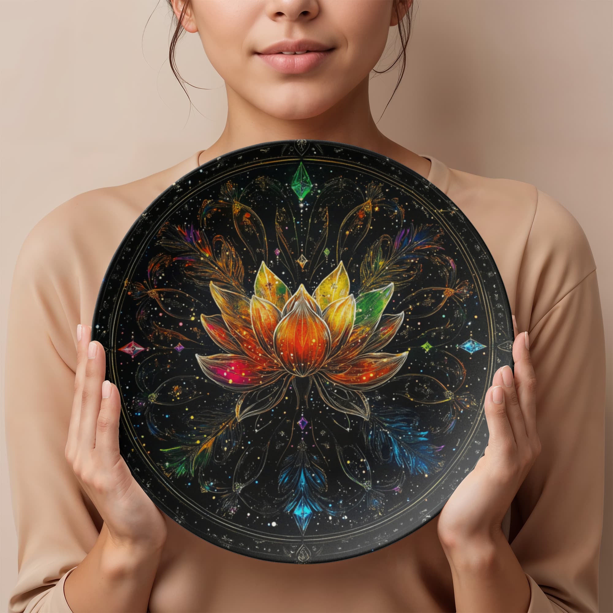 This vibrant plate features a rainbow lotus in full bloom, surrounded by intricate golden filigree and cosmic stardust. Each petal glows with energetic hues, capturing the beauty of transformation, spiritual alignment, and divine light. A stunning piece for altars, sacred spaces, or any setting that honors growth, color, and cosmic flow.