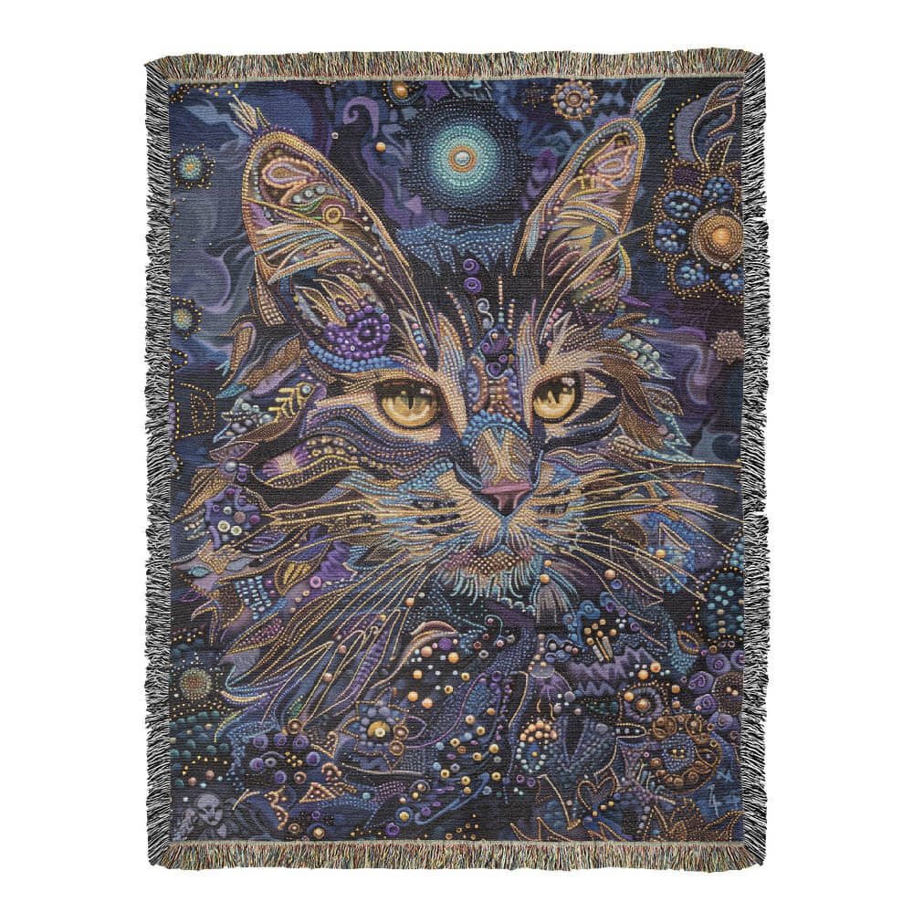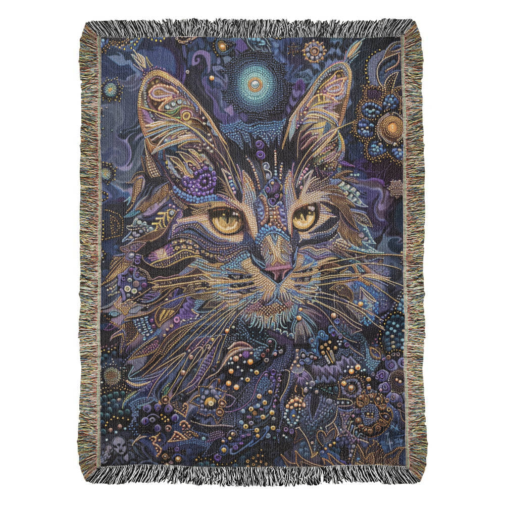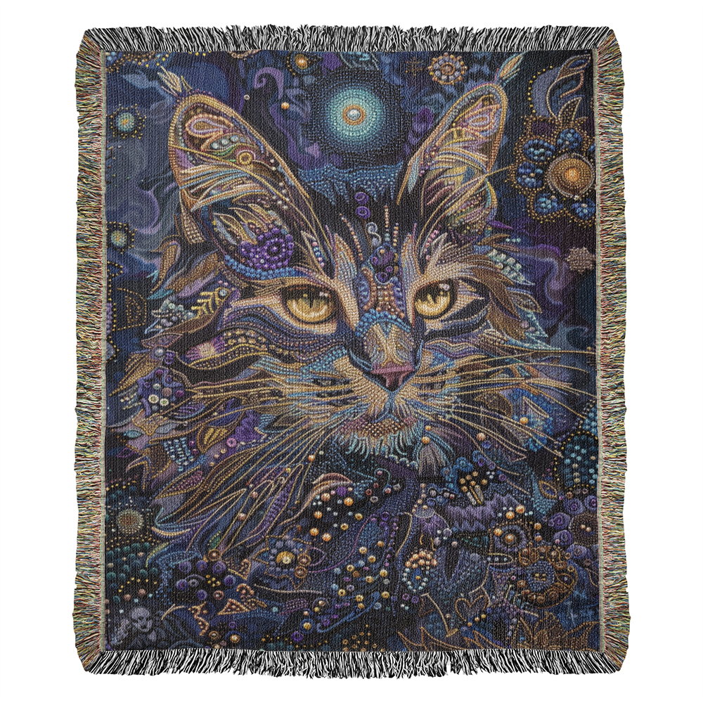 🌌 Wrap yourself in wonder with this celestial cat blanket, featuring a mesmerizing beaded-style design in rich indigo, sapphire, and gold. The intricate detailing evokes a sense of magic and mystery β€” perfect for dreamers, stargazers, and feline lovers alike.