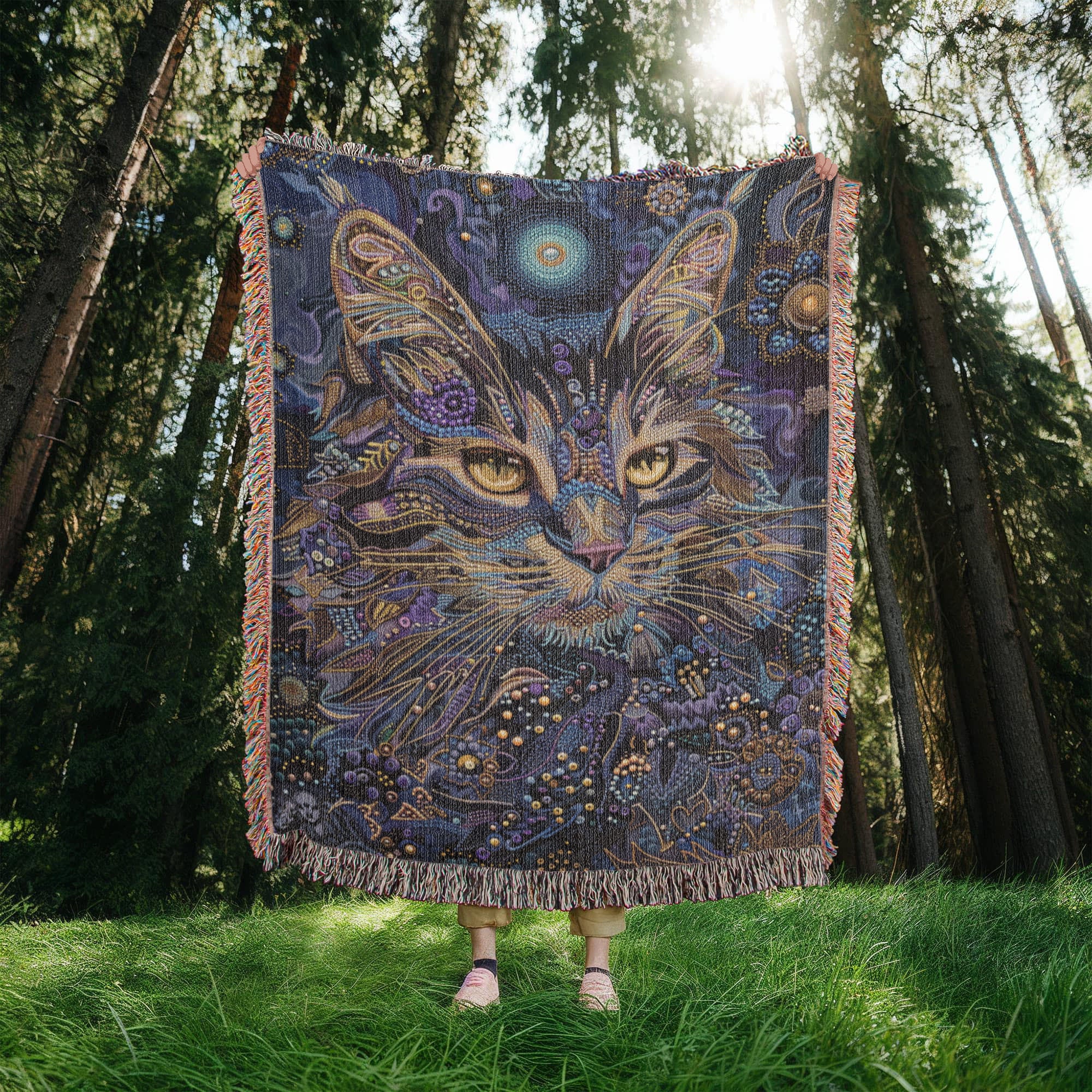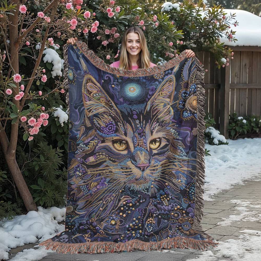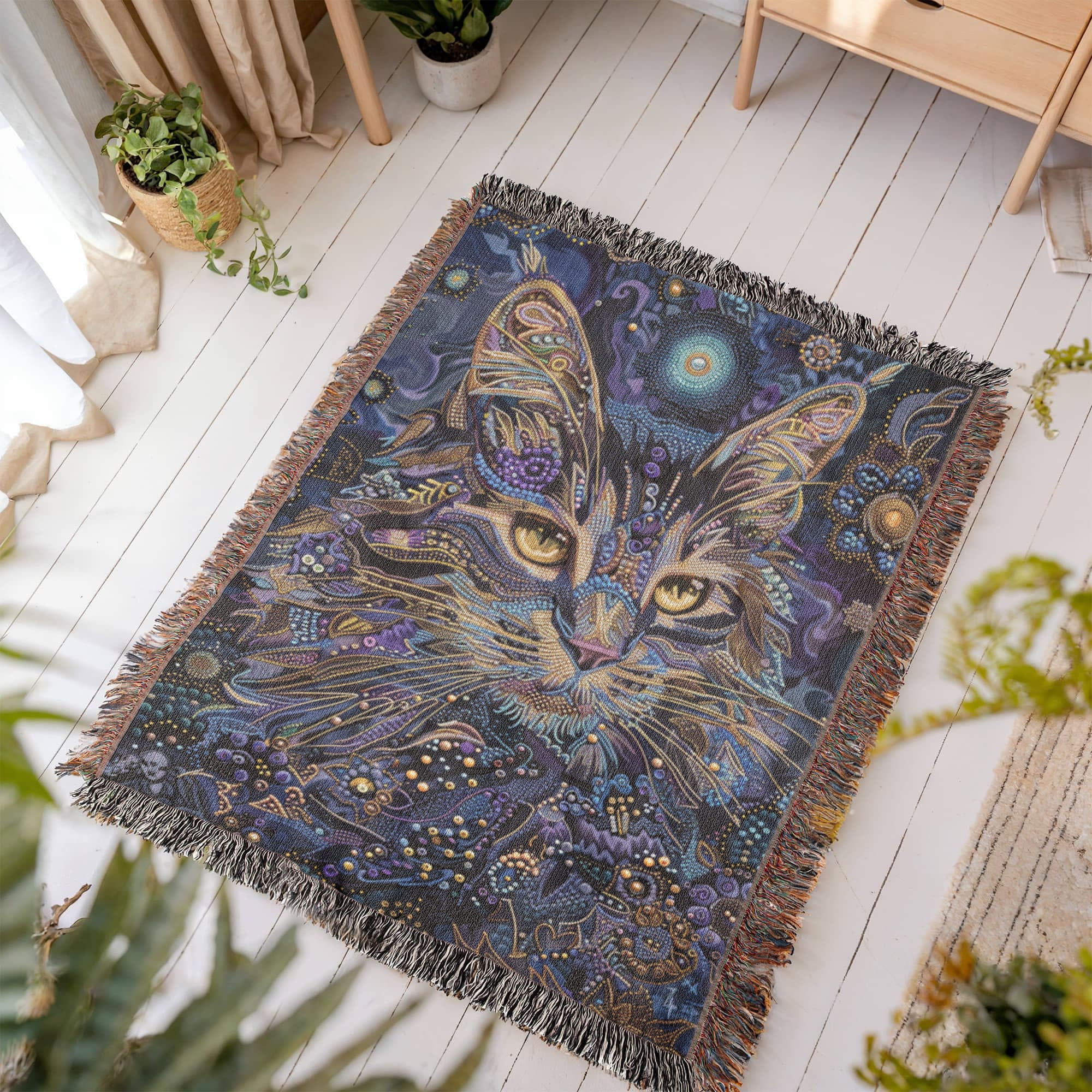 🌌 Wrap yourself in wonder with this celestial cat blanket, featuring a mesmerizing beaded-style design in rich indigo, sapphire, and gold. The intricate detailing evokes a sense of magic and mystery β€” perfect for dreamers, stargazers, and feline lovers alike.