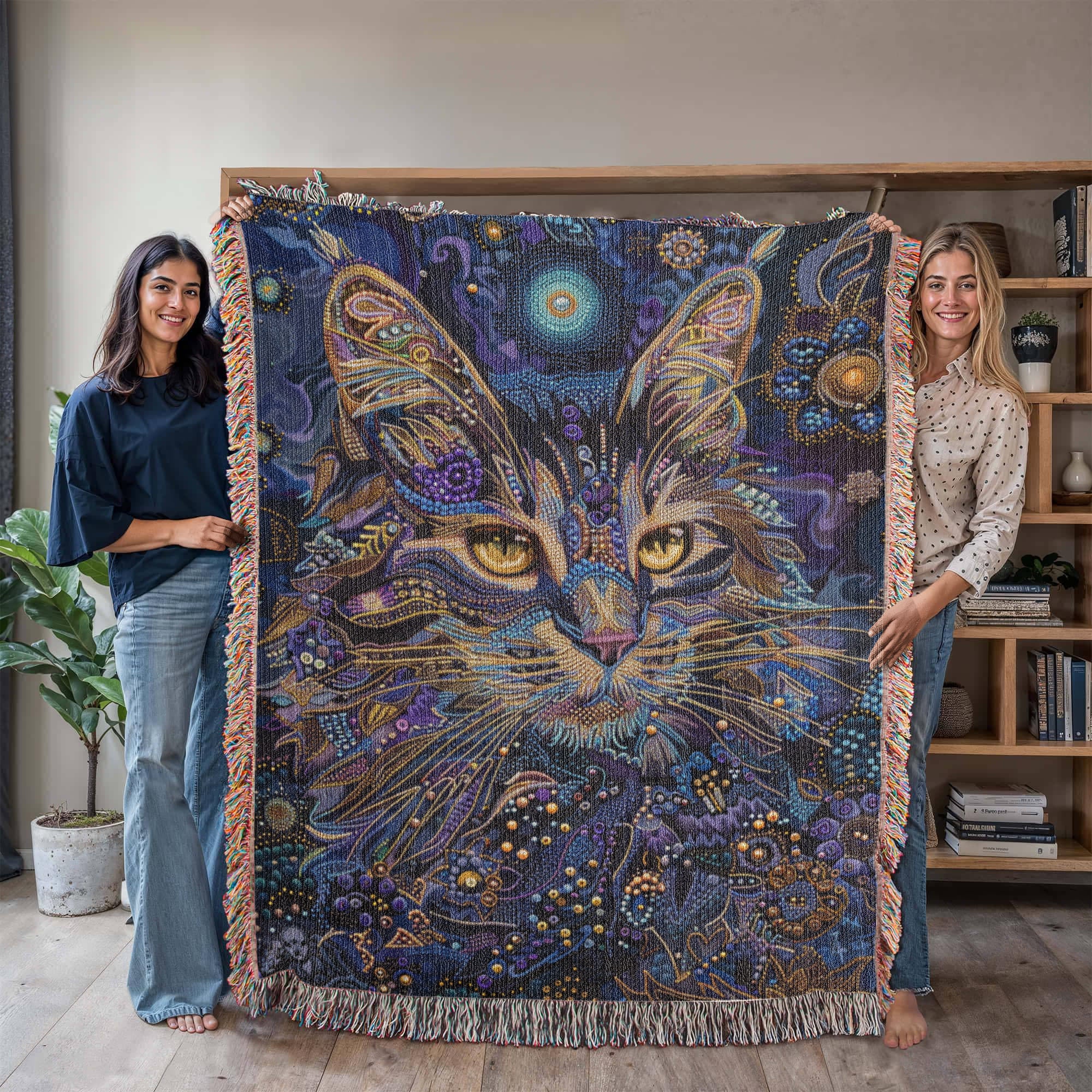 Celestial Cat Blanket – Mystical Beaded Design in Deep Indigo & Gold | Boho Spirit Animal Throw