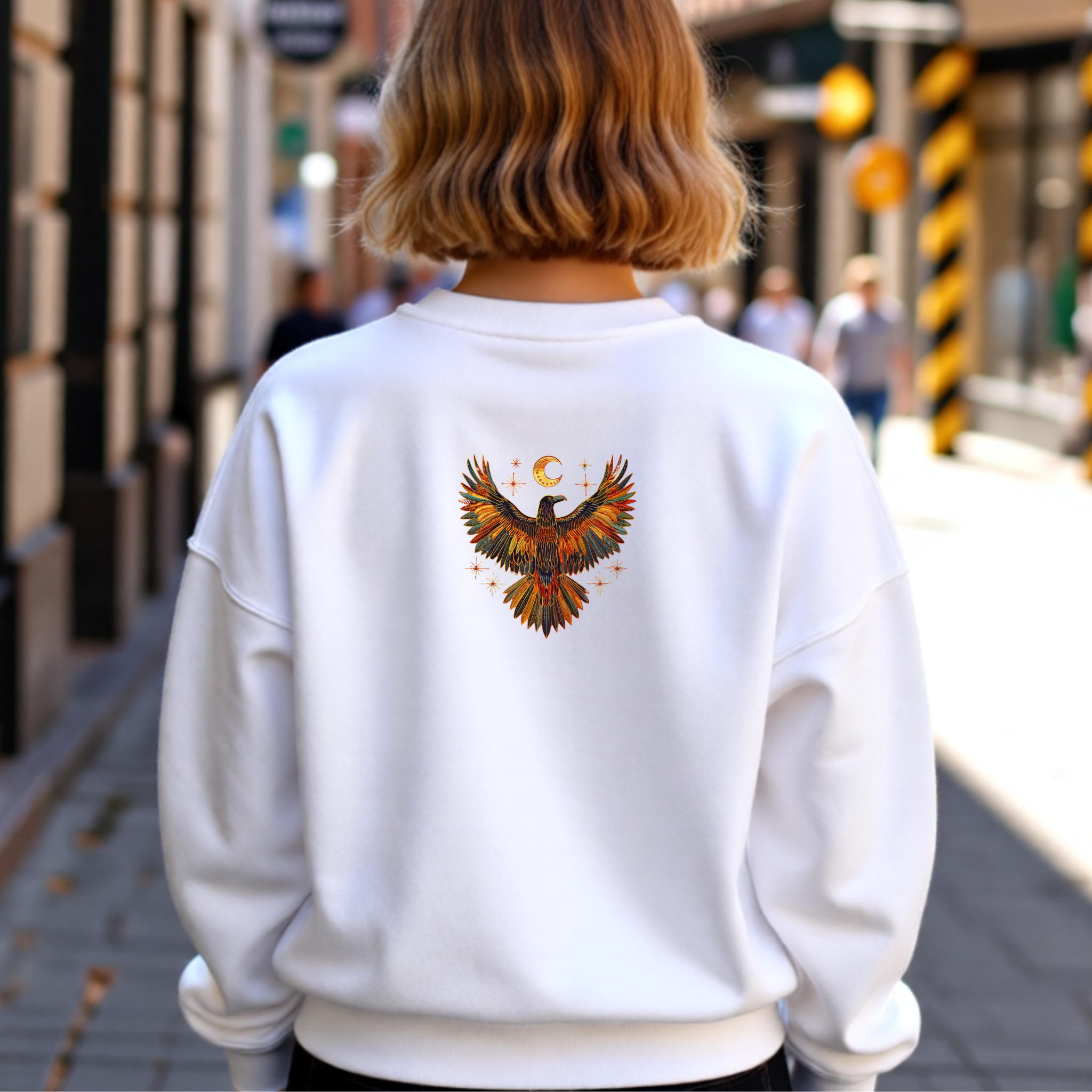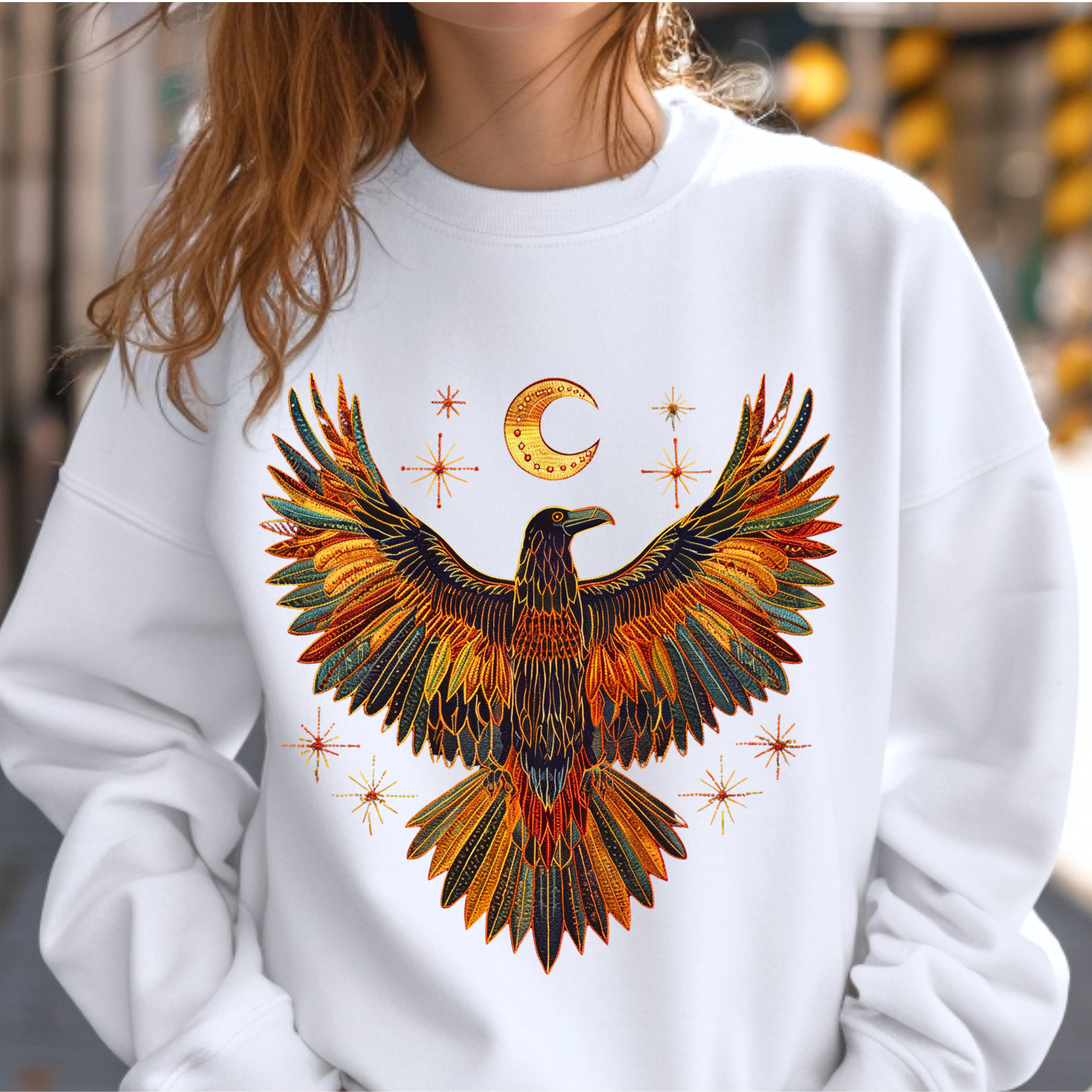 Embrace the wisdom of the night. This embroidered-look raven sweatshirt features rich, dark tones, celestial accents, and ornate folk-art detailing inspired by ancient symbolism. A bold front design paired with a smaller back motif creates a balanced, intentional piece with elevated boho character.
