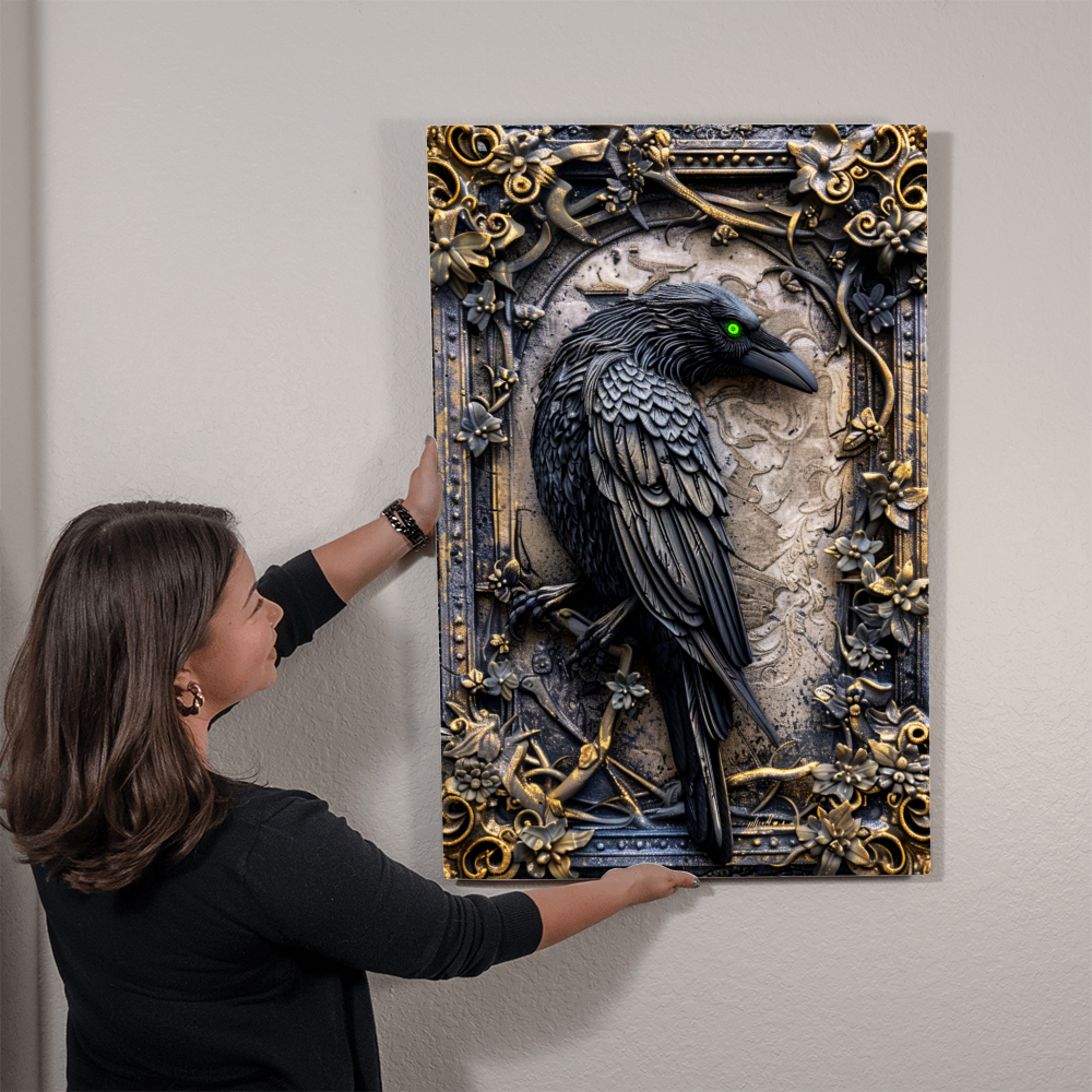 Meet *Corvex*: A mystic raven rendered in high-gloss metal print. Framed in gothic florals and ancient scrollwork, this sentinel appears sculpted from enchanted steel — but don’t be deceived. This is a **flat, high-resolution print**, designed to look deeply embossed through expert shading and texture.