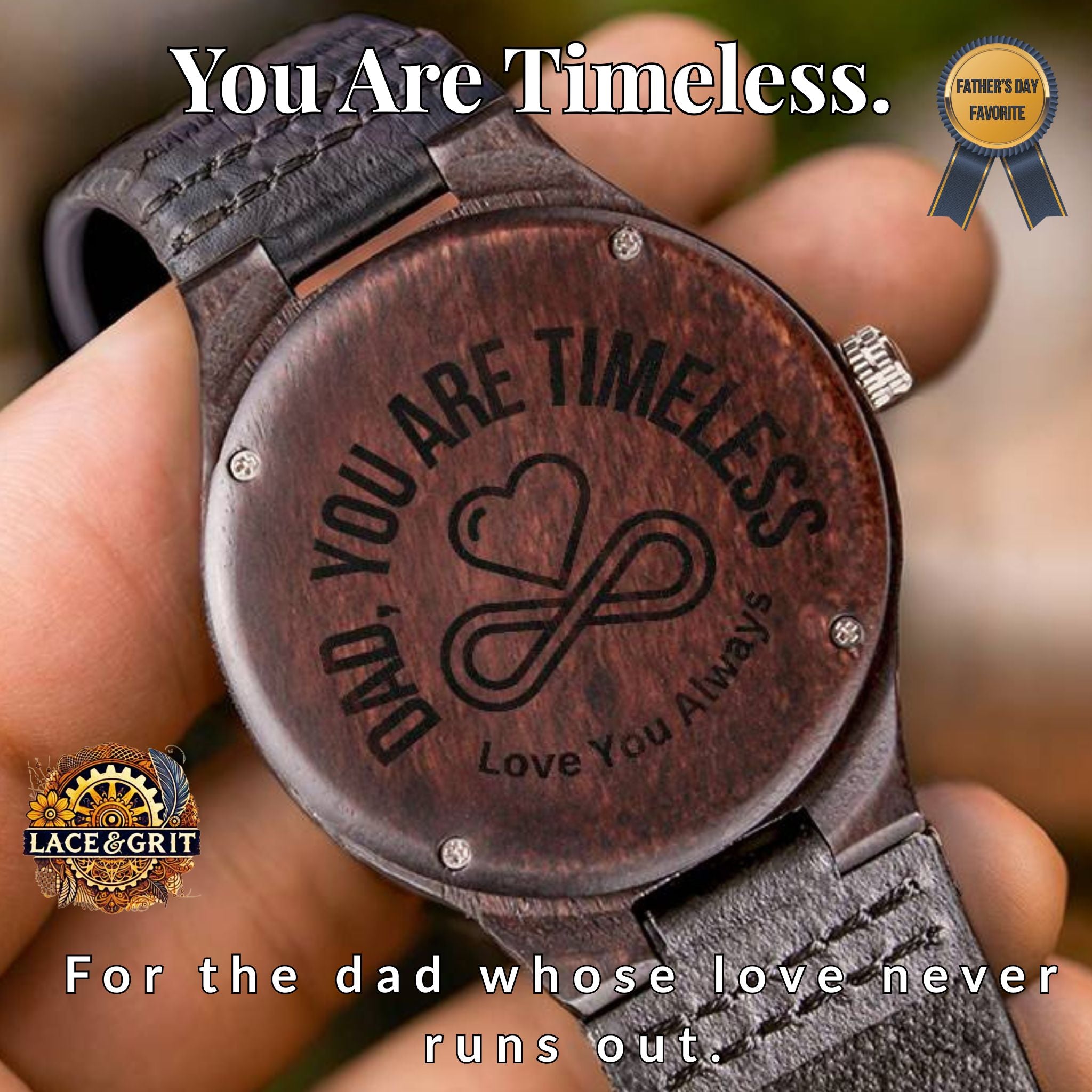 • Bold “Dad, You Are Timeless” engraving