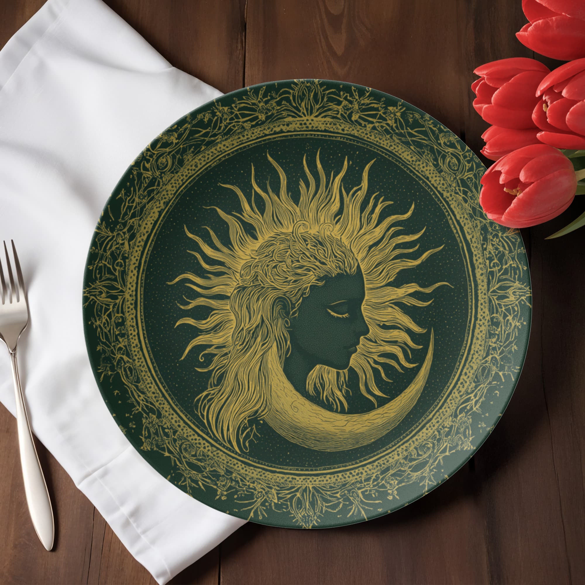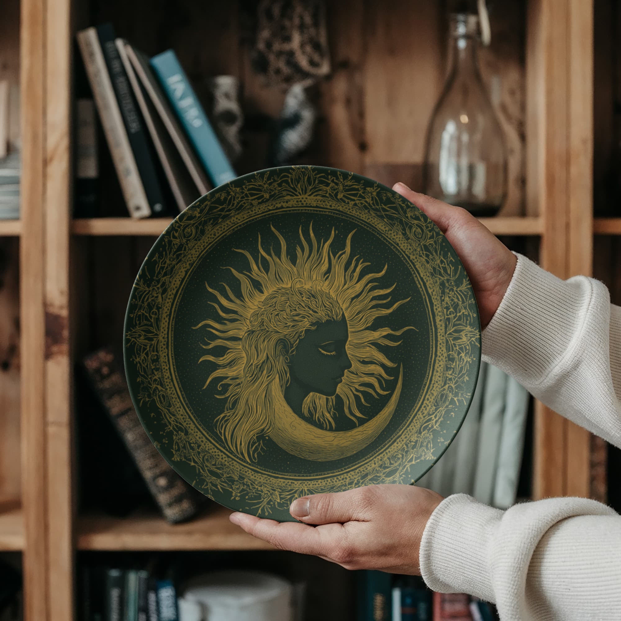 Bring intention and beauty to every corner of your life with this celestial-inspired ritual plate. Featuring an intricate gold-etched sun and moon goddess on a deep forest green background, it’s more than just serveware — it’s a piece of art for your altar, your table, or your daily rhythm.