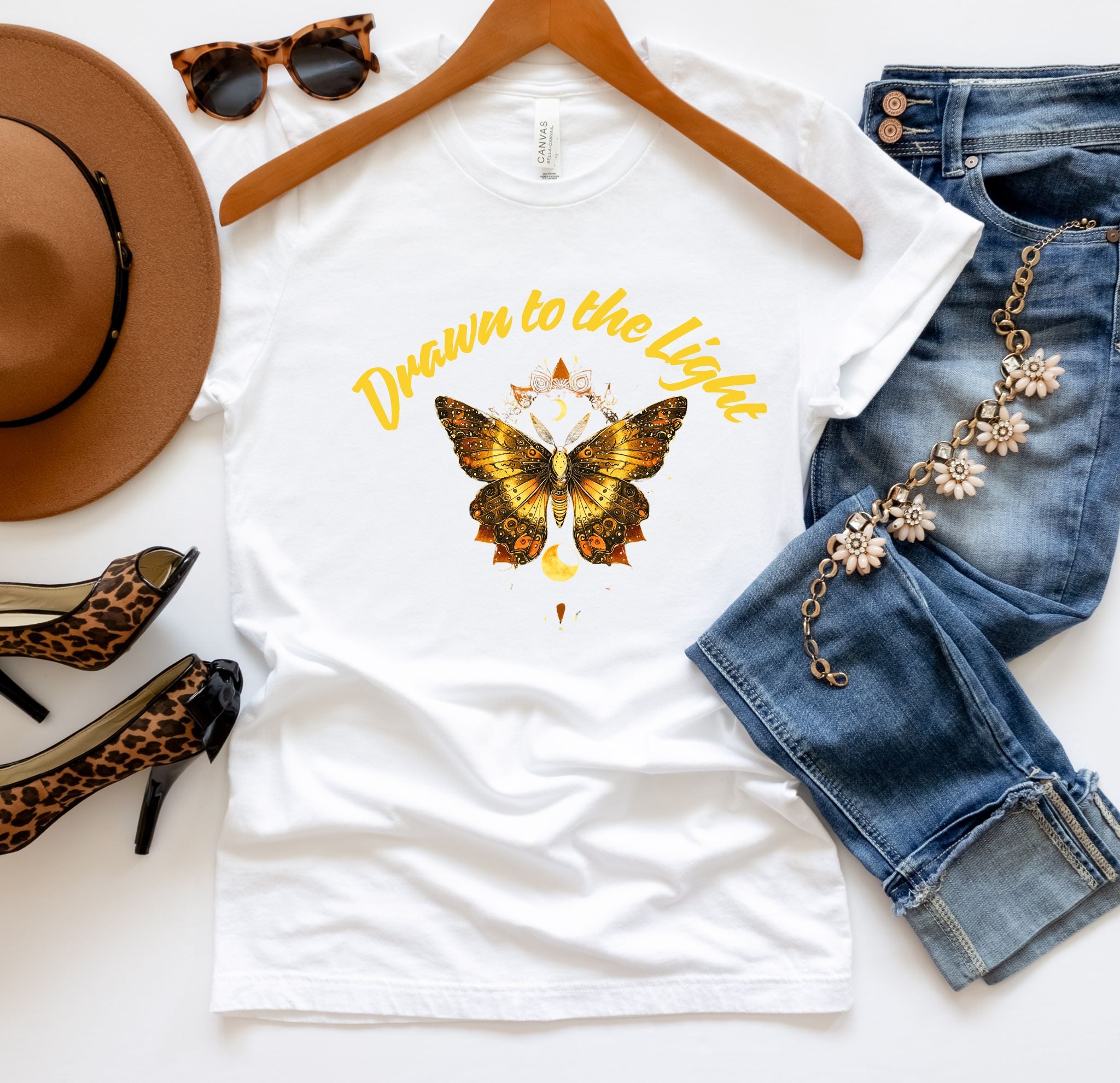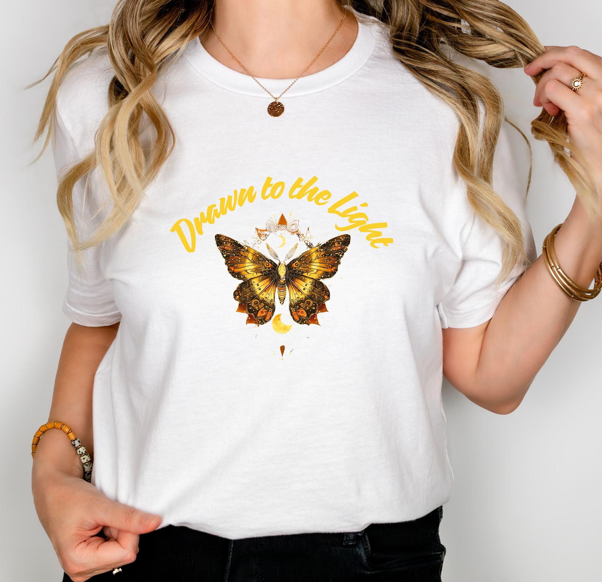 🦋 Drawn to the Light This radiant dual-sided tee features a celestial butterfly on both the front and back, symbolizing transformation, intuition, and light-seeking energy. With warm gold tones and soft cosmic details, it captures the spirit of the soul’s journey toward higher truth and inner awakening.
