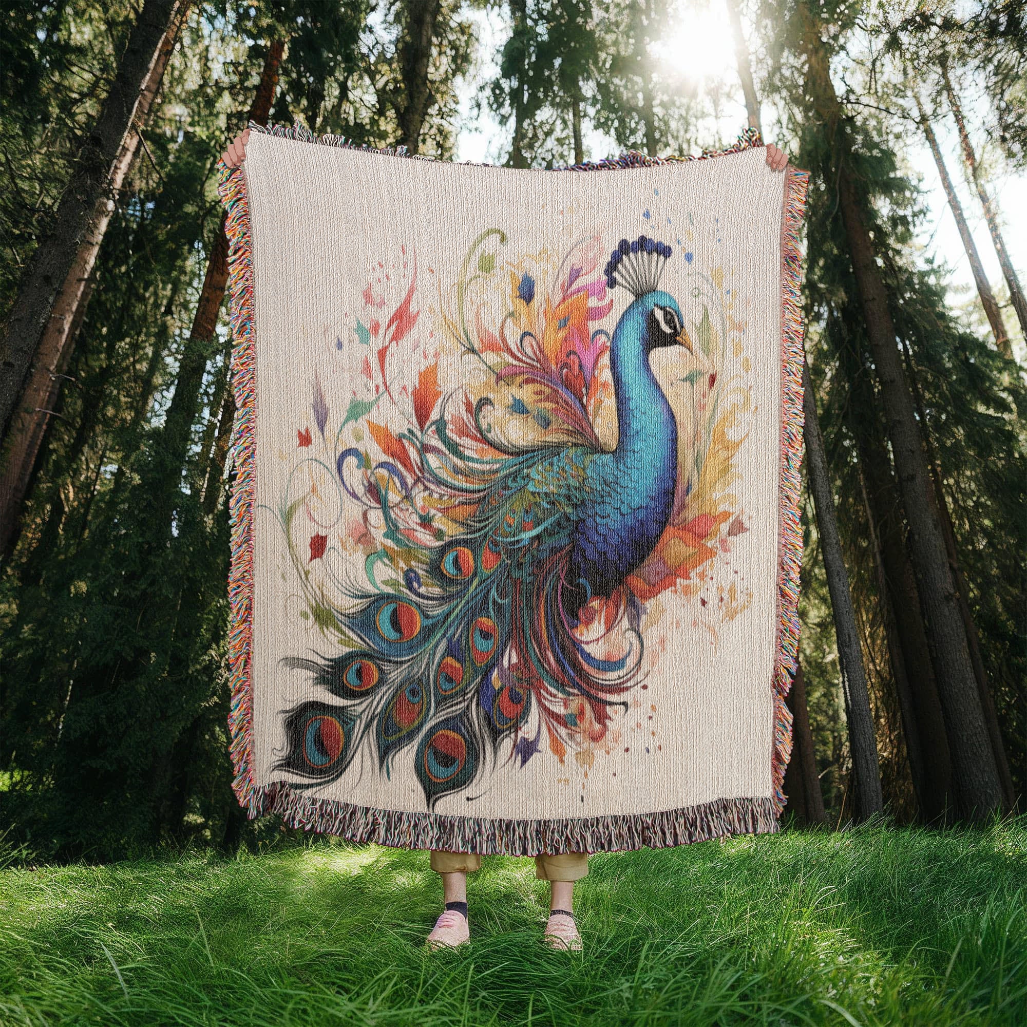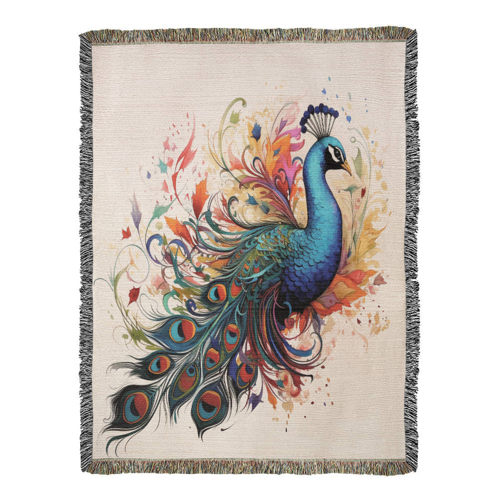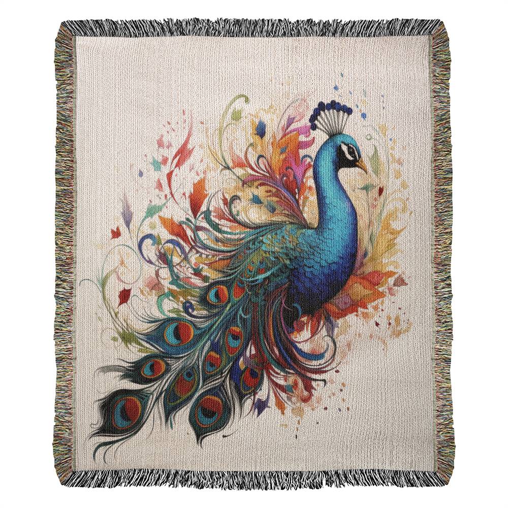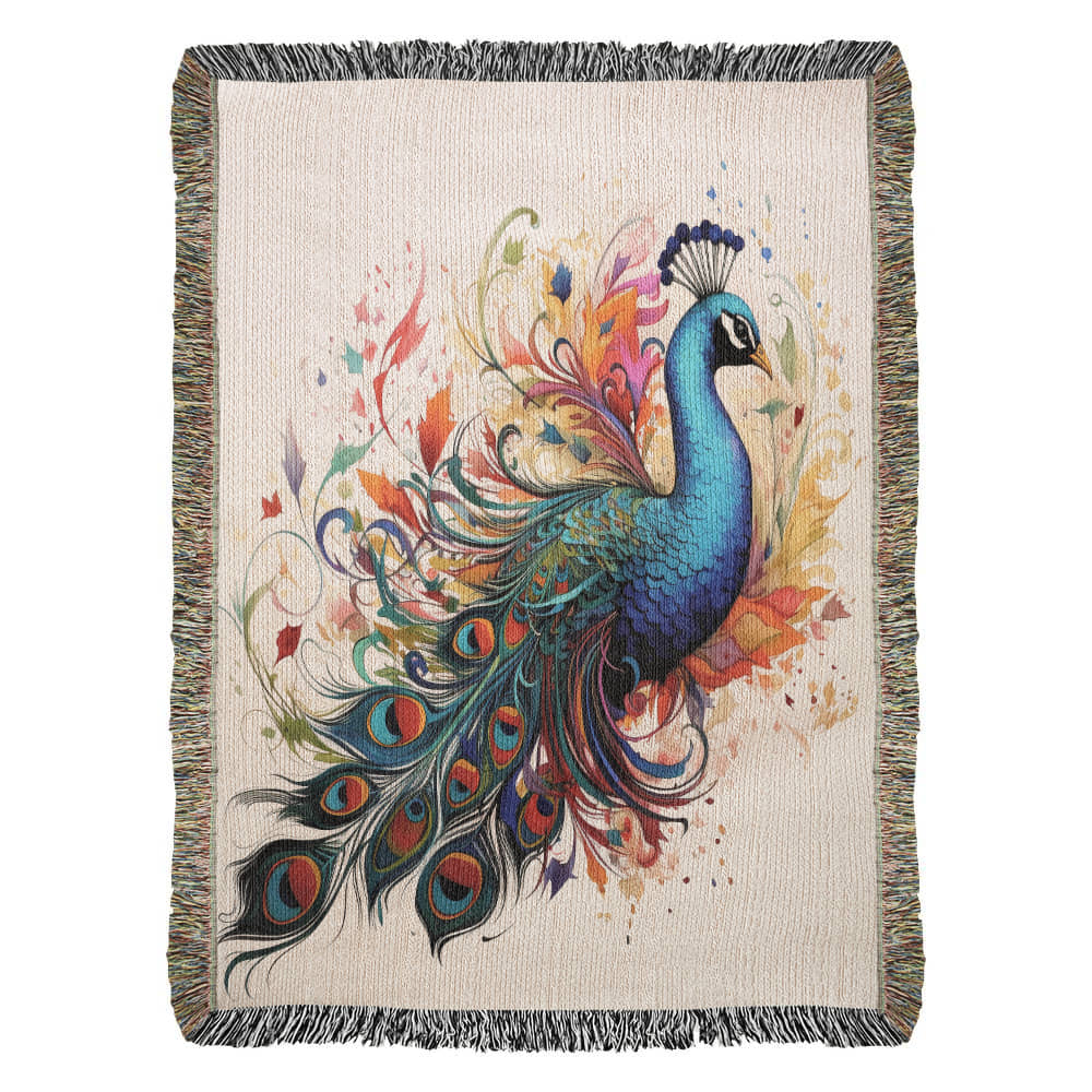 Plumefire Woven Blanket – Watercolor Peacock in Full Display