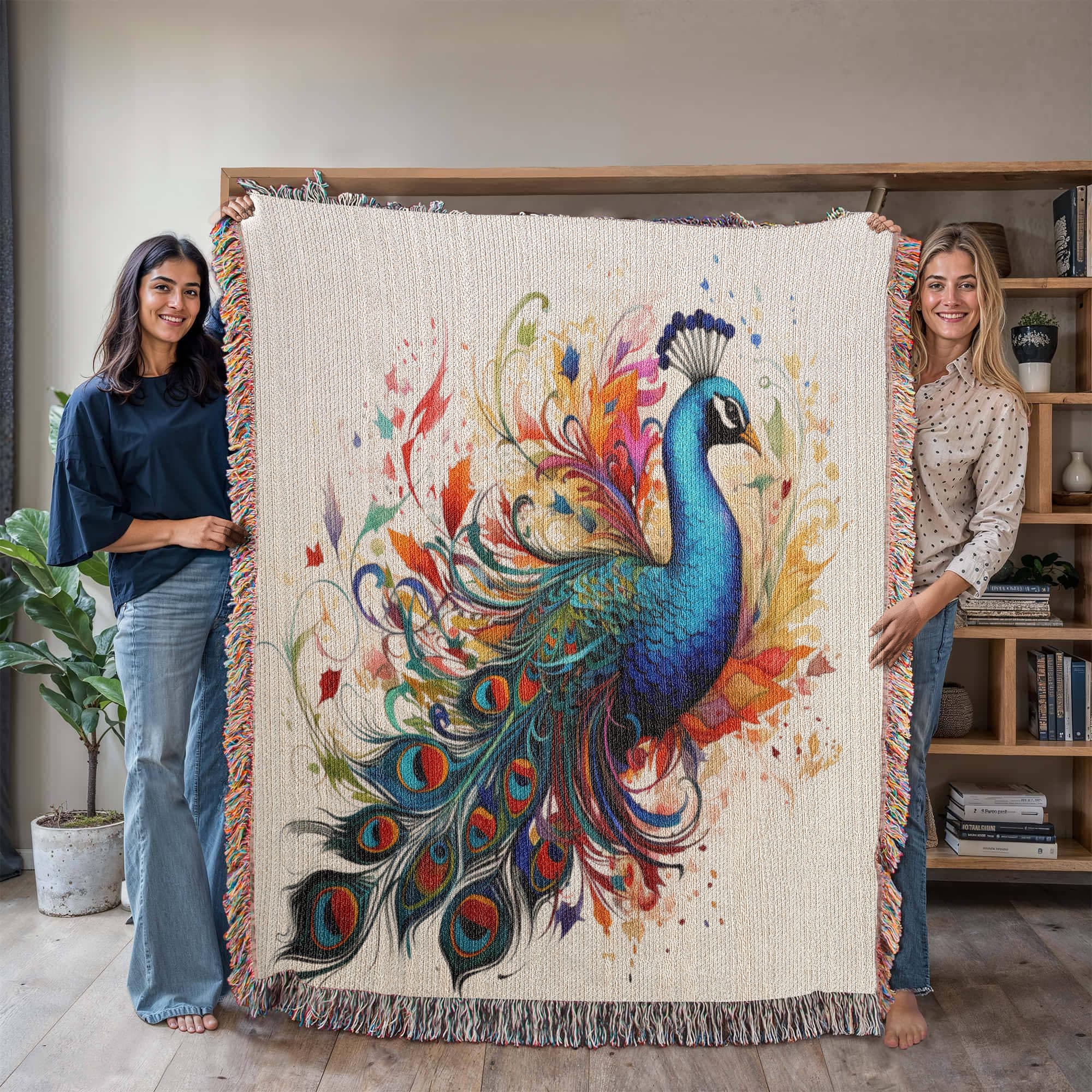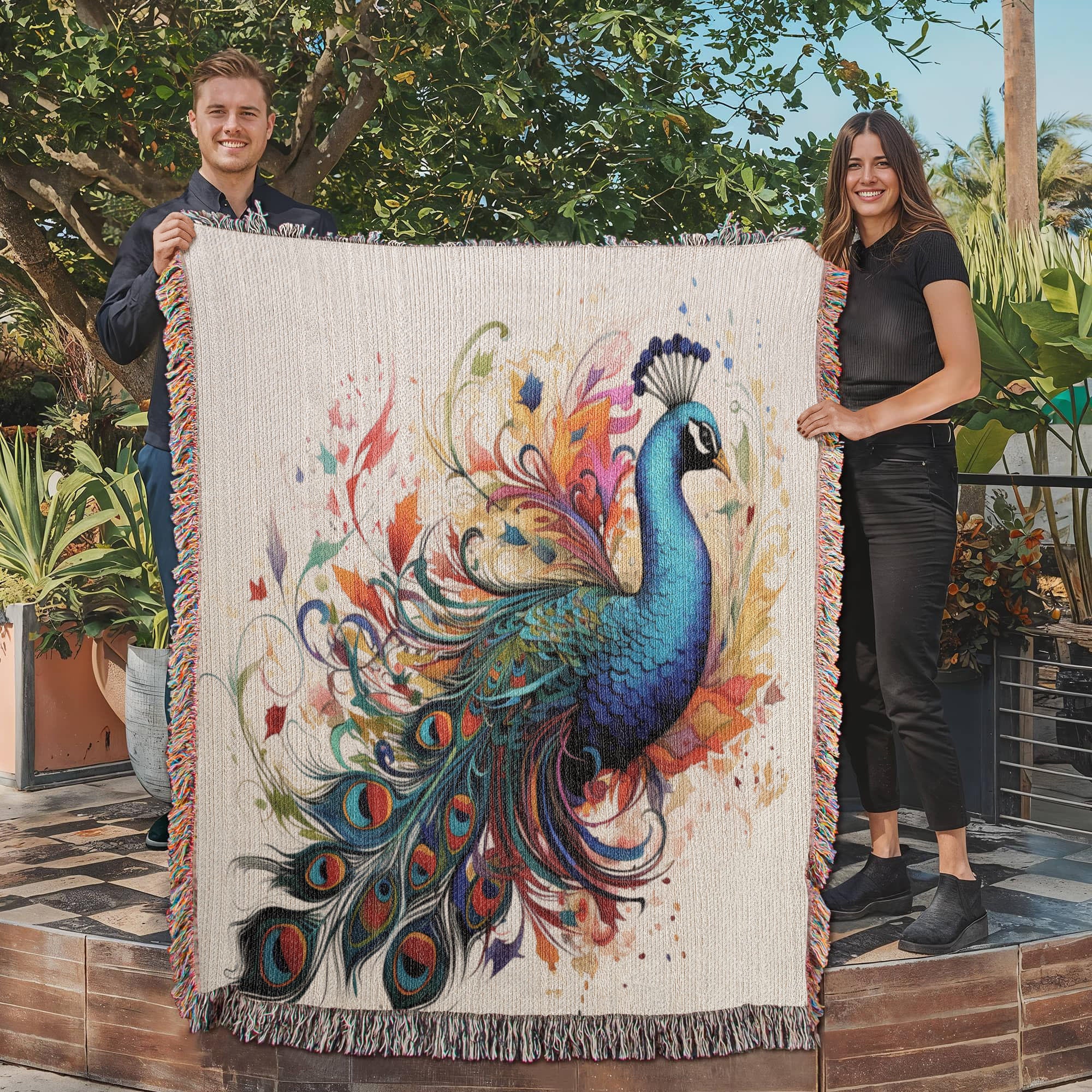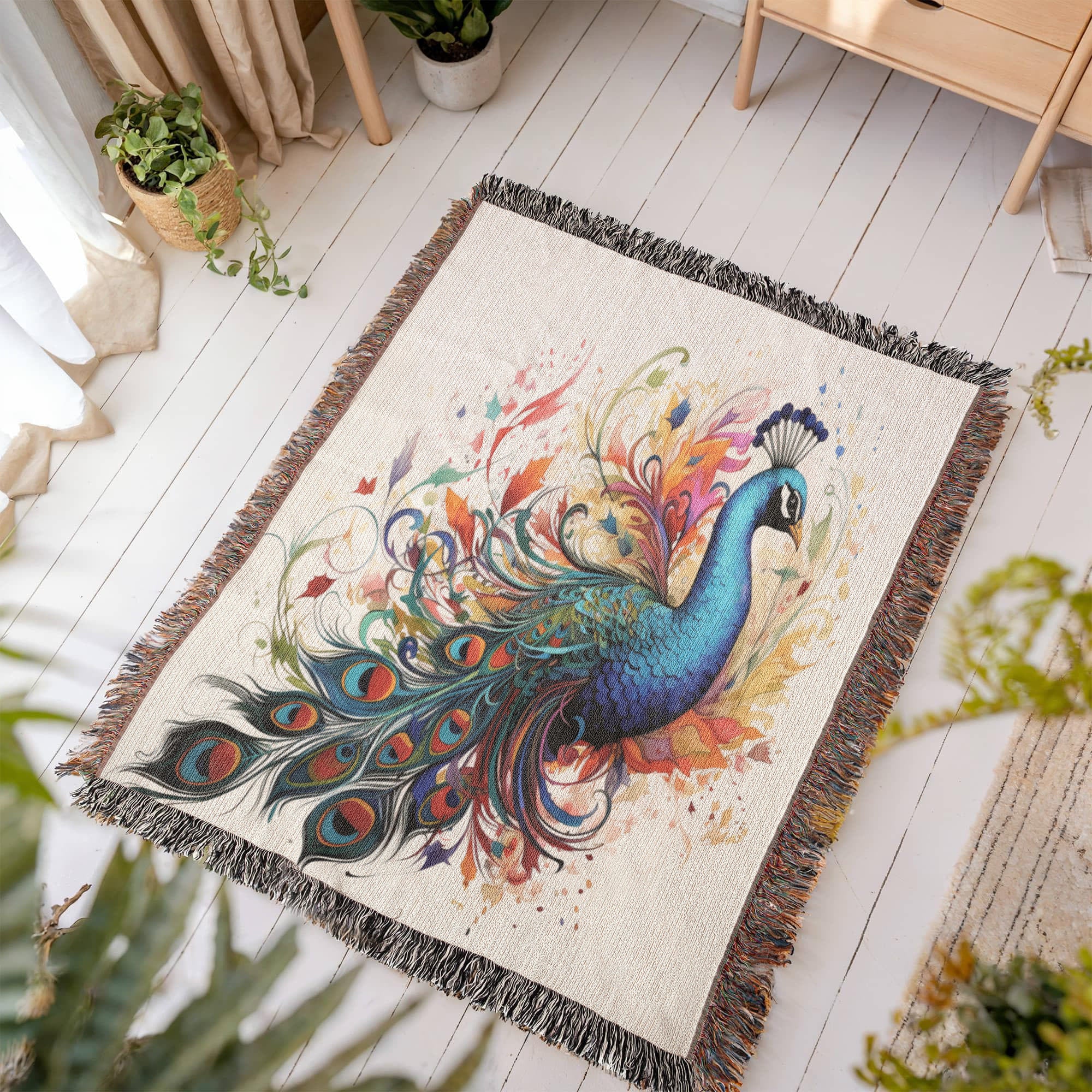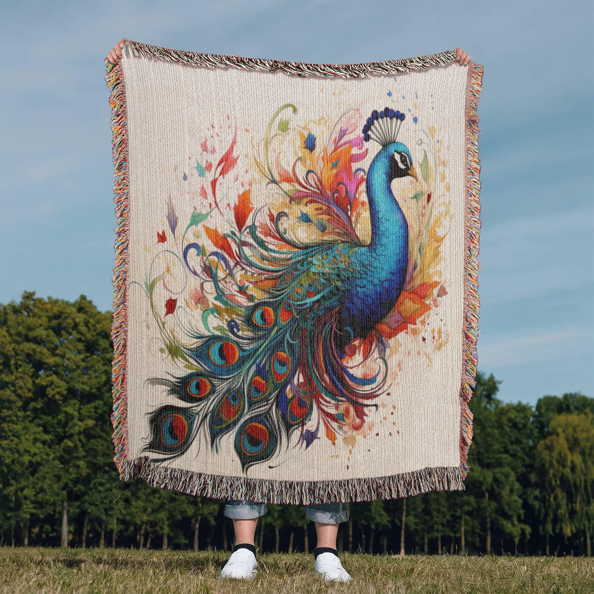 Plumefire Woven Blanket – Watercolor Peacock in Full Display