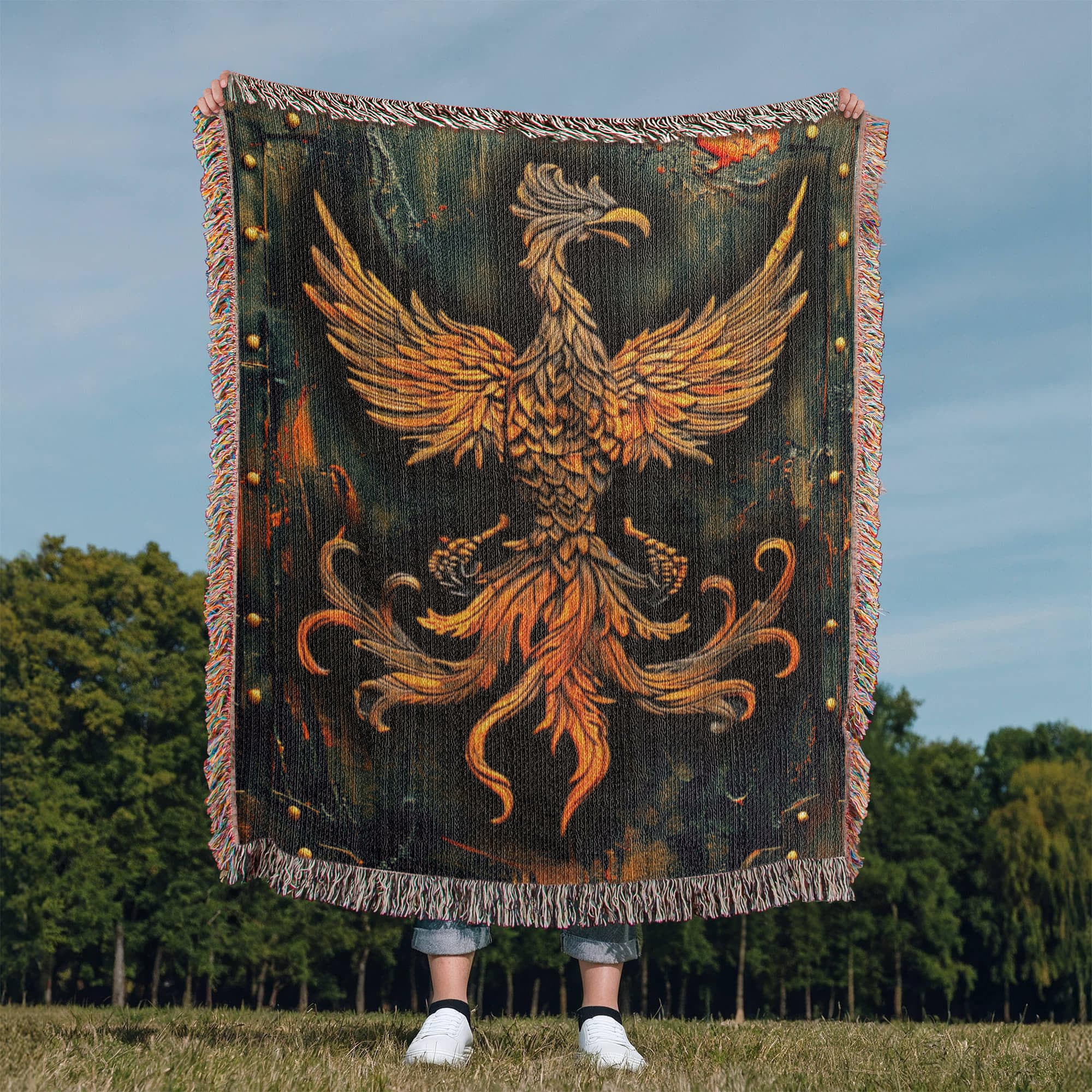 Emberborn Phoenix Blanket – Woven Mystical Firebird Emblem | Fantasy Artifact Decor by Lace & Grit