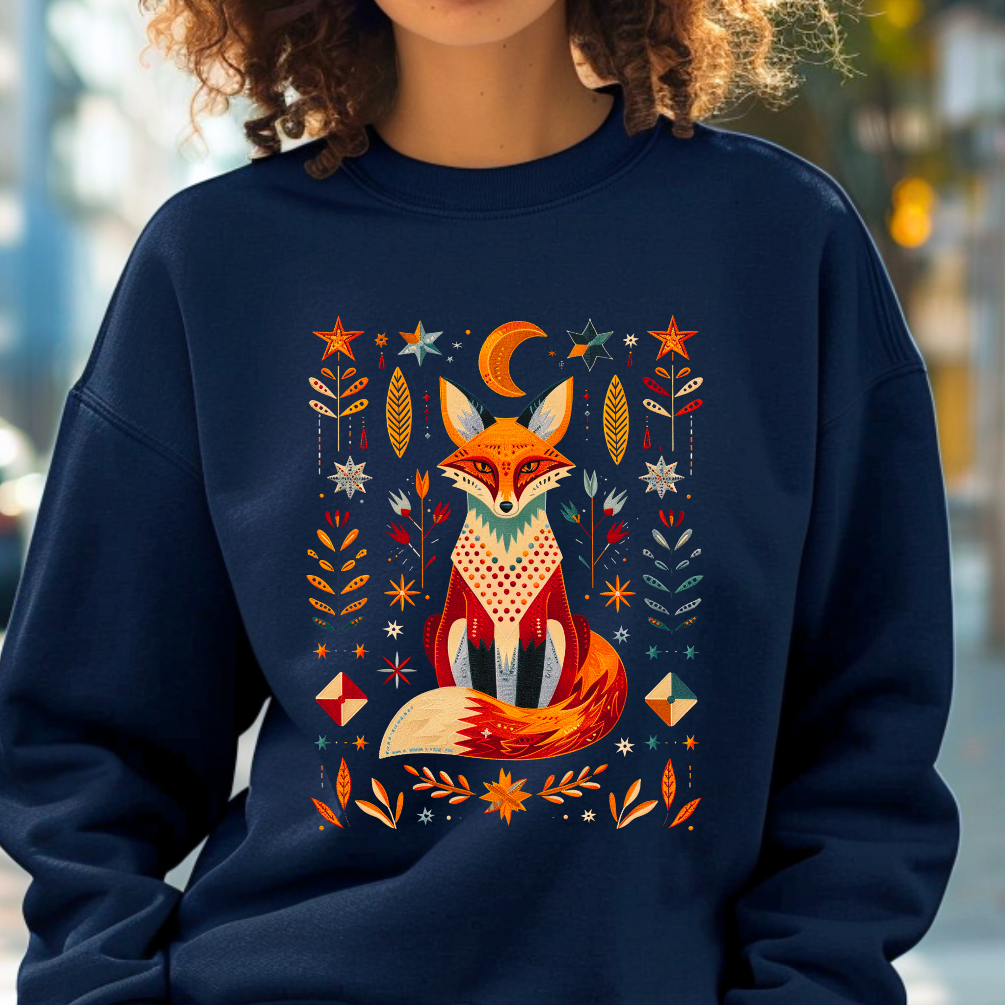 Embrace the charm of the forest night. This embroidered-look fox sweatshirt blends warm earthy tones, celestial accents, and intricate folk-art patterns to create a cozy, mystical piece for every season. Printed boldly on the front and in a smaller motif on the back, it delivers elevated boho style and high perceived value.