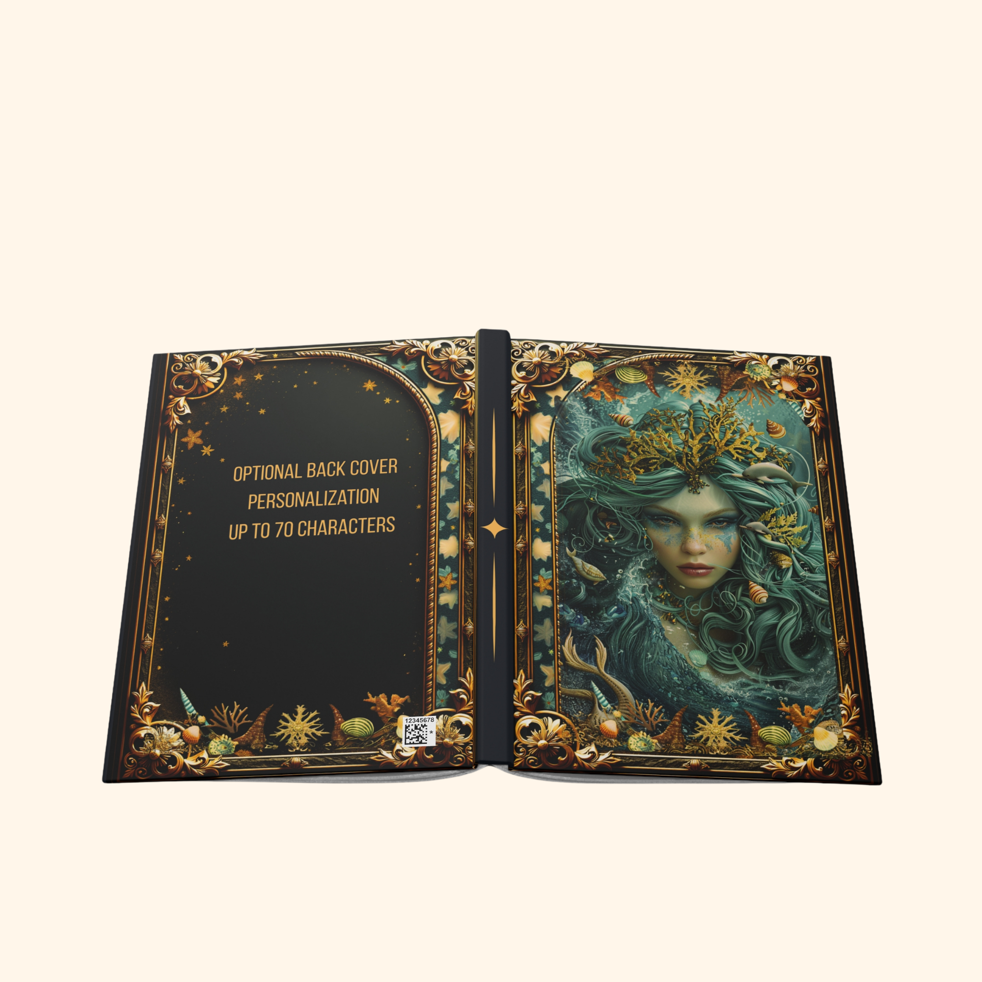 Featuring an ornate gold filigree Amphitrite crowned in coral and pearls, this fantasy ocean notebook captures the grace and power of the sea’s radiant queen. Each hardcover is designed with vivid detail, wrapping front to back in rich teal and golden hues — a true keepsake for any writer, artist, or sea lover.