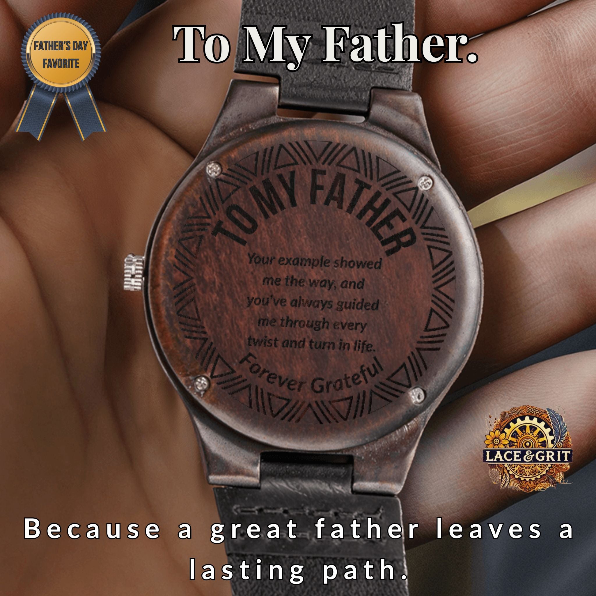 This engraved wooden watch honors the unwavering guidance of a father. Featuring the heartfelt message: