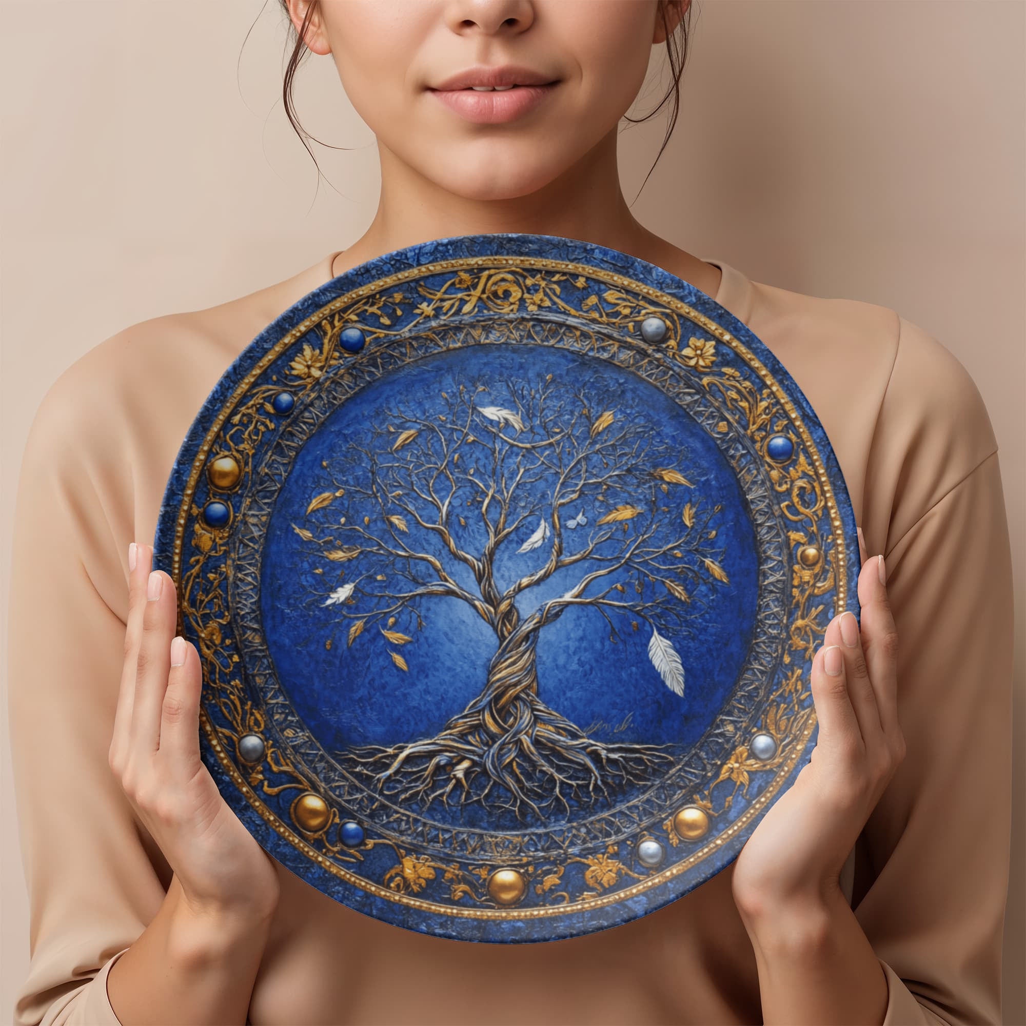 This richly layered Tree of Life design balances strength and surrender. With golden and ivory feathers floating gently through its branches, the imagery evokes cycles of release, renewal, and grace. A glimmering rim of pearls and florals crowns the piece like a cosmic halo.