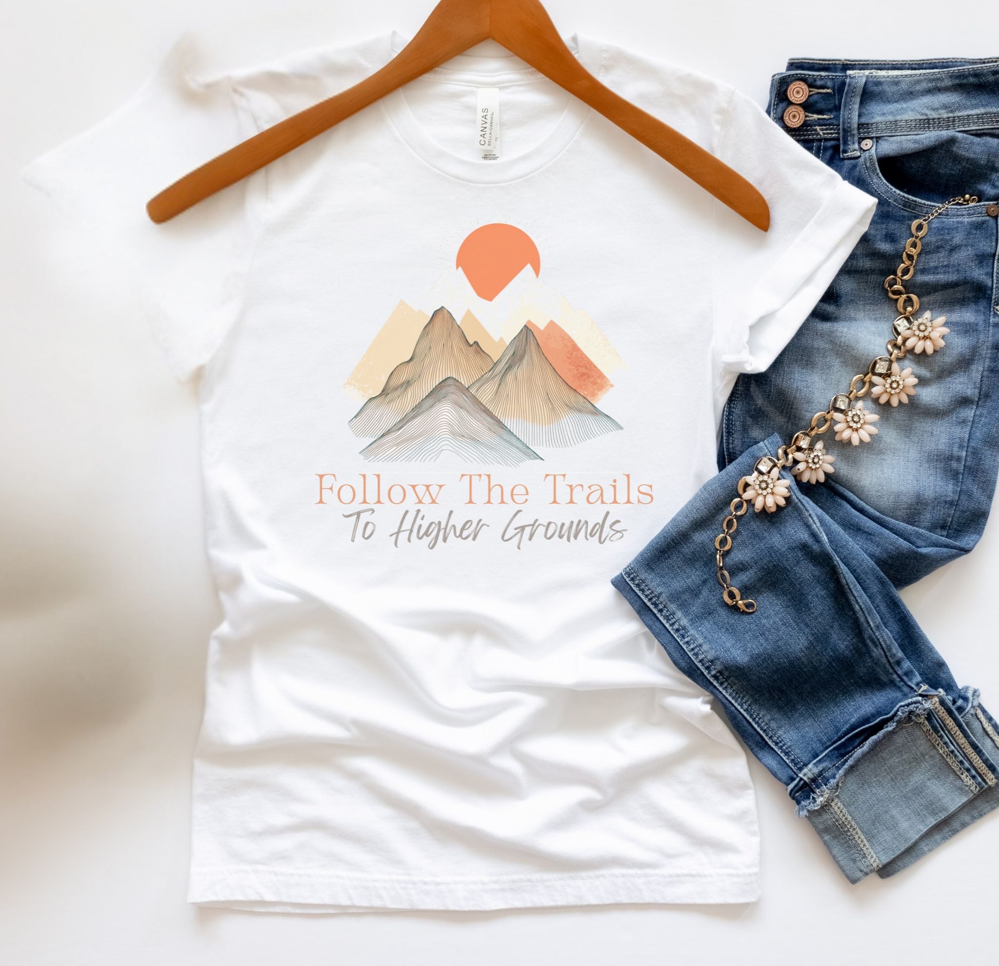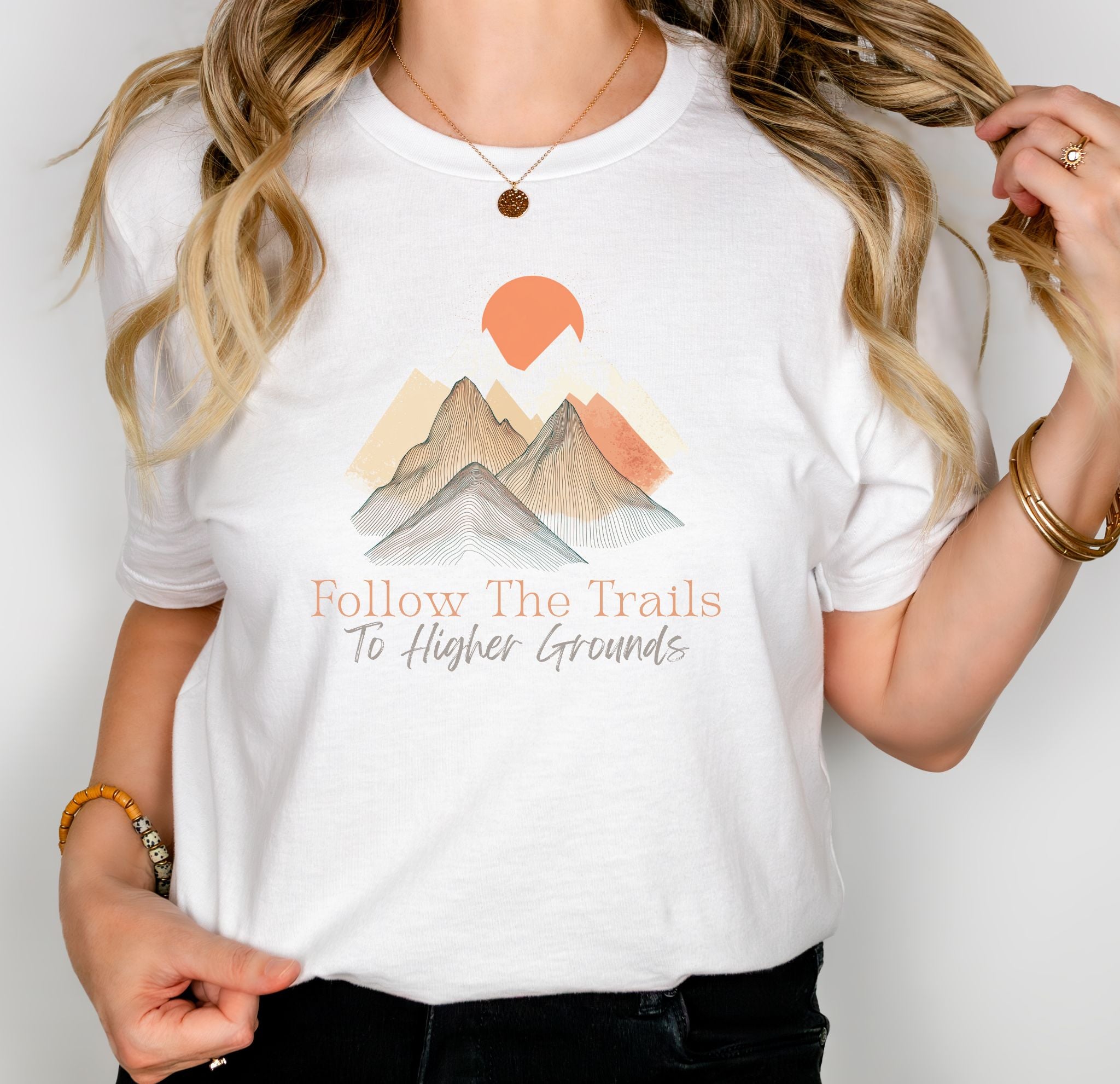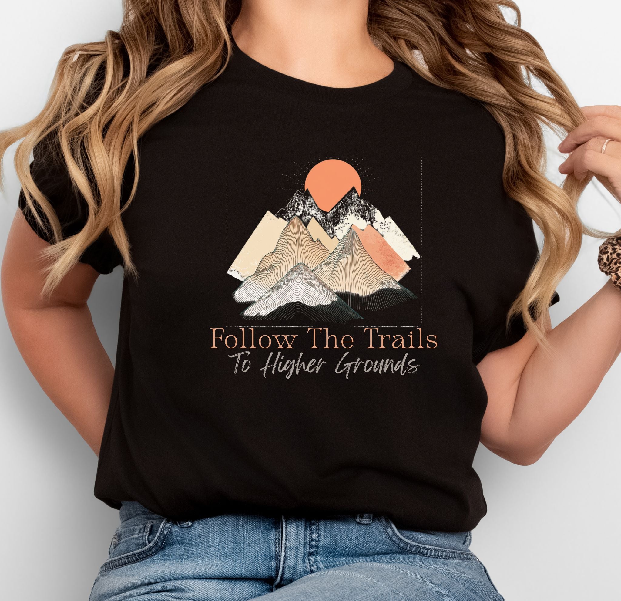 Let your adventurous spirit guide you with our "Follow the Trails to Higher Grounds" Mountain Tee. Now featuring a coordinating back design that adds even more character to your look, this shirt is a love letter to wanderers, climbers, and seekers of soulful paths.