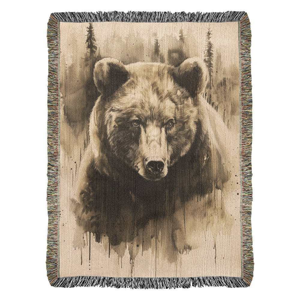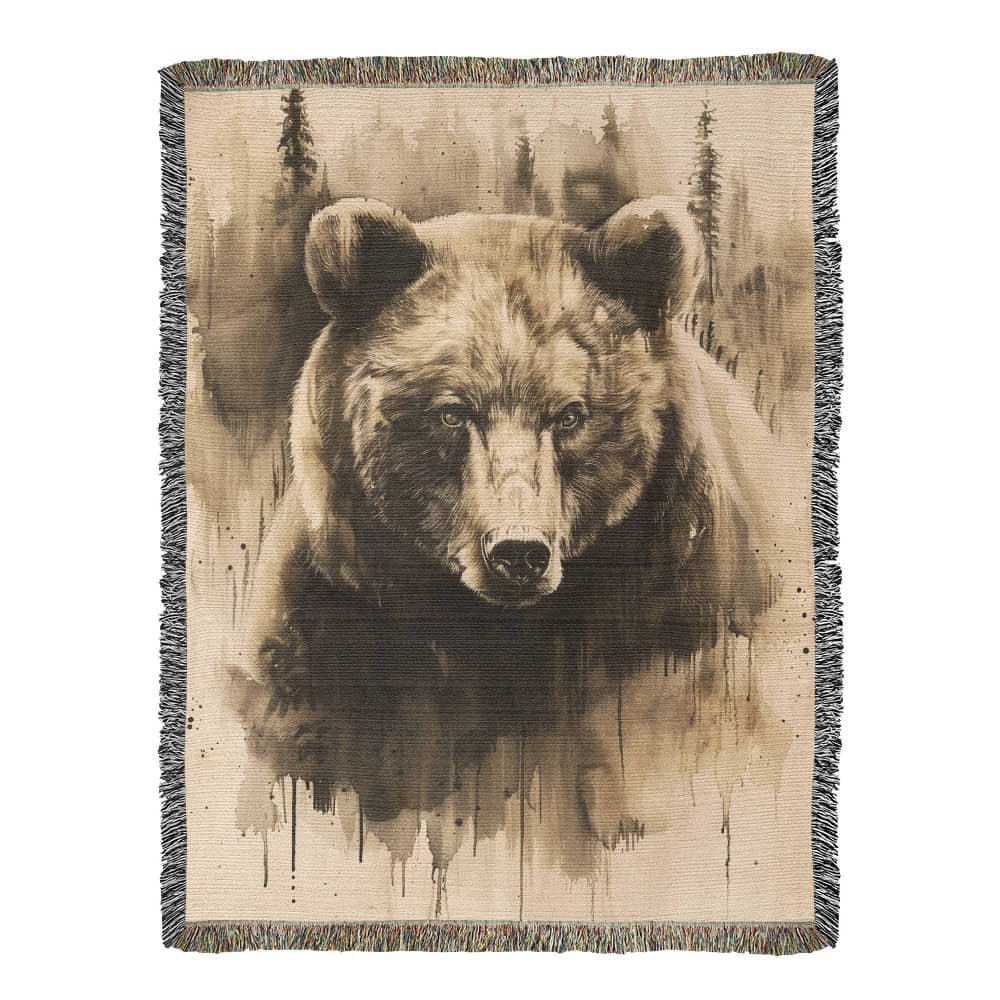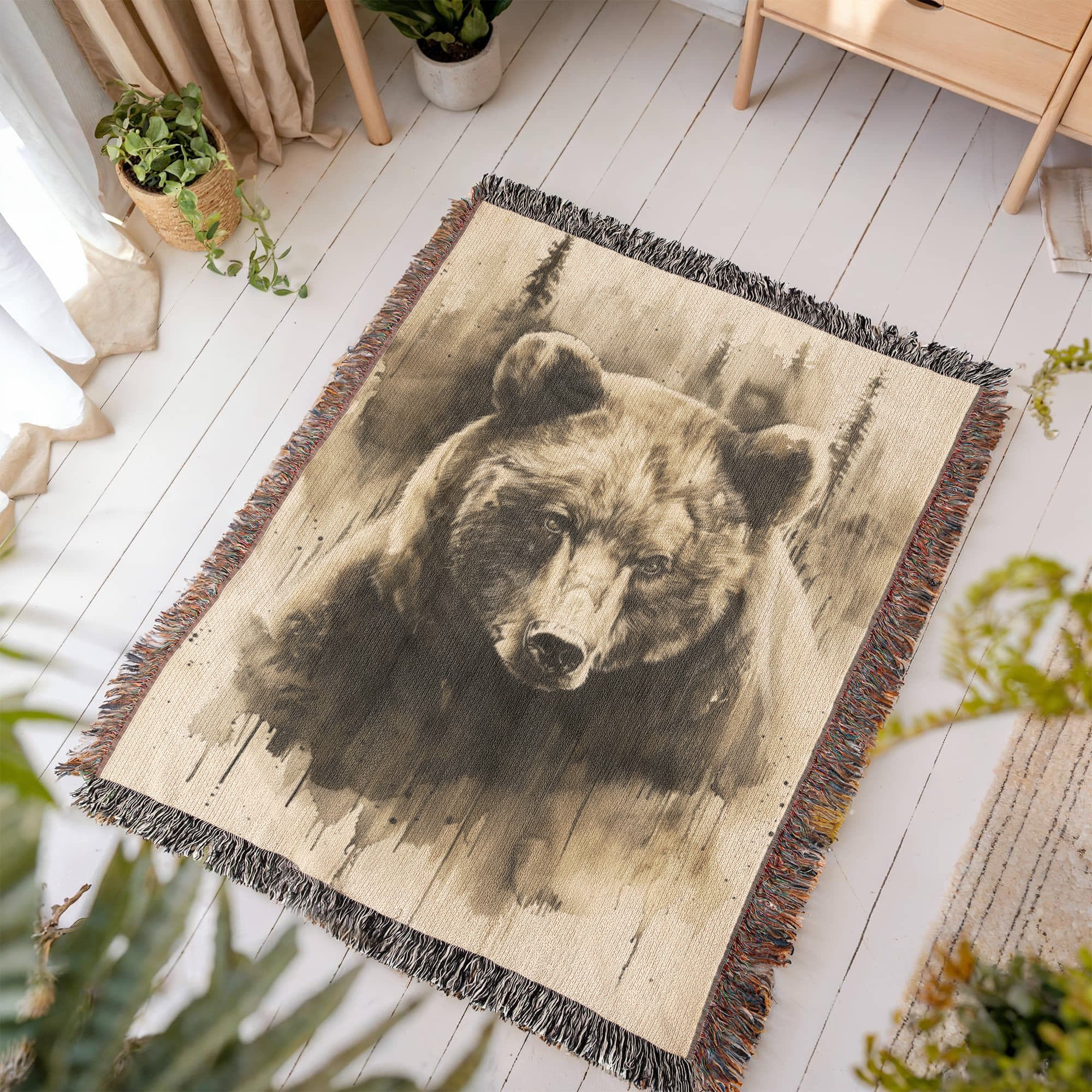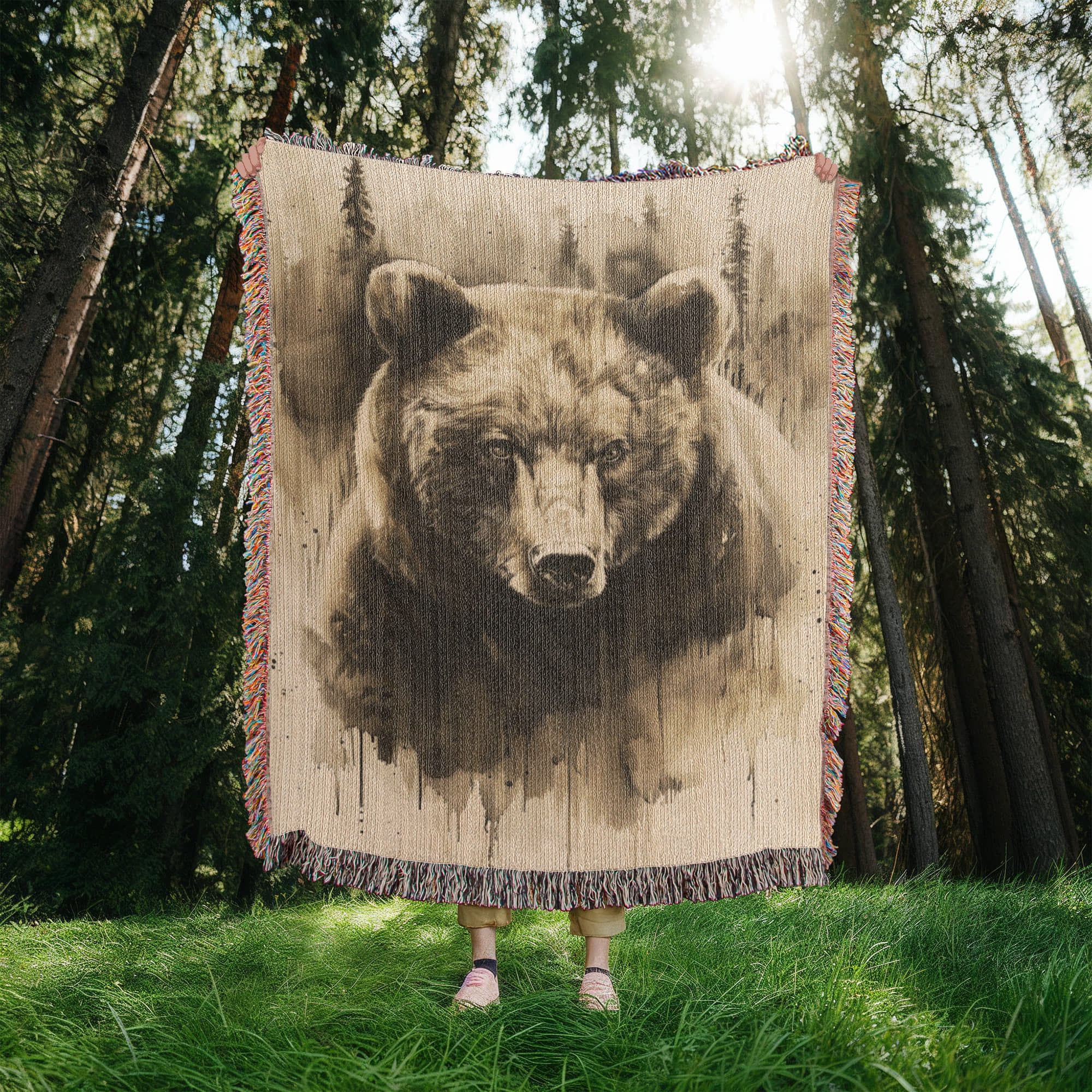 Forest Watcher Woven Blanket – Watercolor Bear in Woodland Mist