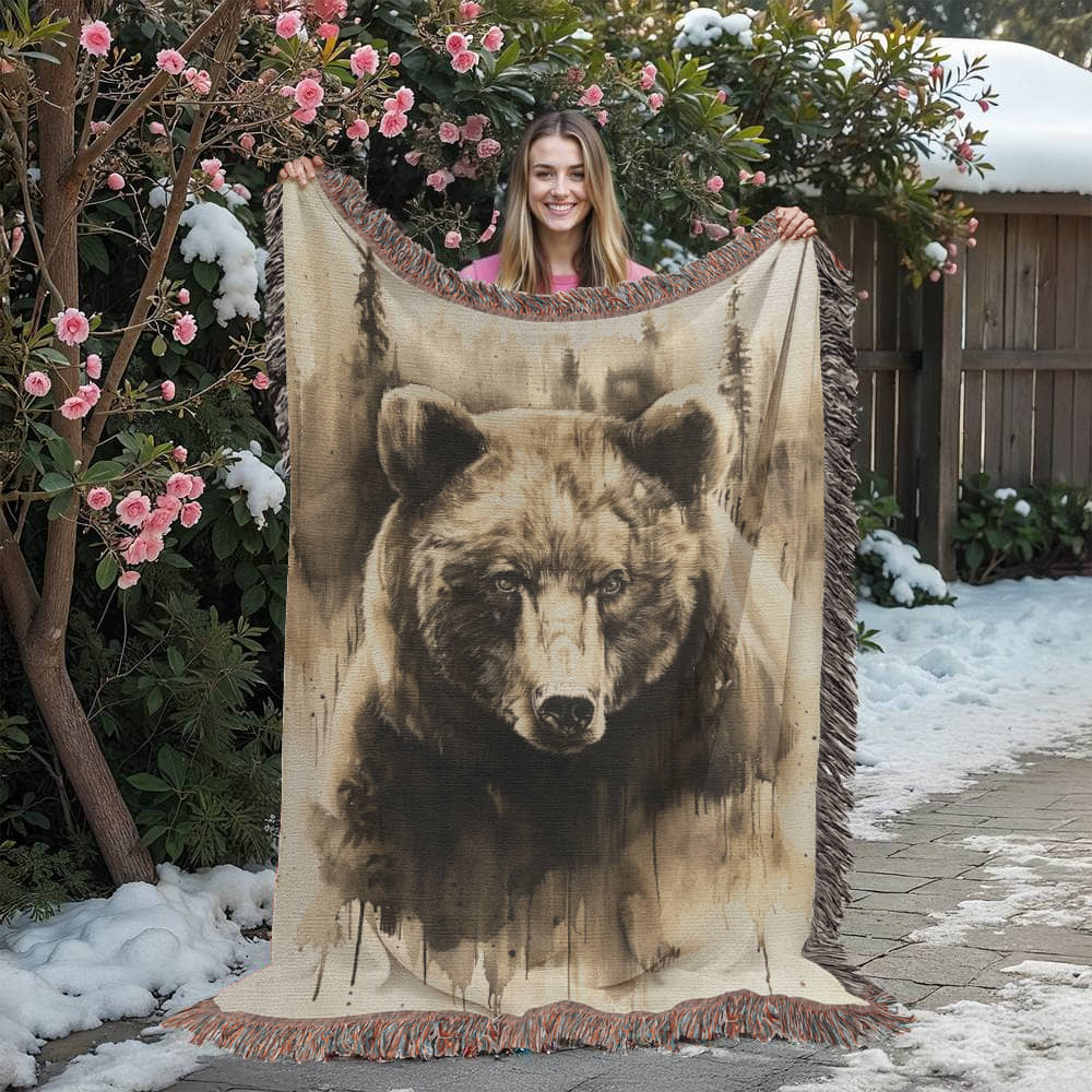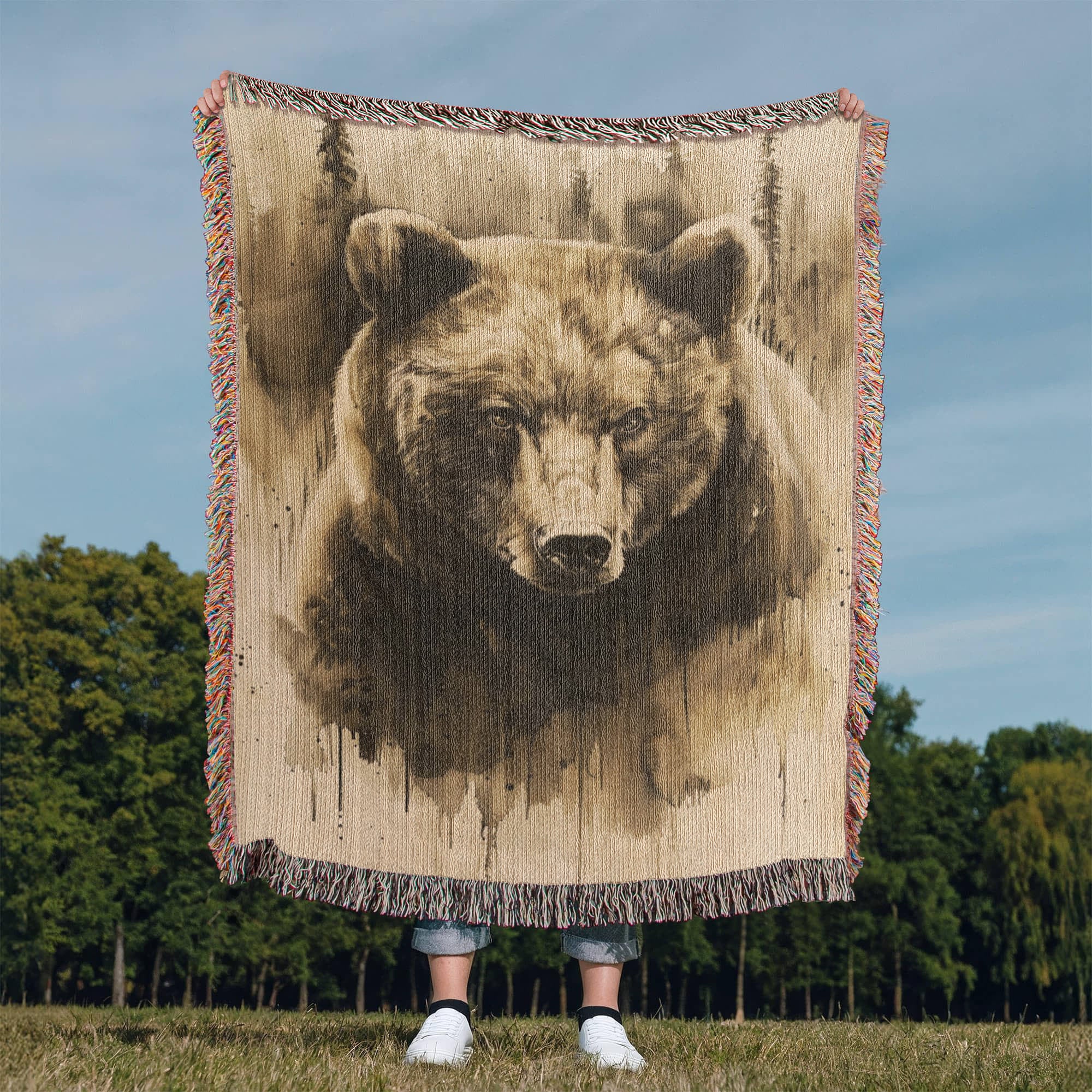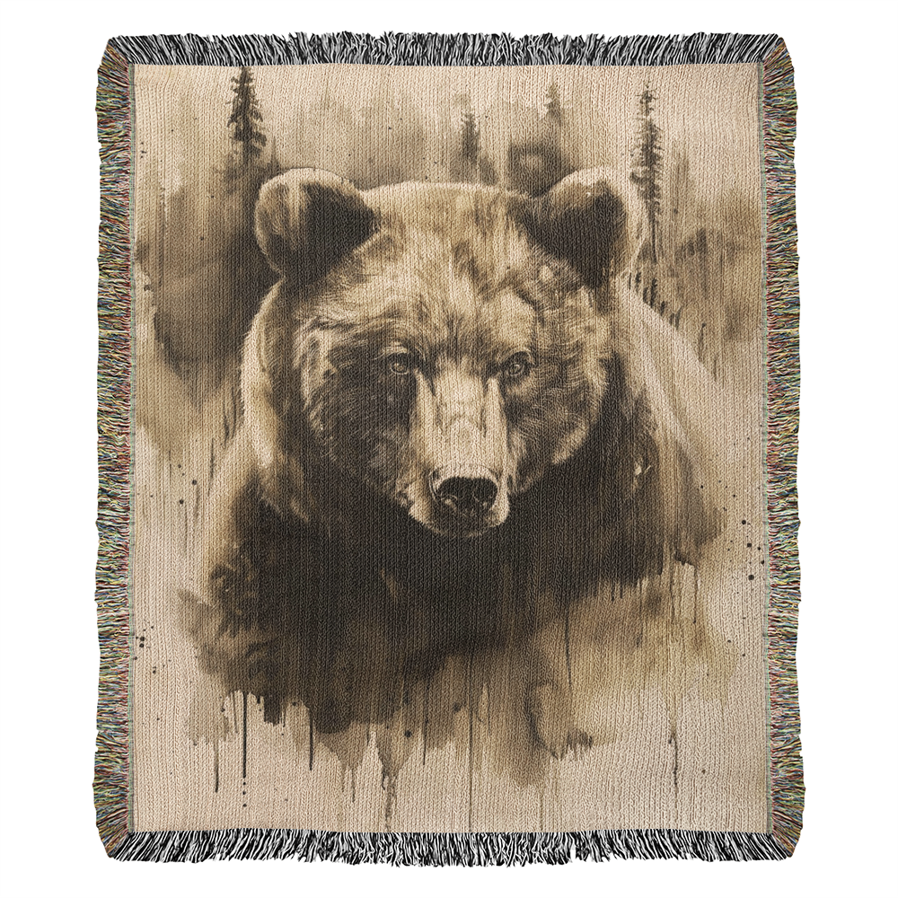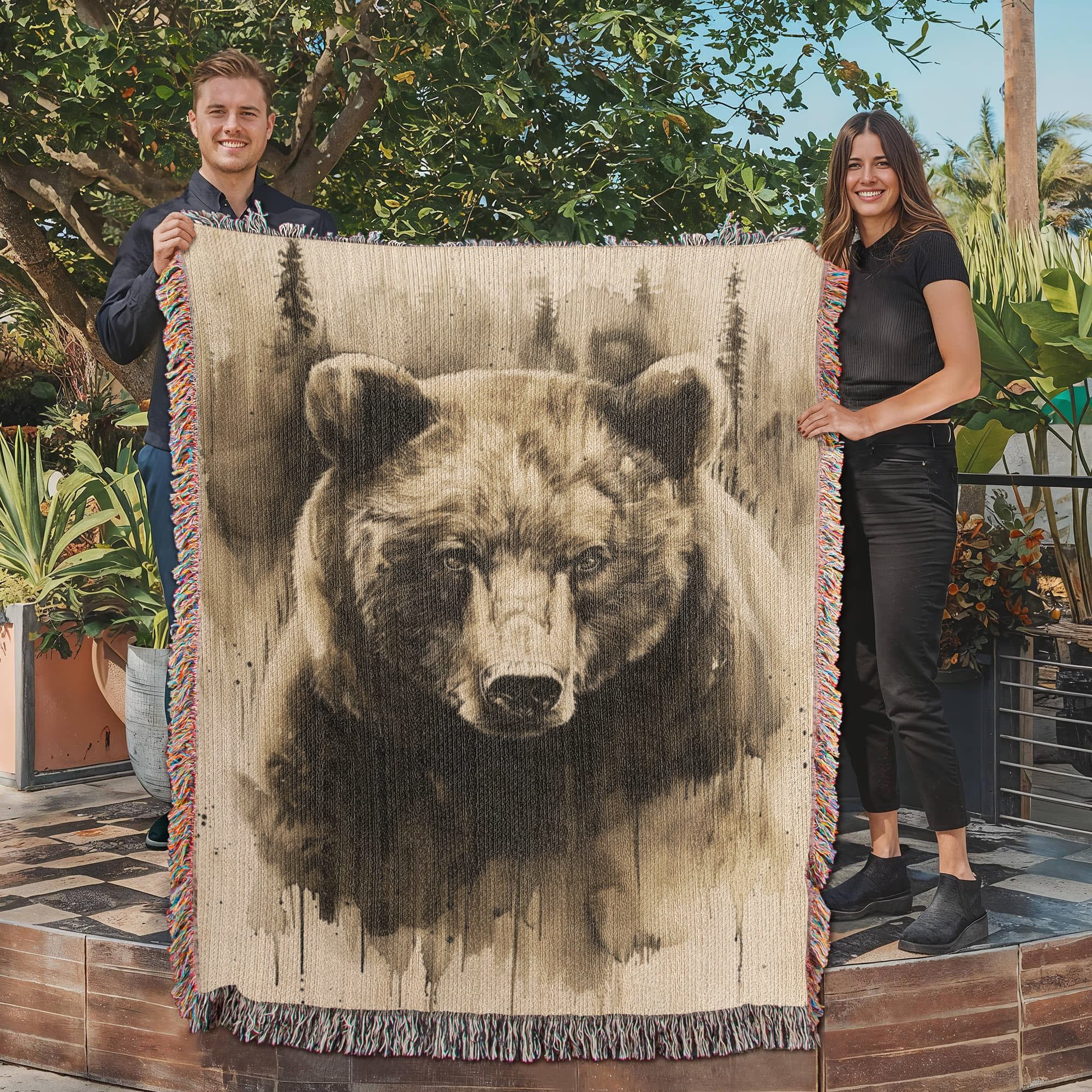 Forest Watcher Woven Blanket – Watercolor Bear in Woodland Mist