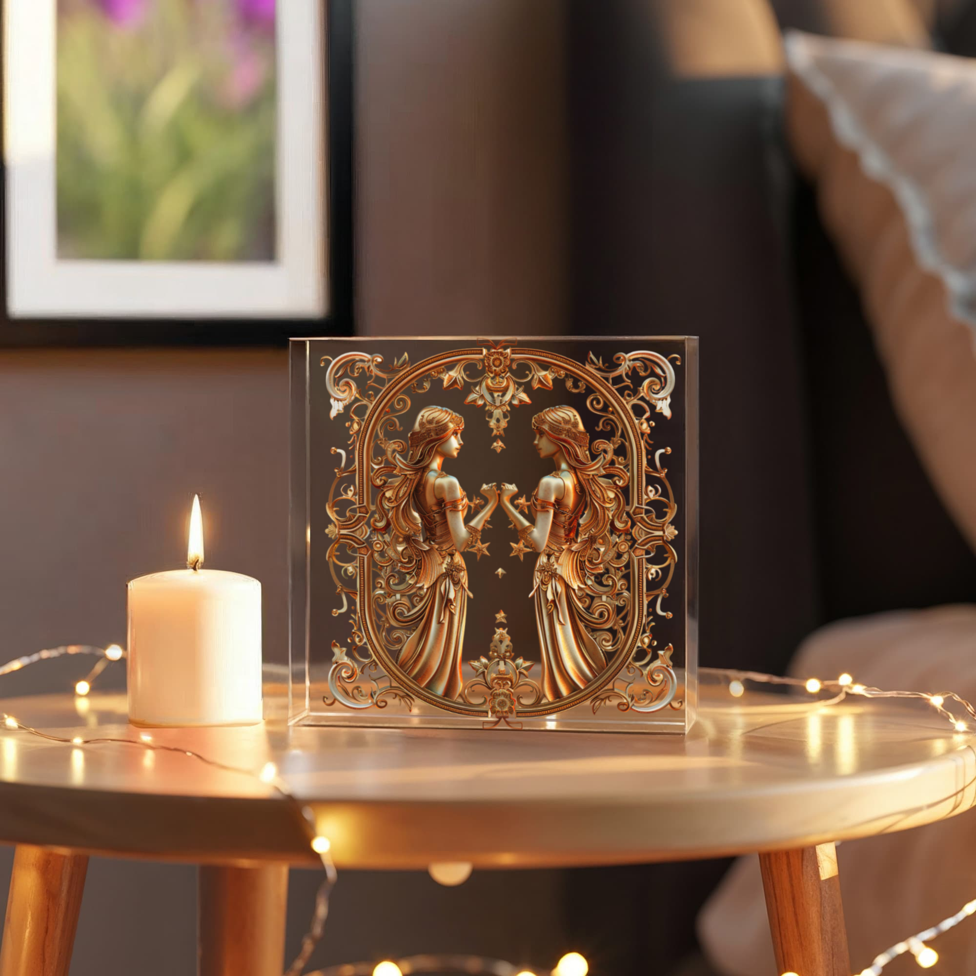Celebrate the dual nature of Gemini with this exquisite Zodiac Art Block. Featuring mirrored twin figures surrounded by ornate filigree and celestial accents, this design captures Gemini’s charm, curiosity, and light-hearted duality. The metallic-look artwork glows in copper and silver tones, creating a dimensional illusion that feels both timeless and enchanting under soft light.