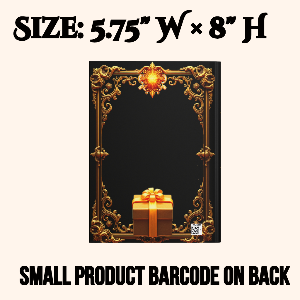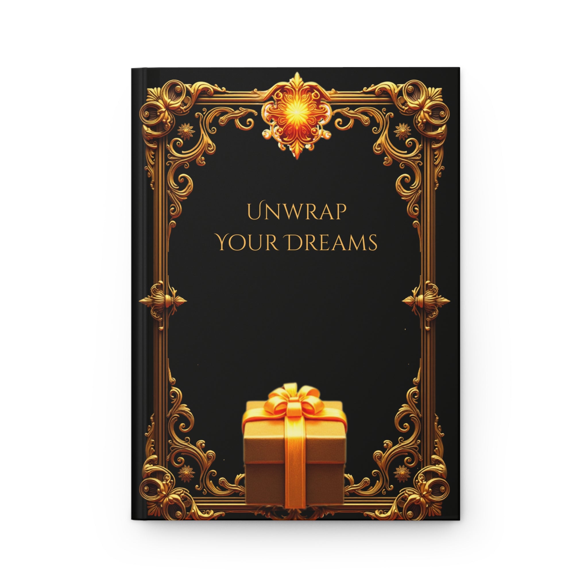 This enchanting gift-themed journal blends ornate golden elegance with a touch of magical celebration. The cover features a glowing decorative crest, intricate filigree framing, and a beautifully wrapped golden gift box, creating the look of a luxurious vintage spellbook. The embossed-look artwork provides a rich, heirloom feel, while the journal itself has a smooth printed finish. With the phrase “Unwrap Your Dreams” elegantly displayed, this journal invites you—or someone special—to step into moments of reflection, gratitude, and possibility.