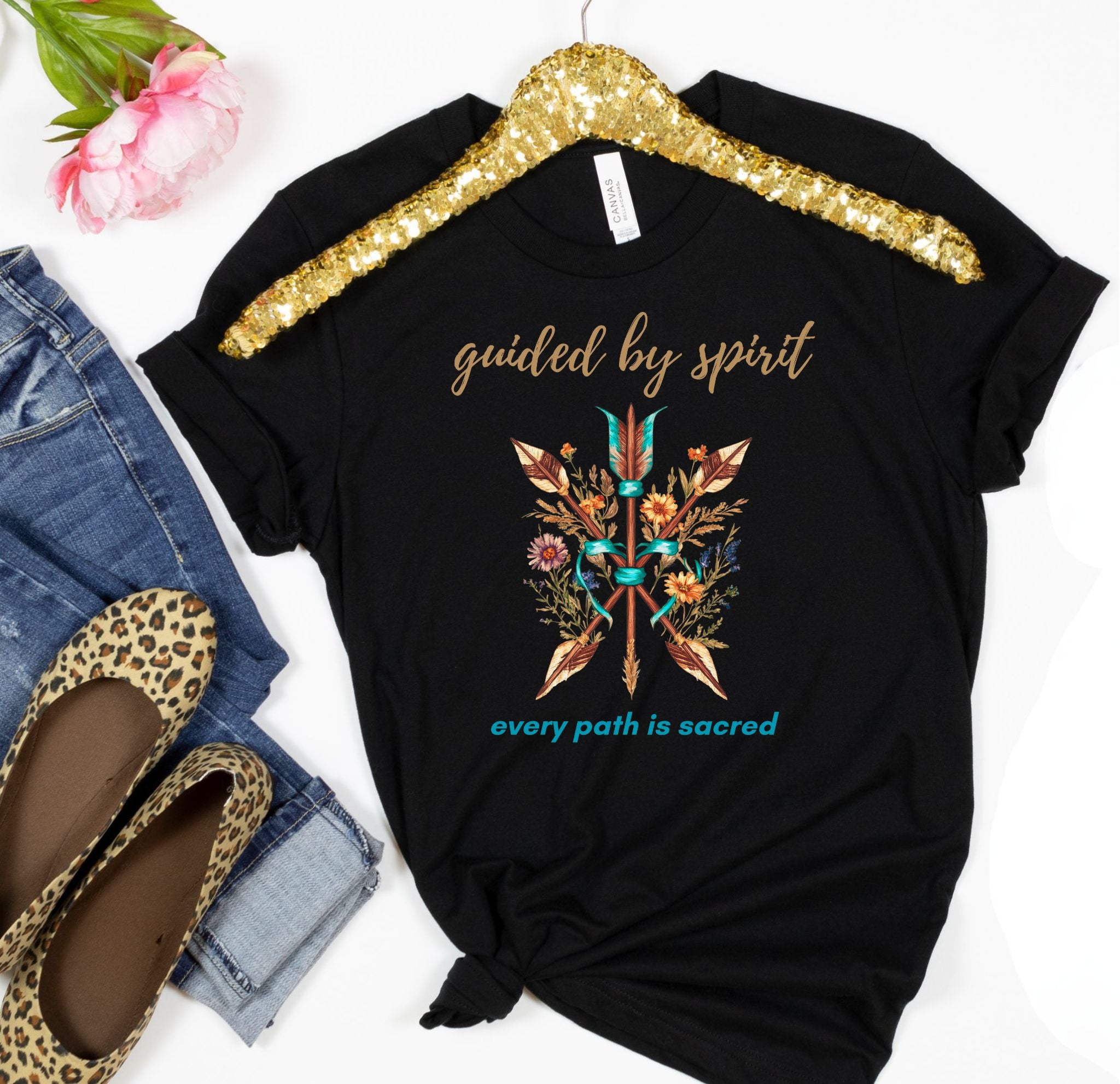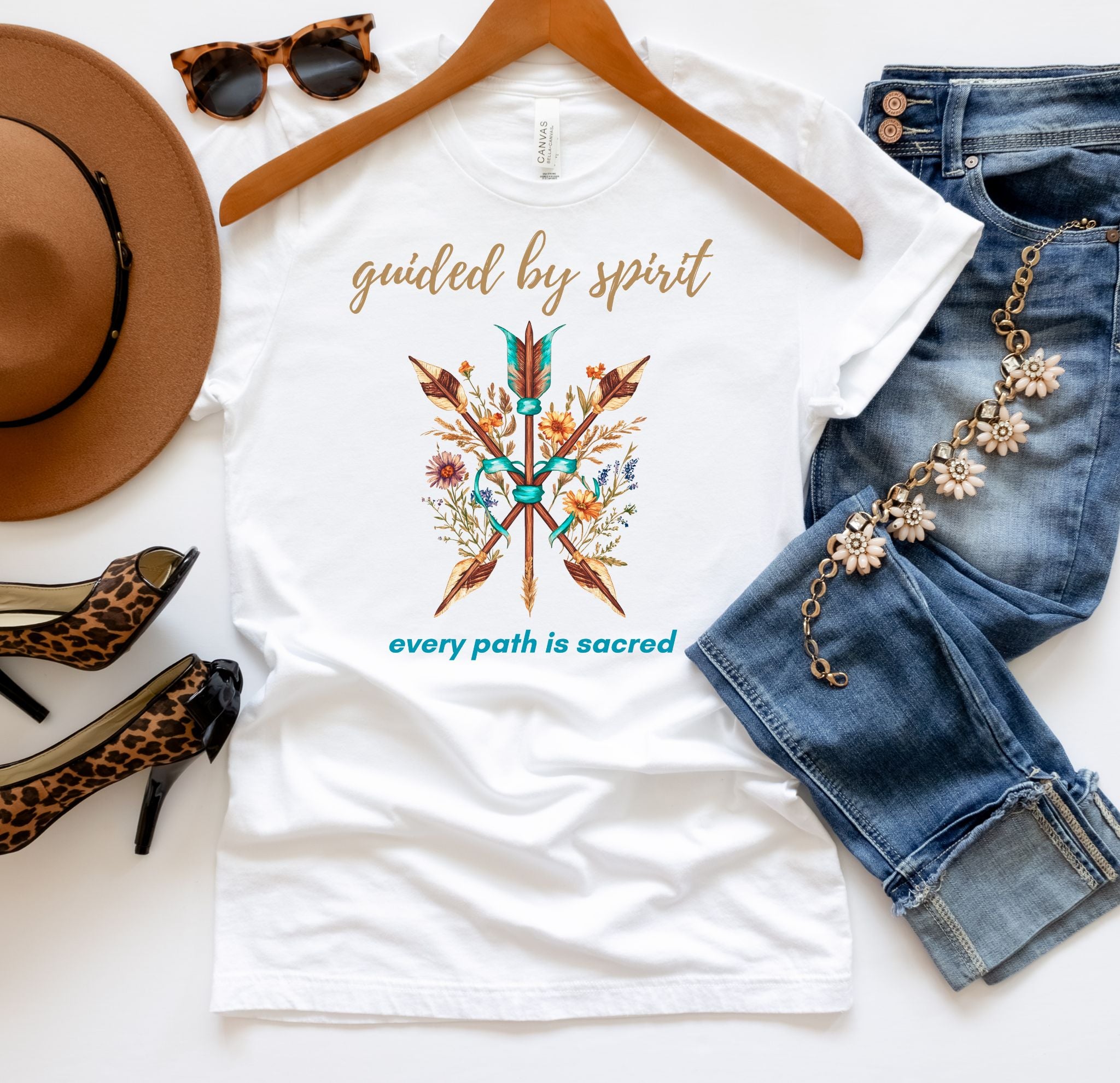🌿 Guided by Spirit. Grounded in Beauty. This earthy boho tee features a bouquet of wildflowers and crossed arrows tied with sky-blue ribbon — a symbol of spiritual direction, inner strength, and the sacred path you're walking.
