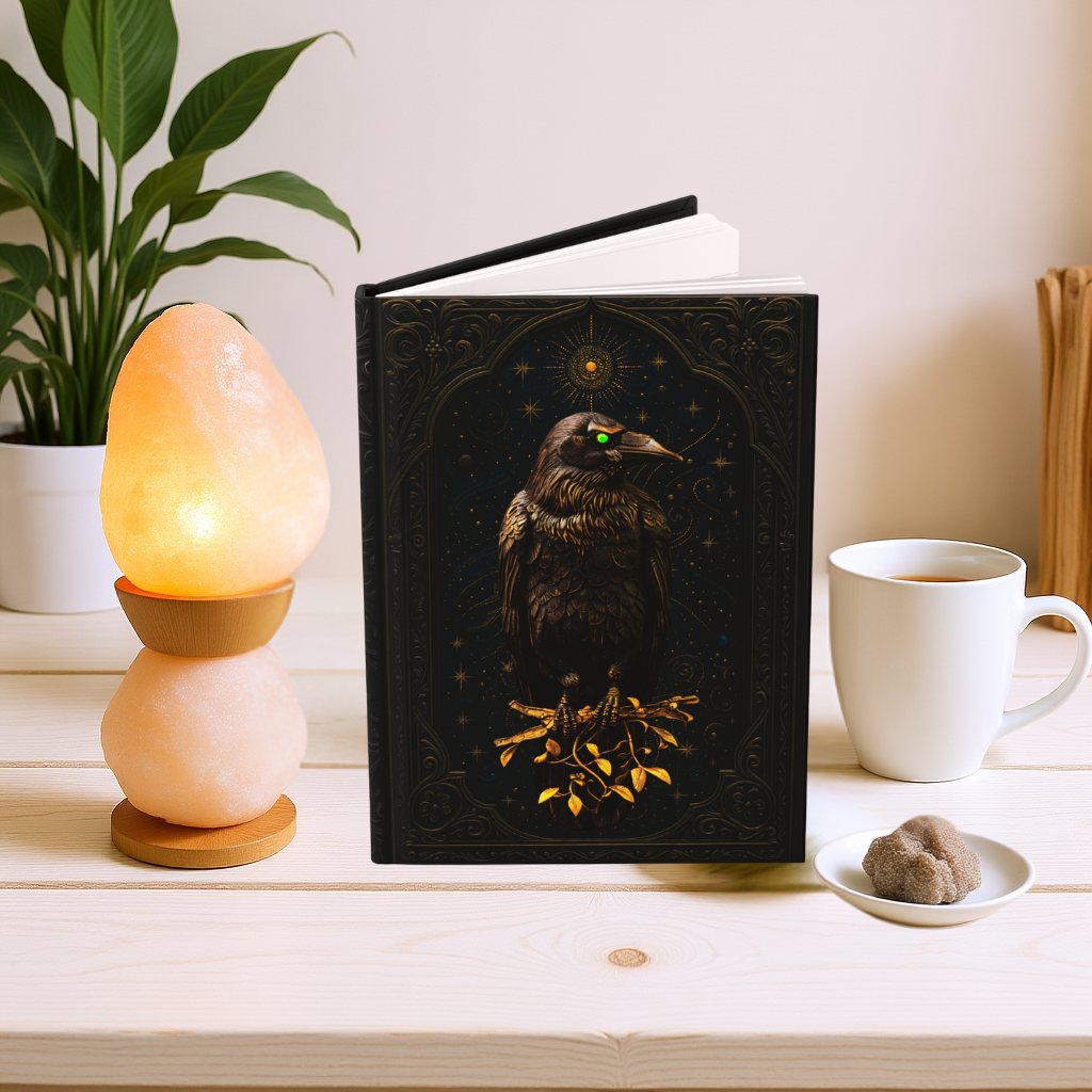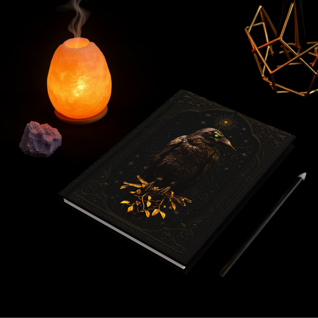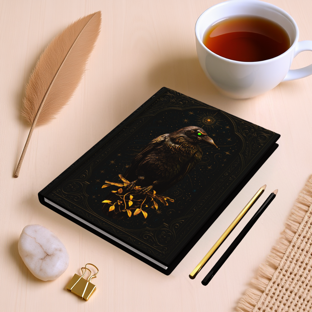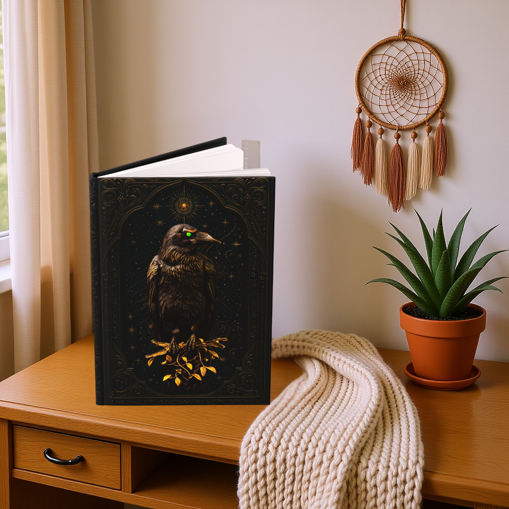 Gaze into the mysteries of the night with this gothic raven journal, where wisdom and shadow meet under the stars. The striking black raven perches beneath a cosmic sky, watching over your every word. Golden flourishes and celestial etchings surround this regal bird, making it a powerful piece for anyone drawn to the mystical and arcane.