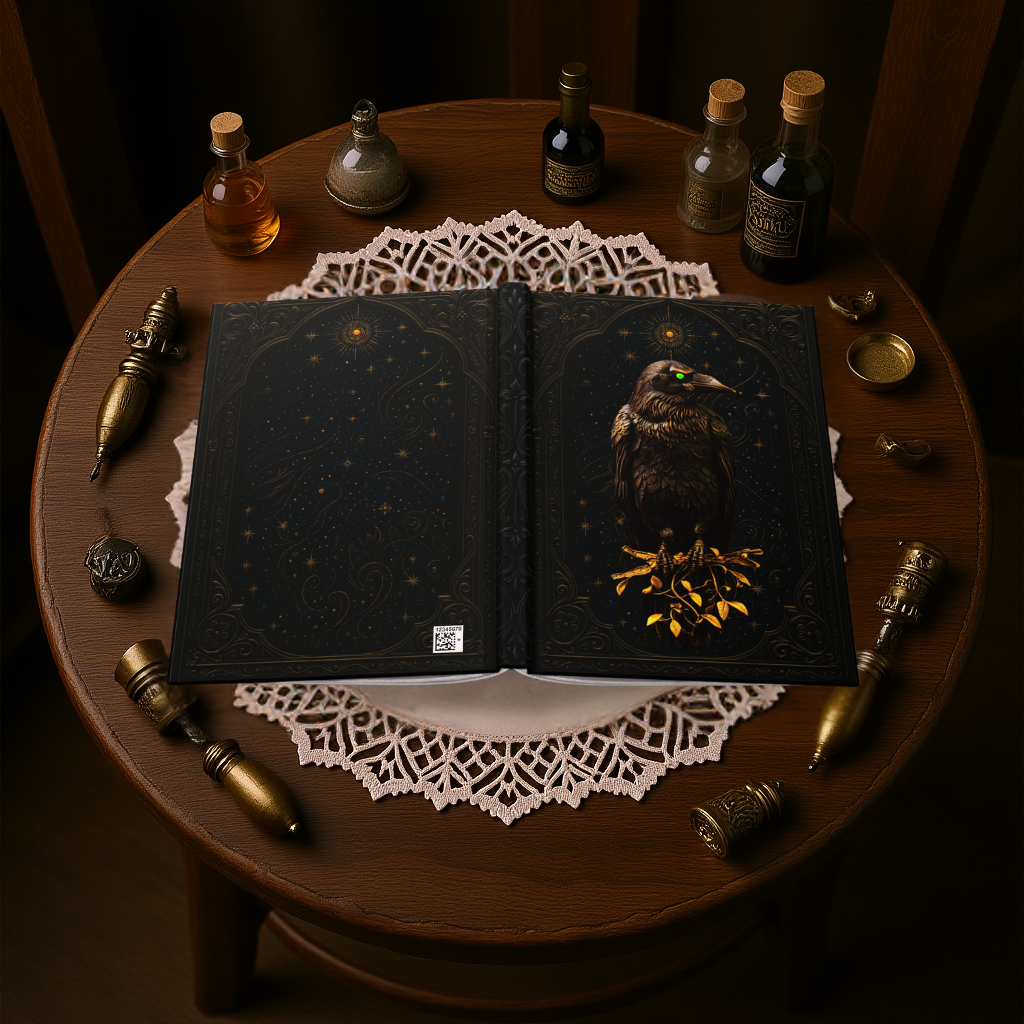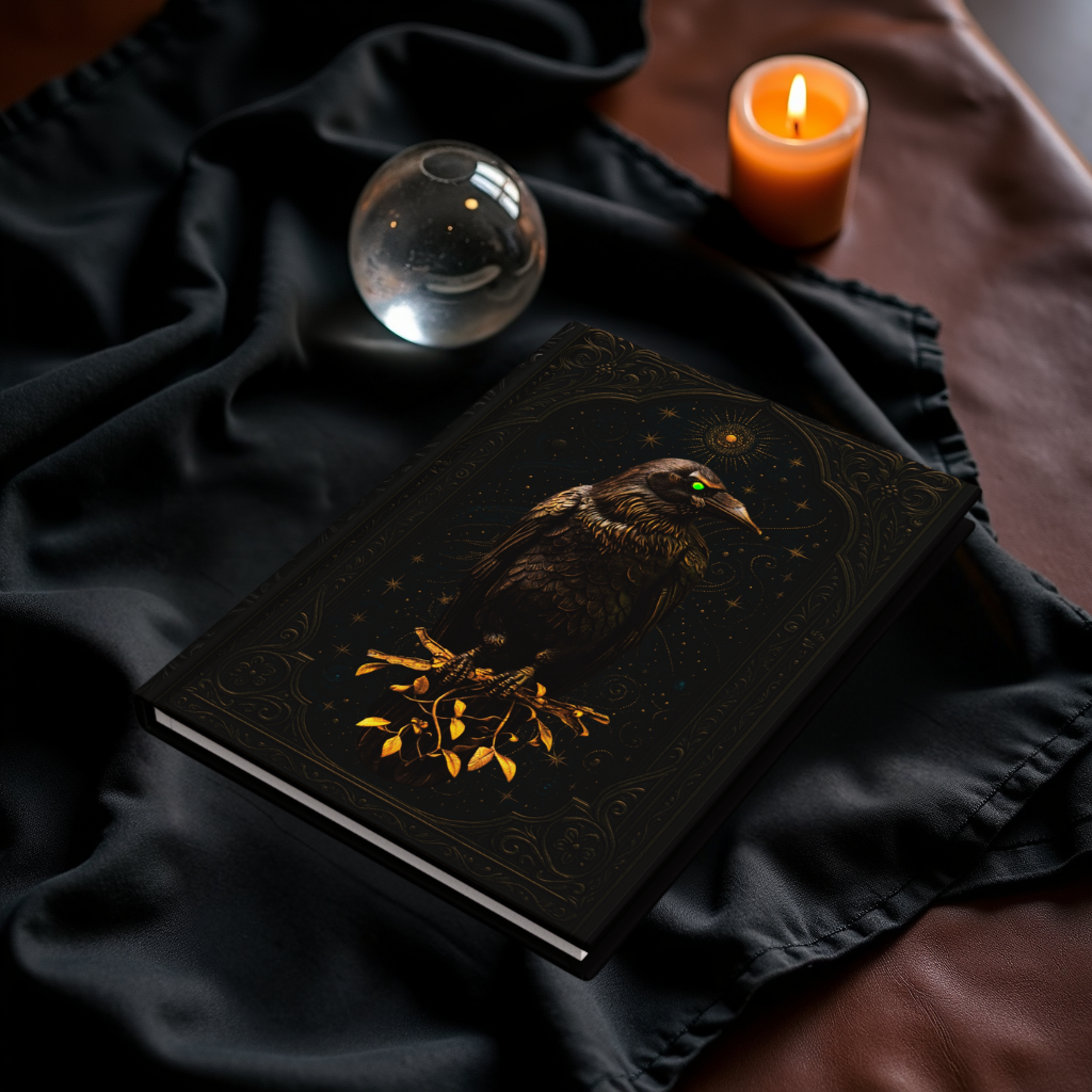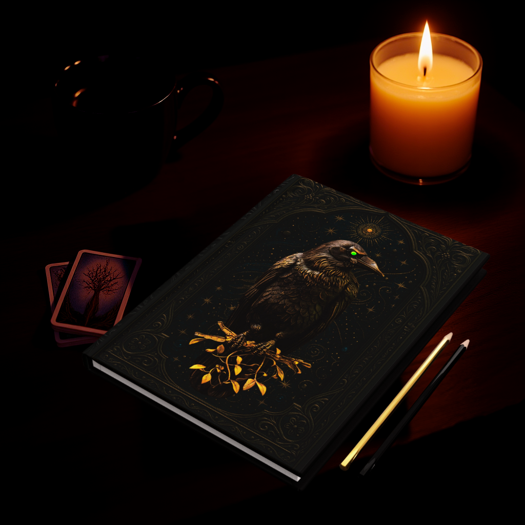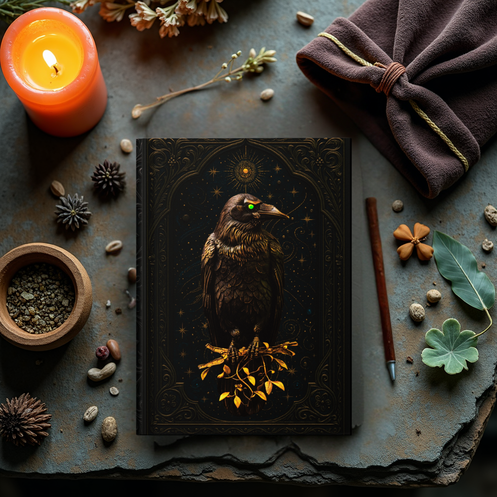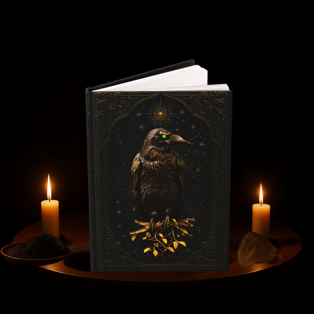 Gaze into the mysteries of the night with this gothic raven journal, where wisdom and shadow meet under the stars. The striking black raven perches beneath a cosmic sky, watching over your every word. Golden flourishes and celestial etchings surround this regal bird, making it a powerful piece for anyone drawn to the mystical and arcane.