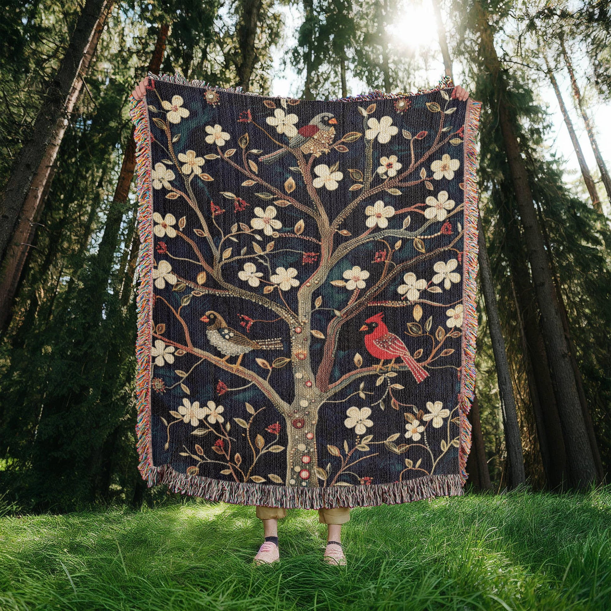 Our “Blossom & Birds” Heirloom Woven Blanket is a tribute to springtime renewal, crafted with intricate detail and rich texture. Featuring a vibrant embroidered-style tree blooming with cream blossoms, delicate leaves, and perched birds—including a radiant cardinal—this tapestry-style blanket brings warmth, beauty, and soul to any space.