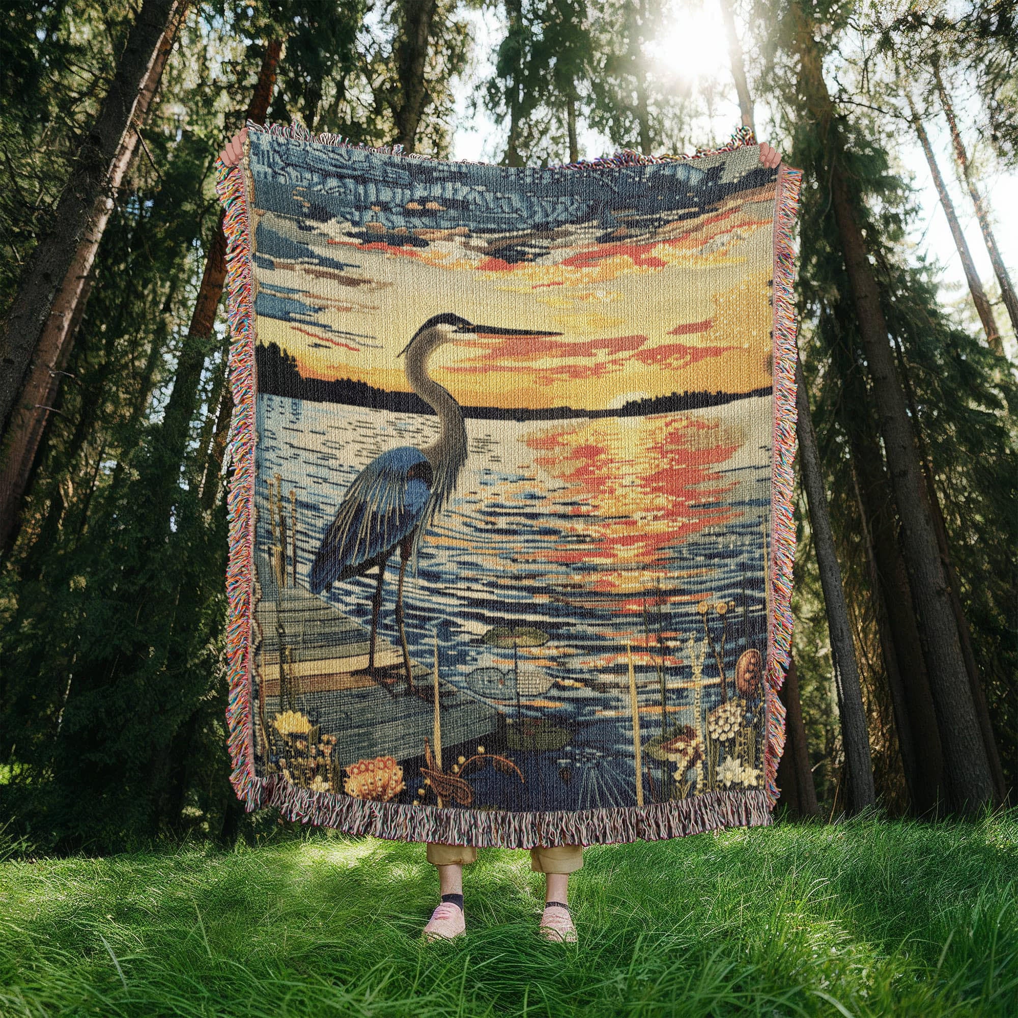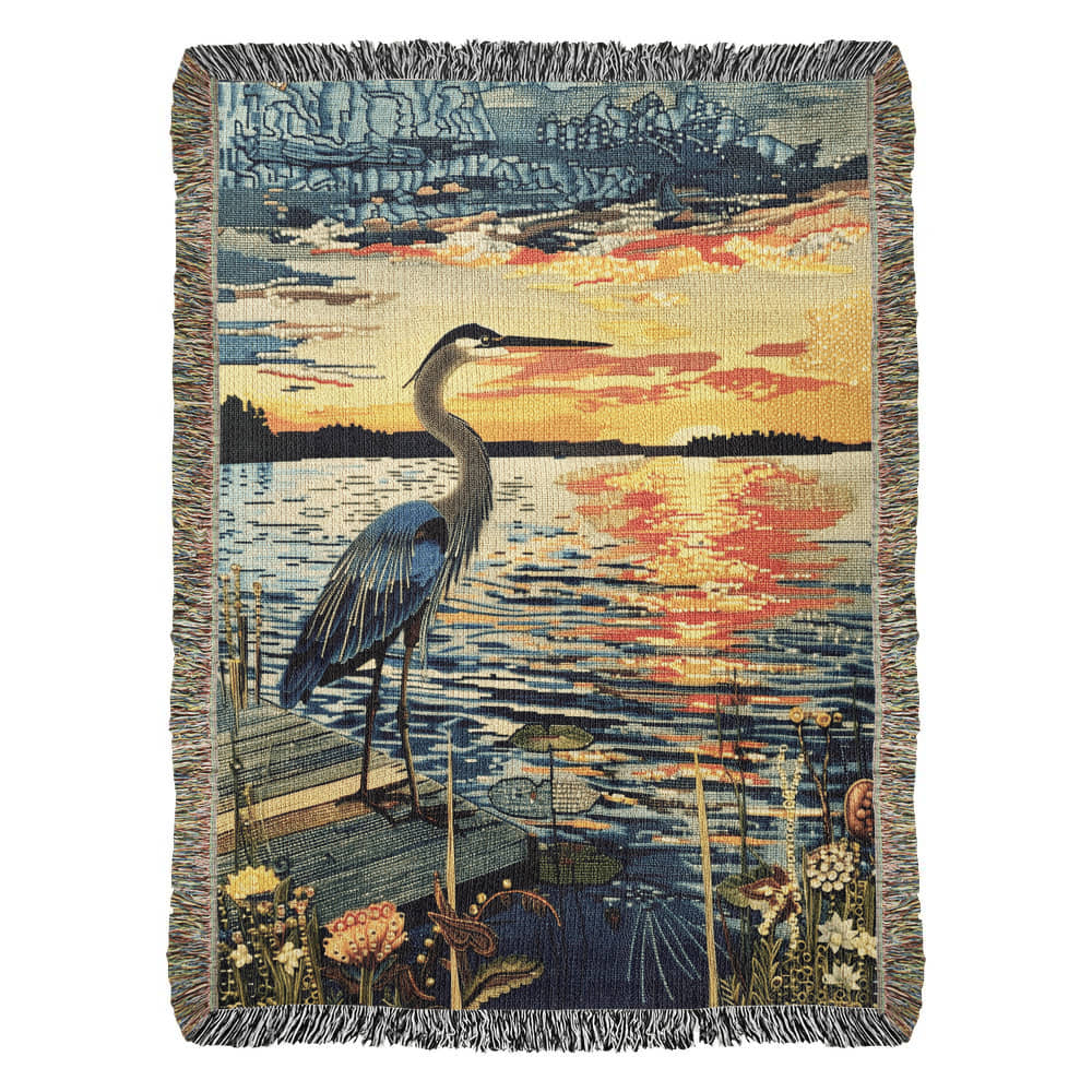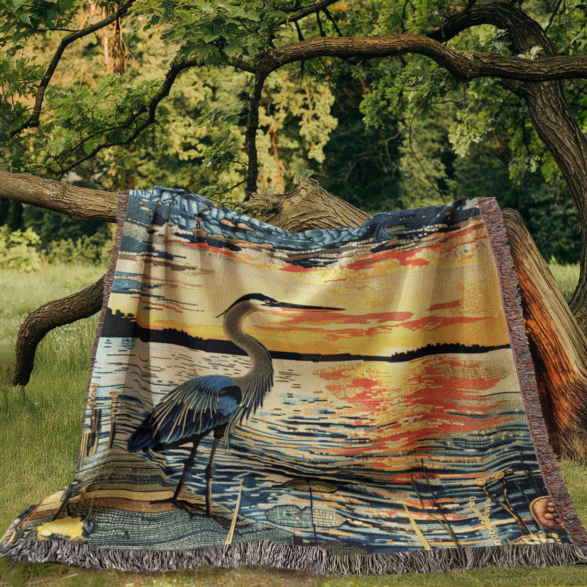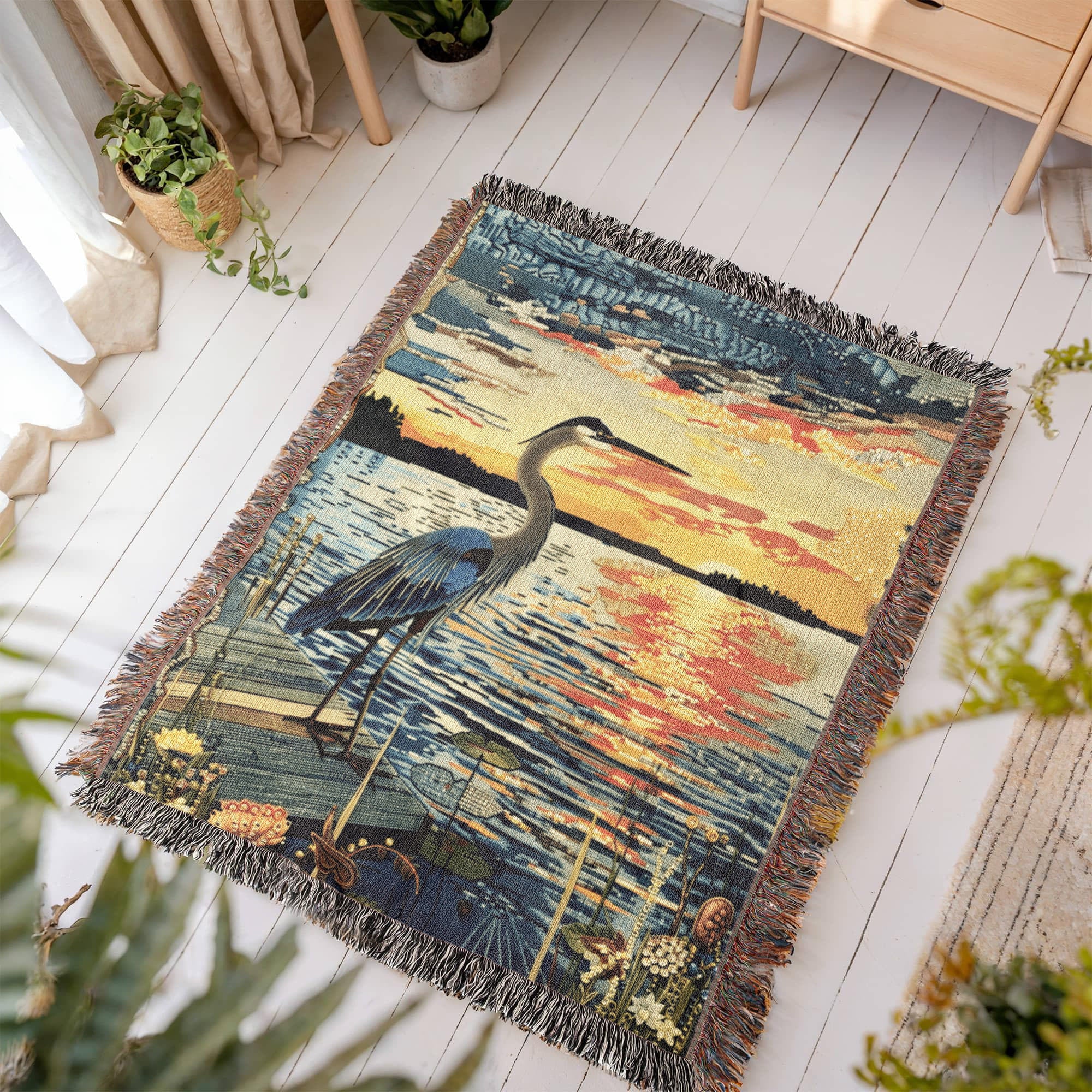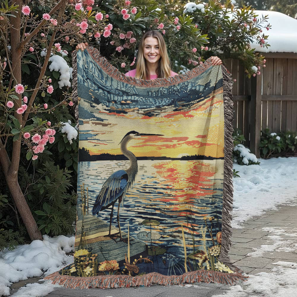 Sunset Heron Watch | Tranquil Lake Scene Woven Blanket for Nature-Inspired Living
