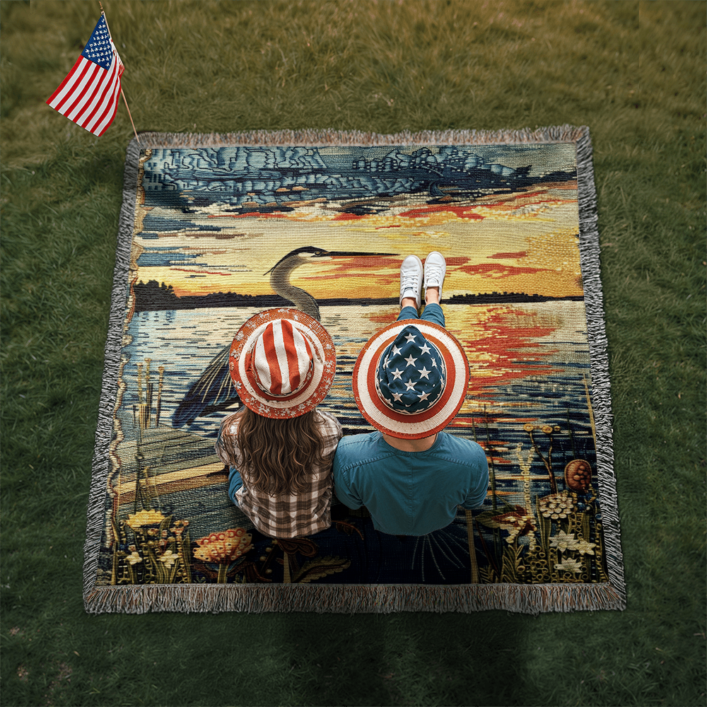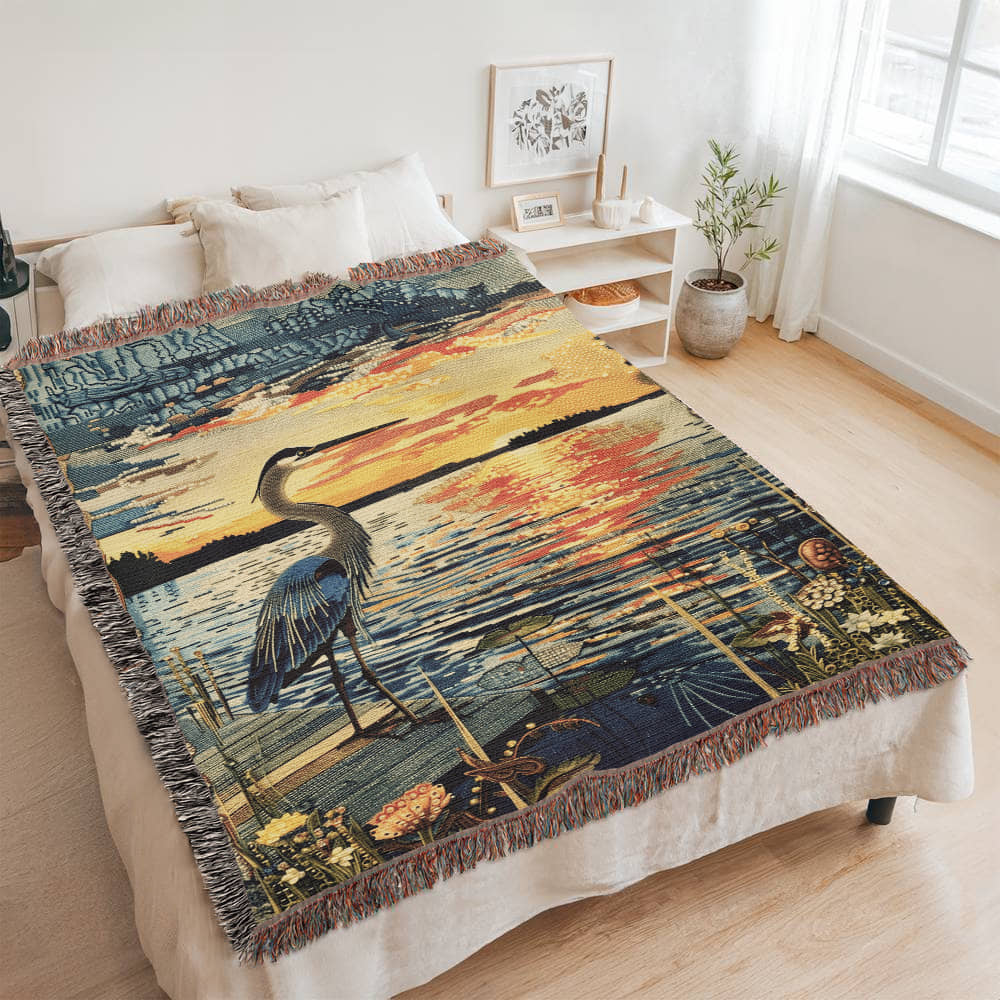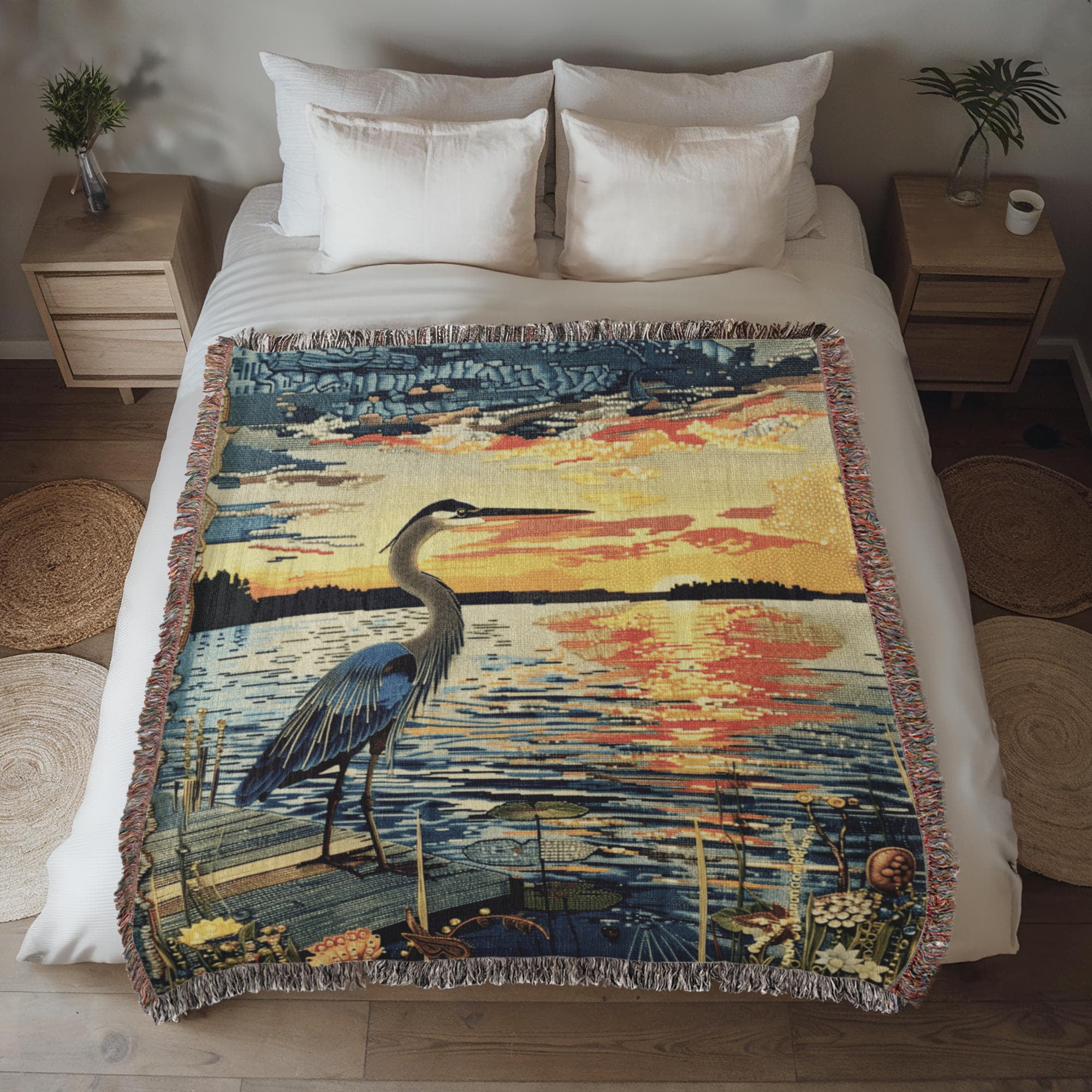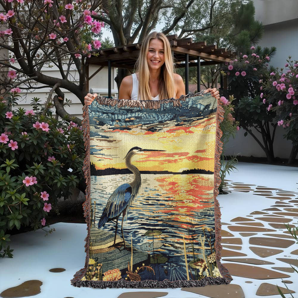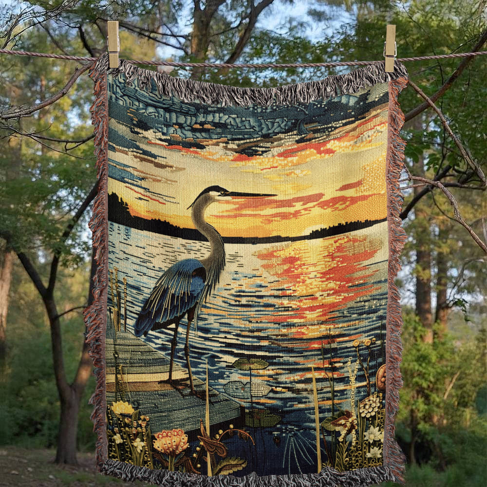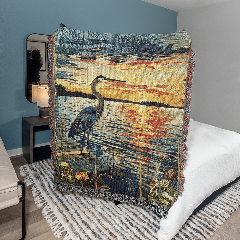 Sunset Heron Watch | Tranquil Lake Scene Woven Blanket for Nature-Inspired Living