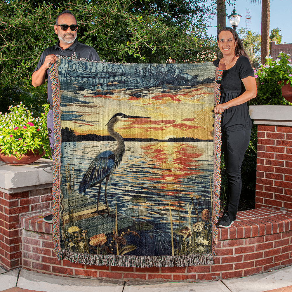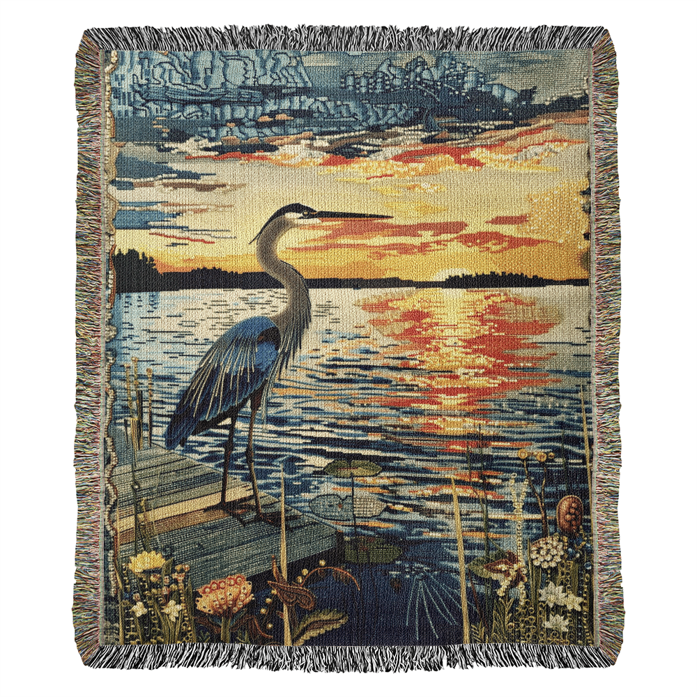This heirloom-quality woven blanket captures a breathtaking lakeside moment—just as the sun dips below the horizon and a solitary heron stands poised in quiet observation. The water shimmers with golden hues, skies glow with painterly blues and pinks, and native wildflowers frame the scene like a stitched memory.