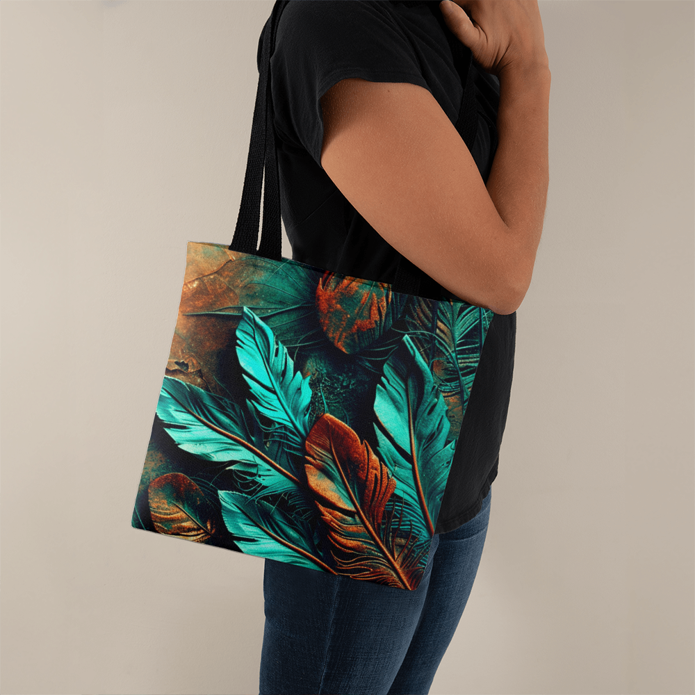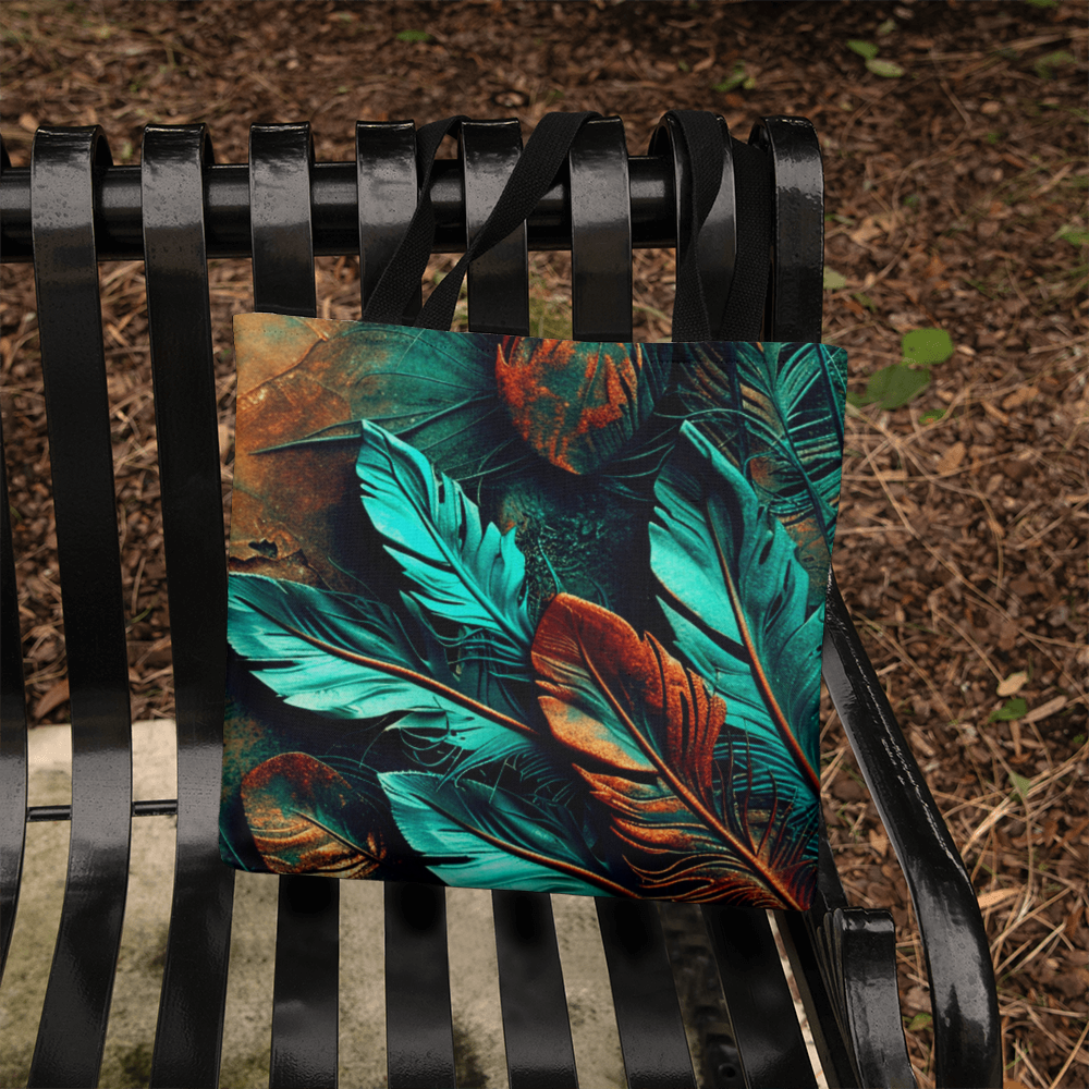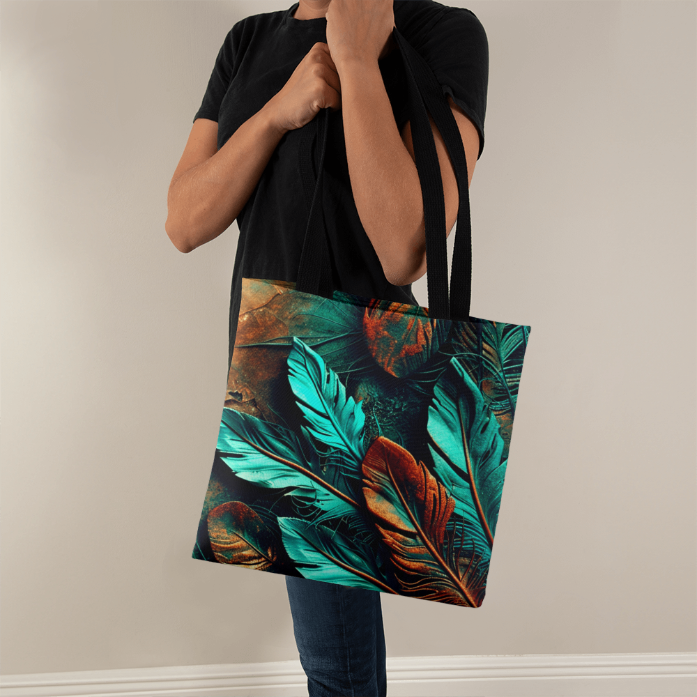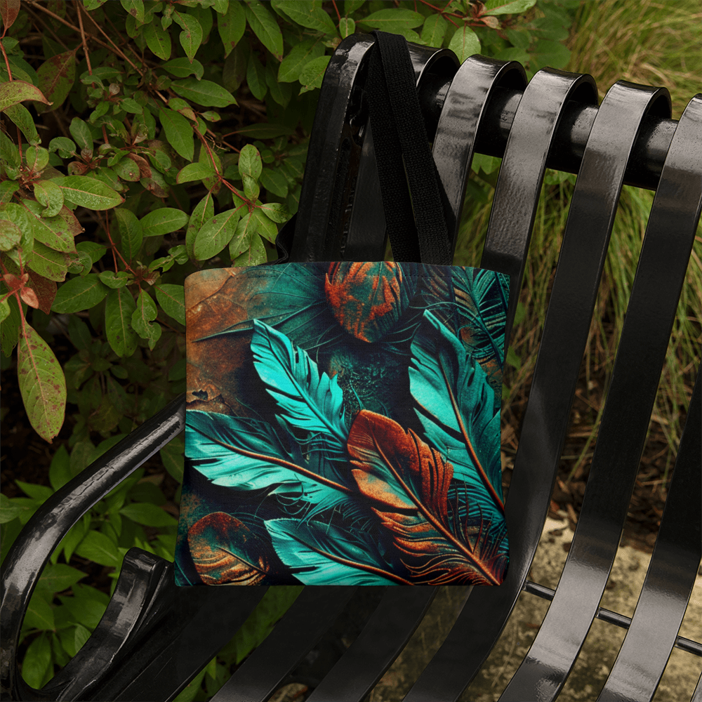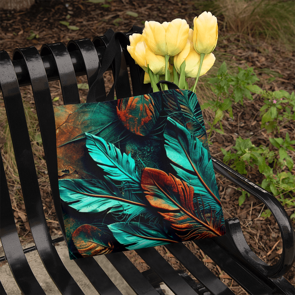 Step into your boldest boho energy with this *Layered-Looking Feather Tapestry Tote Bag*. Featuring a mesmerizing mix of teal, copper, and earthen tones, the feathers look hand-painted and arranged like a sacred totem. Powerful, earthy, and beautifully untamed.