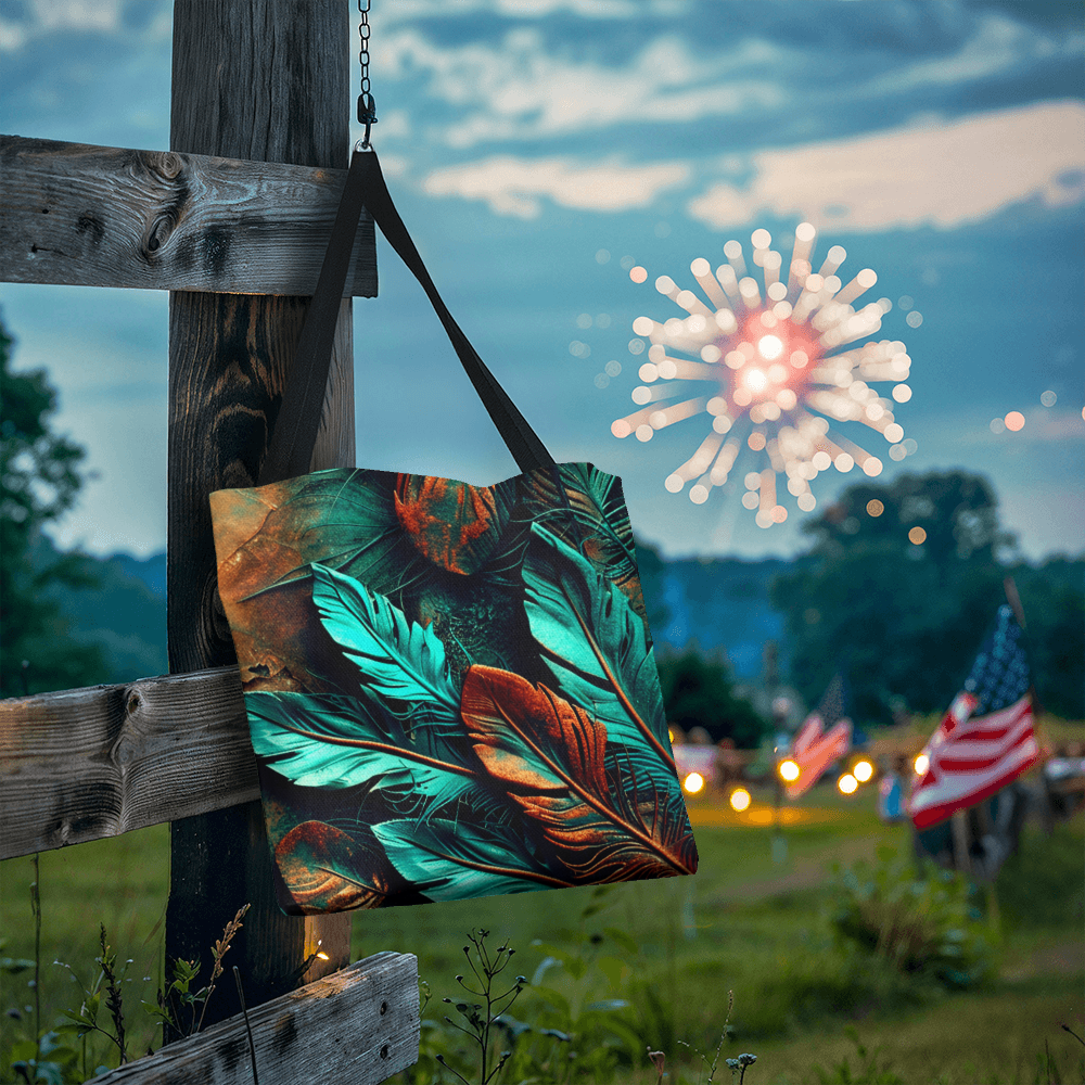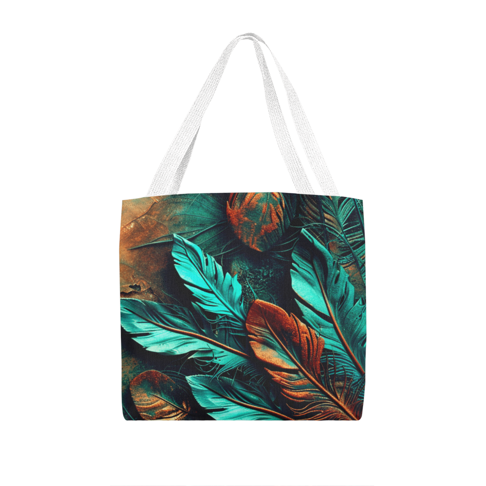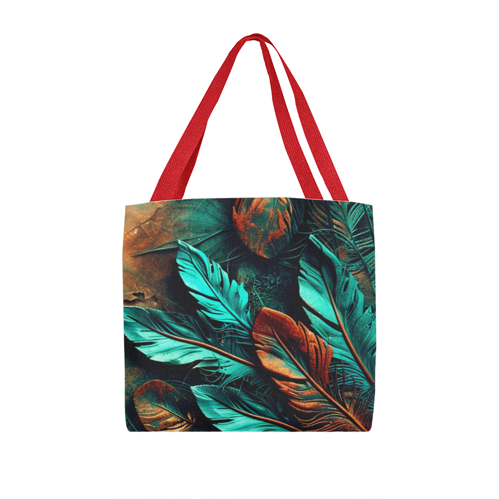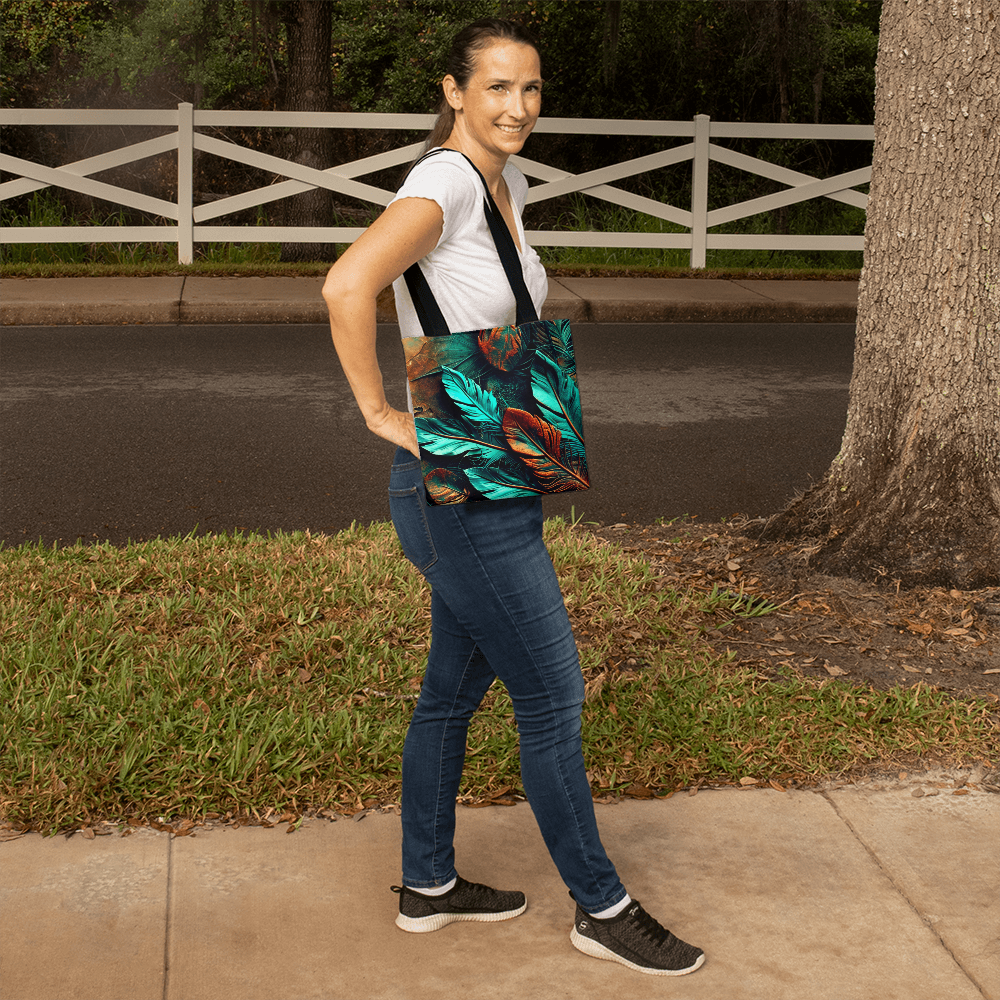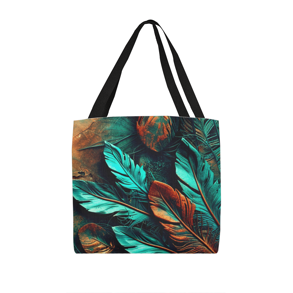 Step into your boldest boho energy with this *Layered-Looking Feather Tapestry Tote Bag*. Featuring a mesmerizing mix of teal, copper, and earthen tones, the feathers look hand-painted and arranged like a sacred totem. Powerful, earthy, and beautifully untamed.