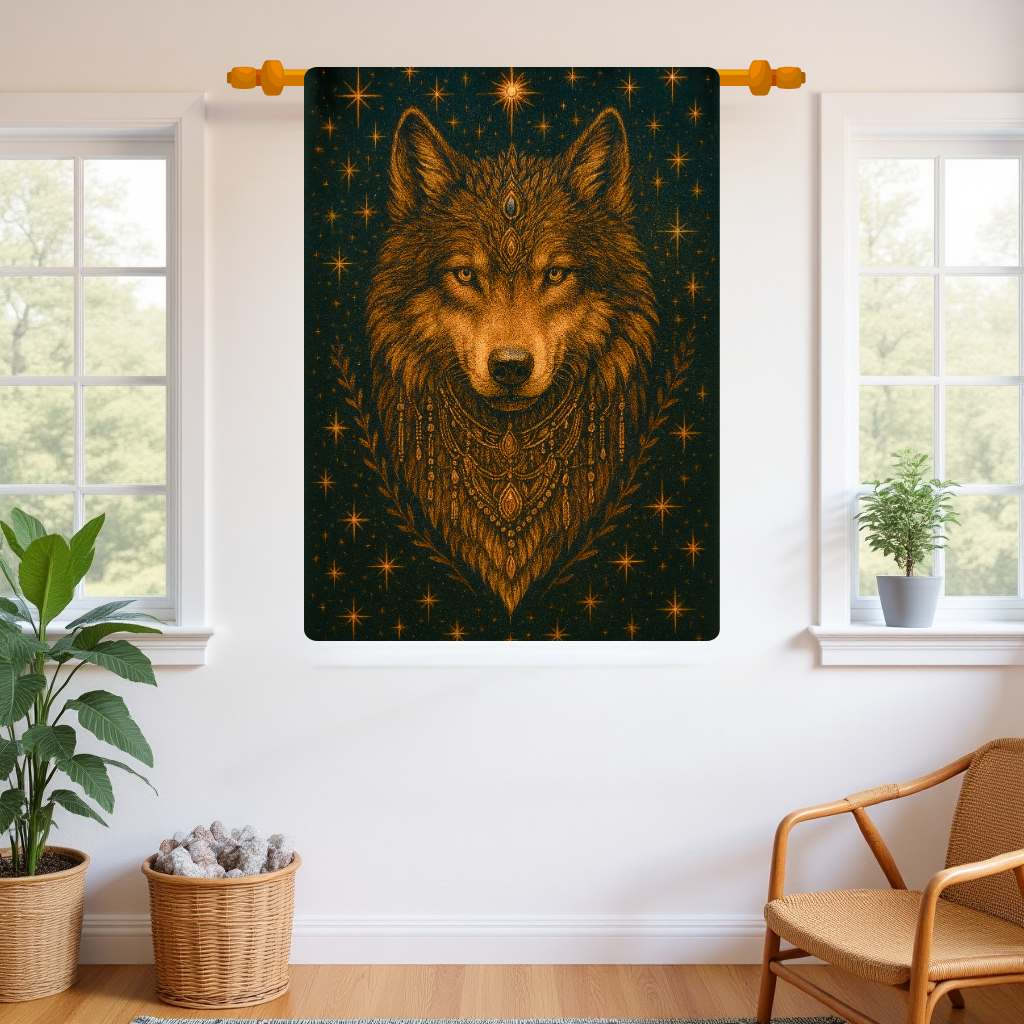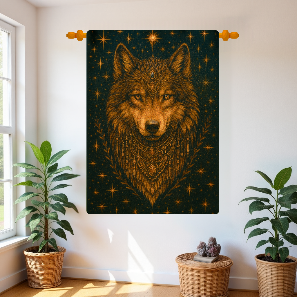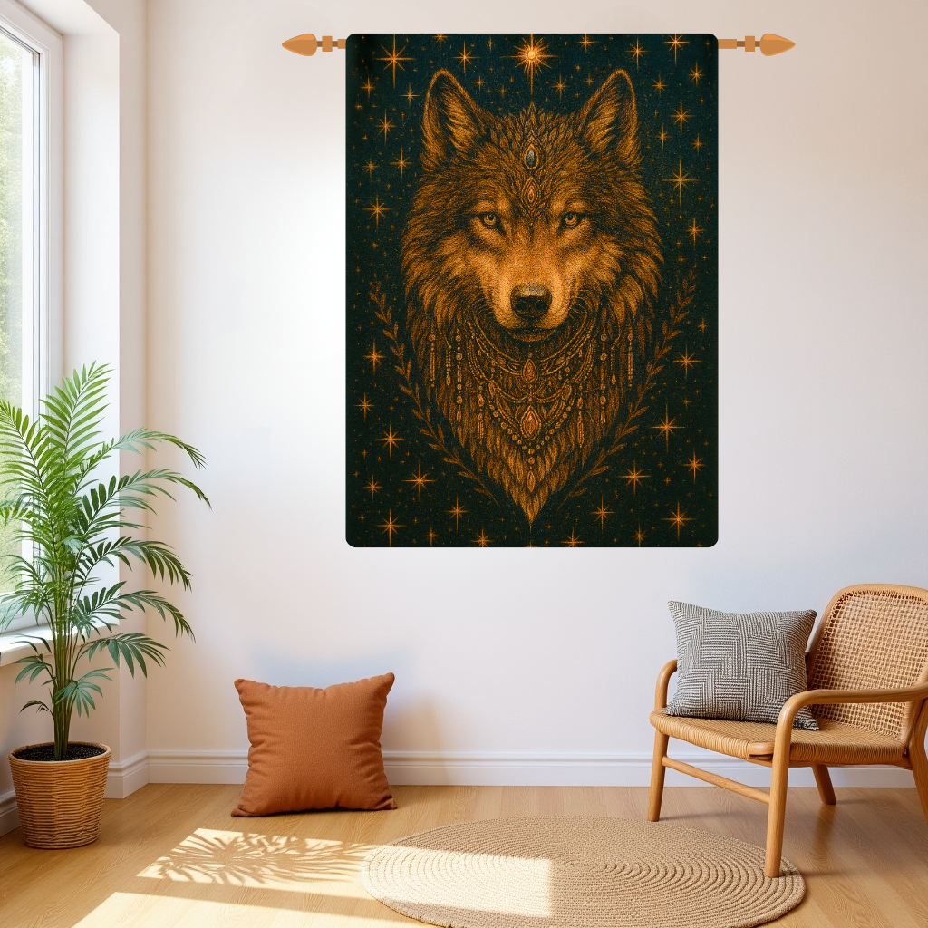 Channel the strength of the wild with this striking woven tapestry, featuring a radiant wolf adorned in celestial motifs and tribal-inspired embellishments. This tapestry captures the spirit of the untamed — protective, powerful, and deeply intuitive — making it a perfect statement piece for your sacred space.