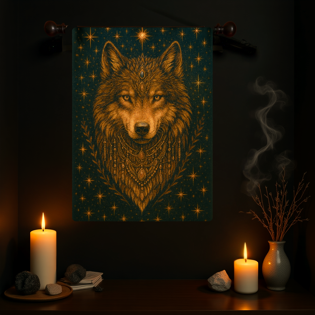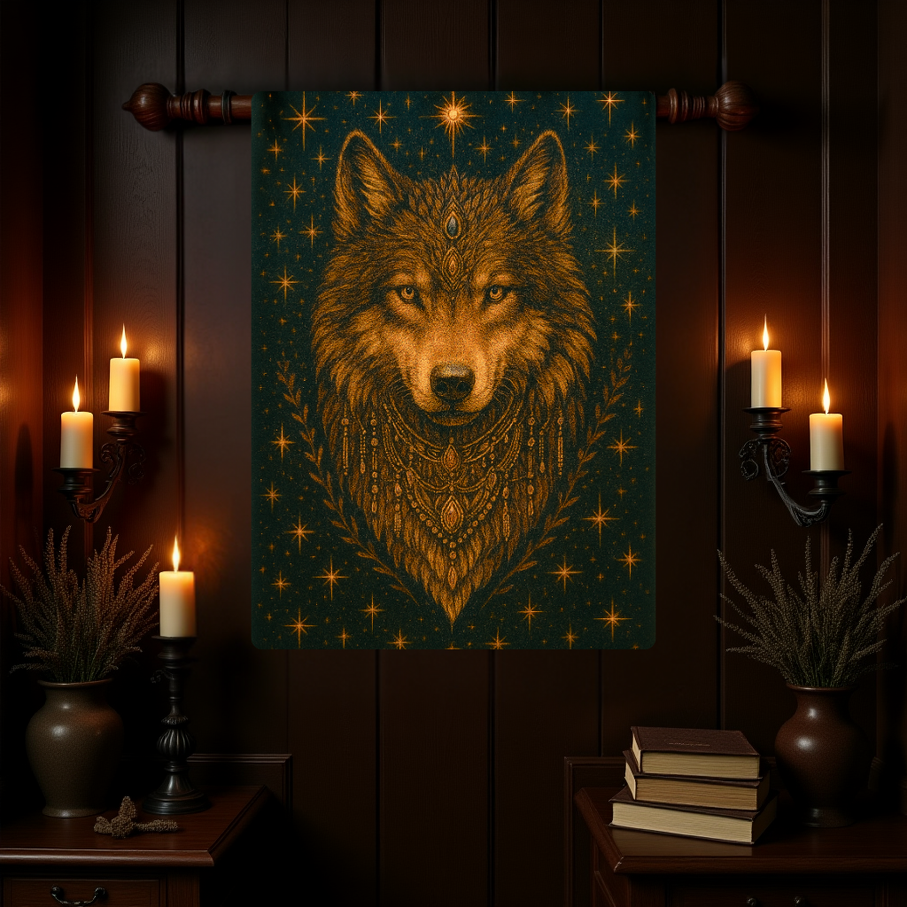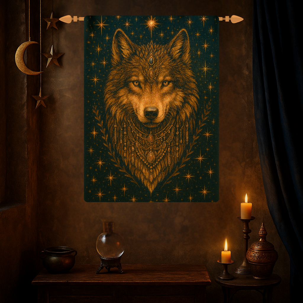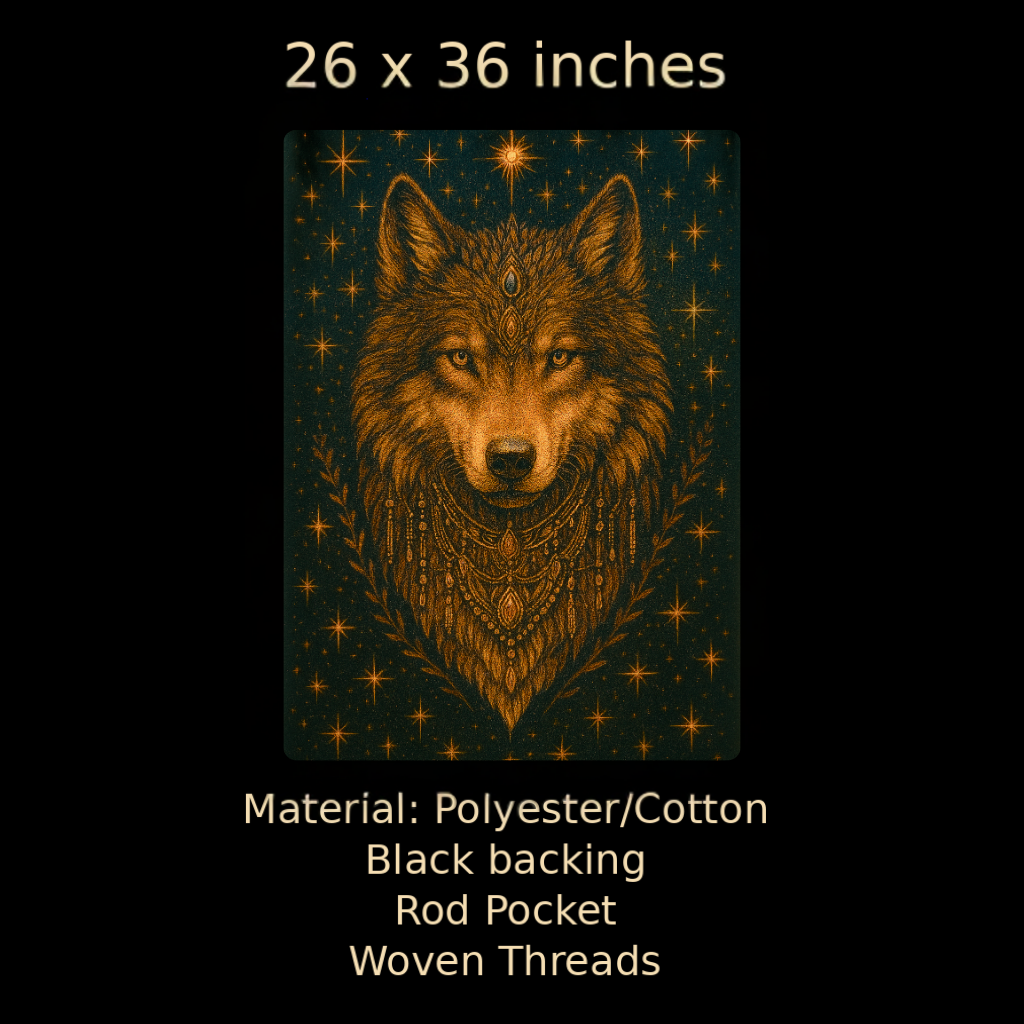 Channel the strength of the wild with this striking woven tapestry, featuring a radiant wolf adorned in celestial motifs and tribal-inspired embellishments. This tapestry captures the spirit of the untamed — protective, powerful, and deeply intuitive — making it a perfect statement piece for your sacred space.