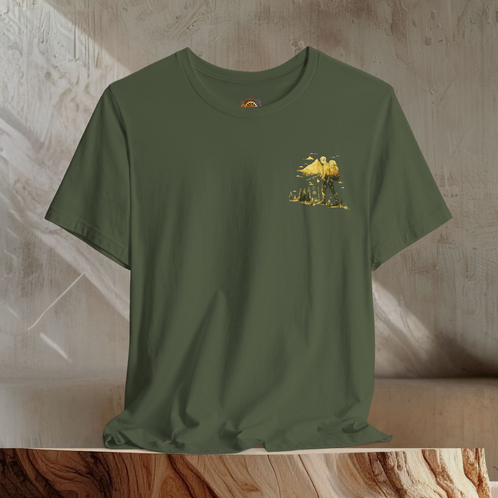 This minimalist mountain hiker t-shirt captures a quiet moment of elevation and reflection—where perseverance, stillness, and connection to the natural world converge. A solitary hiker stands above a mirrored landscape, rendered in warm gold tones that glow subtly against deep, earthy fabric colors.