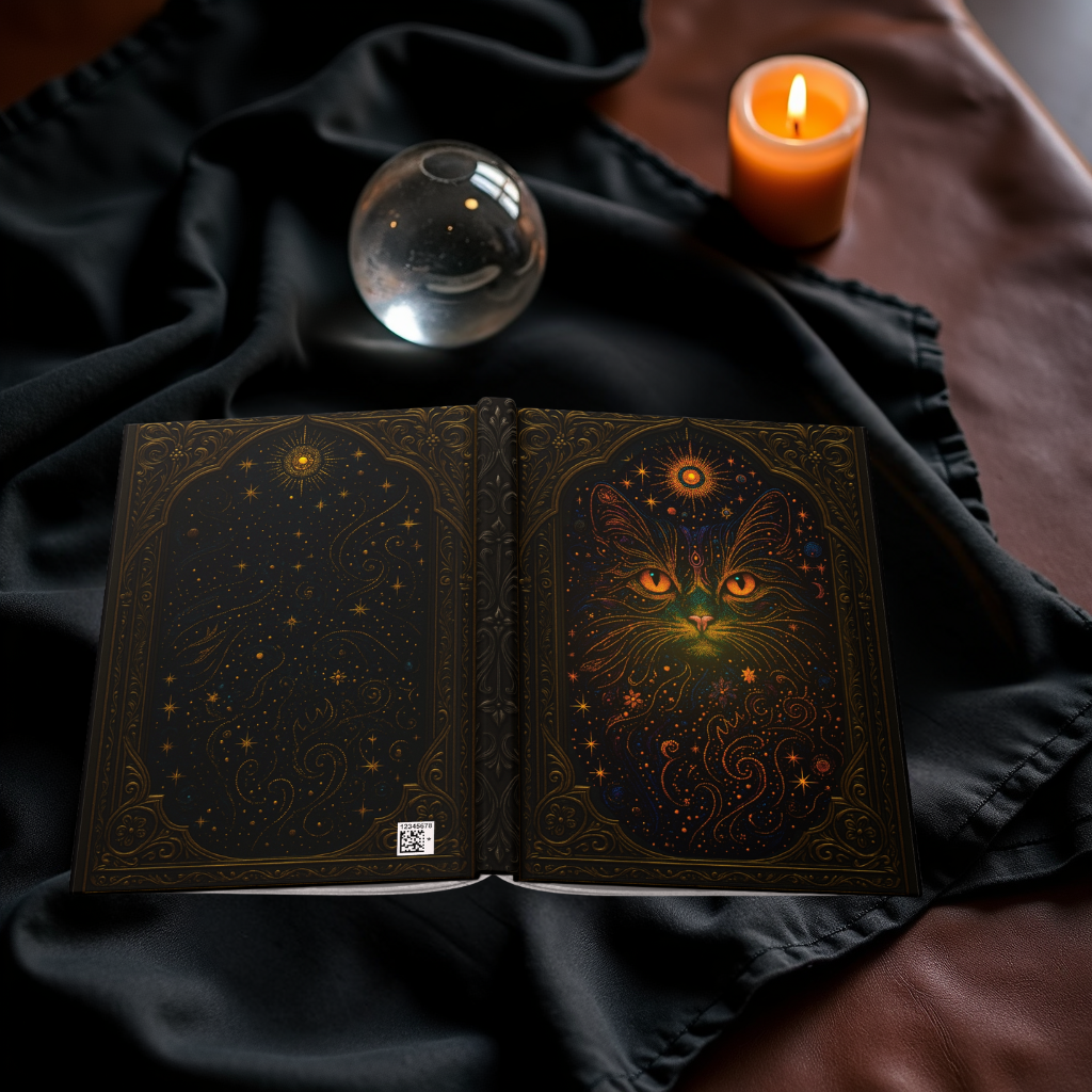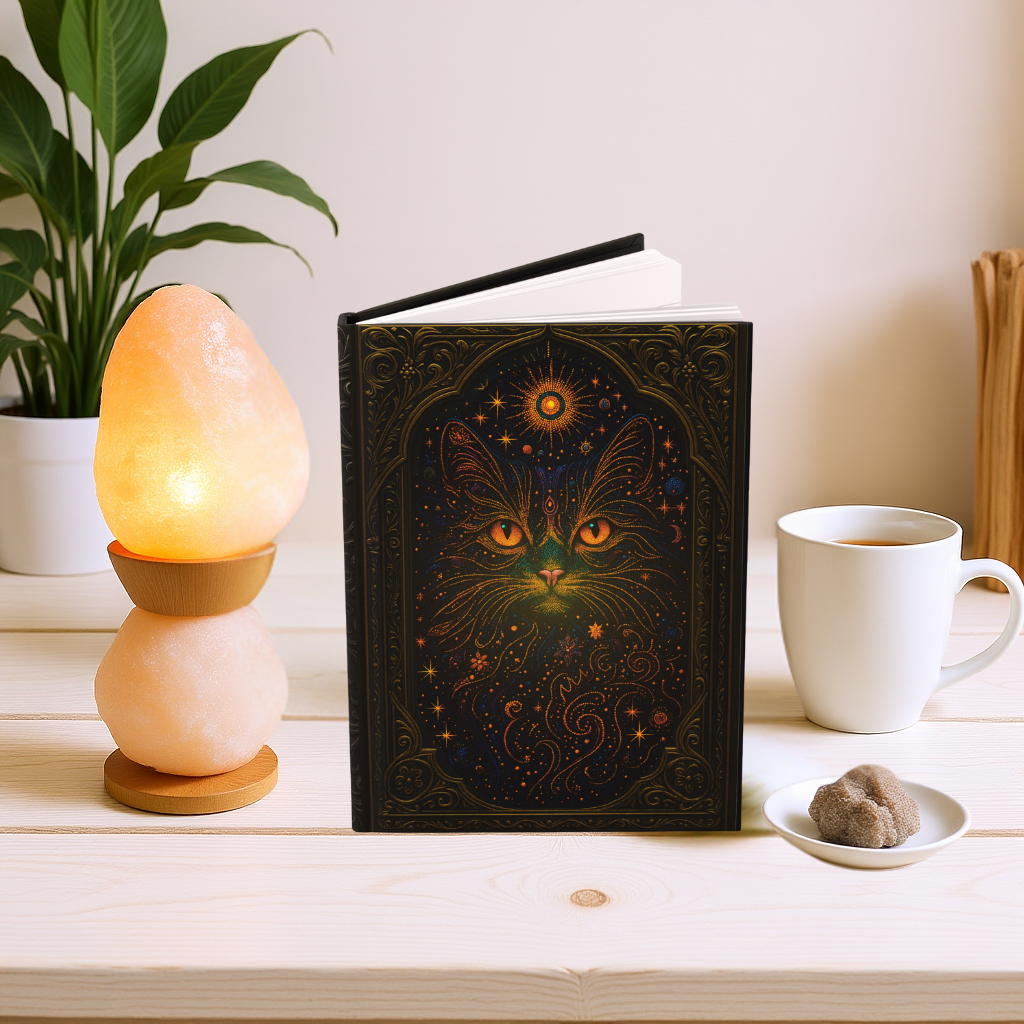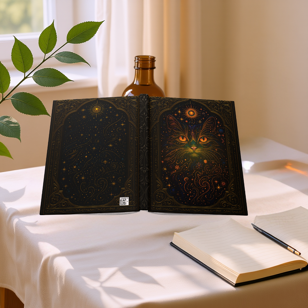The cat sees beyond the veil, walking between light and shadow. This celestial cat journal channels mystery, intuition, and quiet wisdom. With radiant fur, moonlit accents, and cosmic detailing, itβs a sacred space for self-reflection and creative magic.
