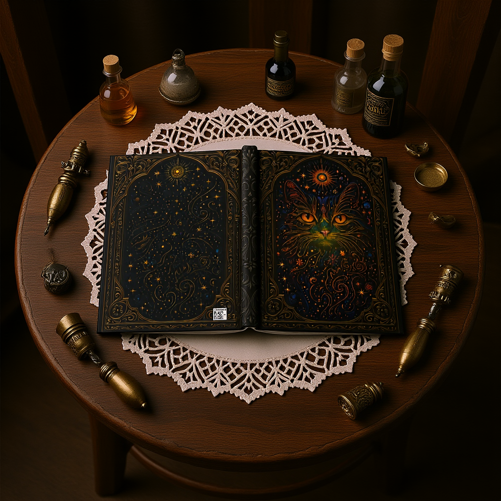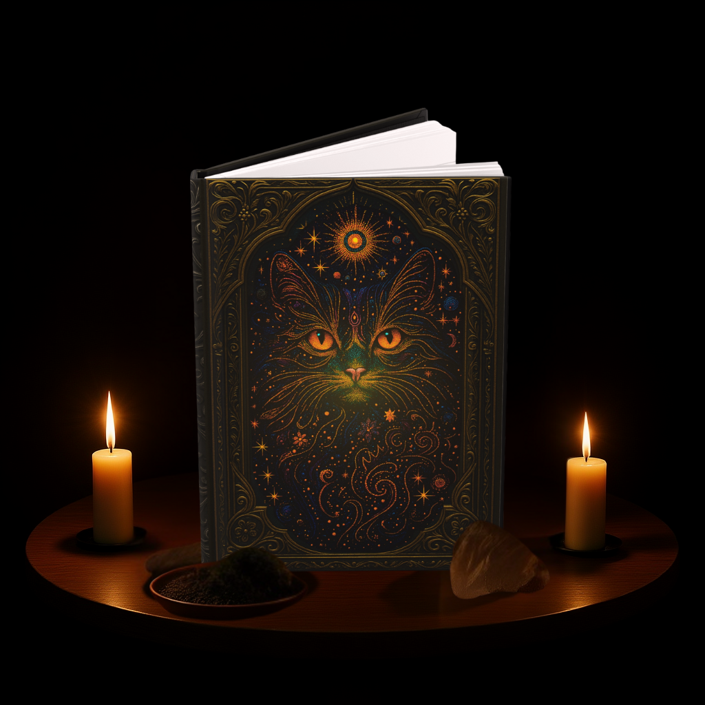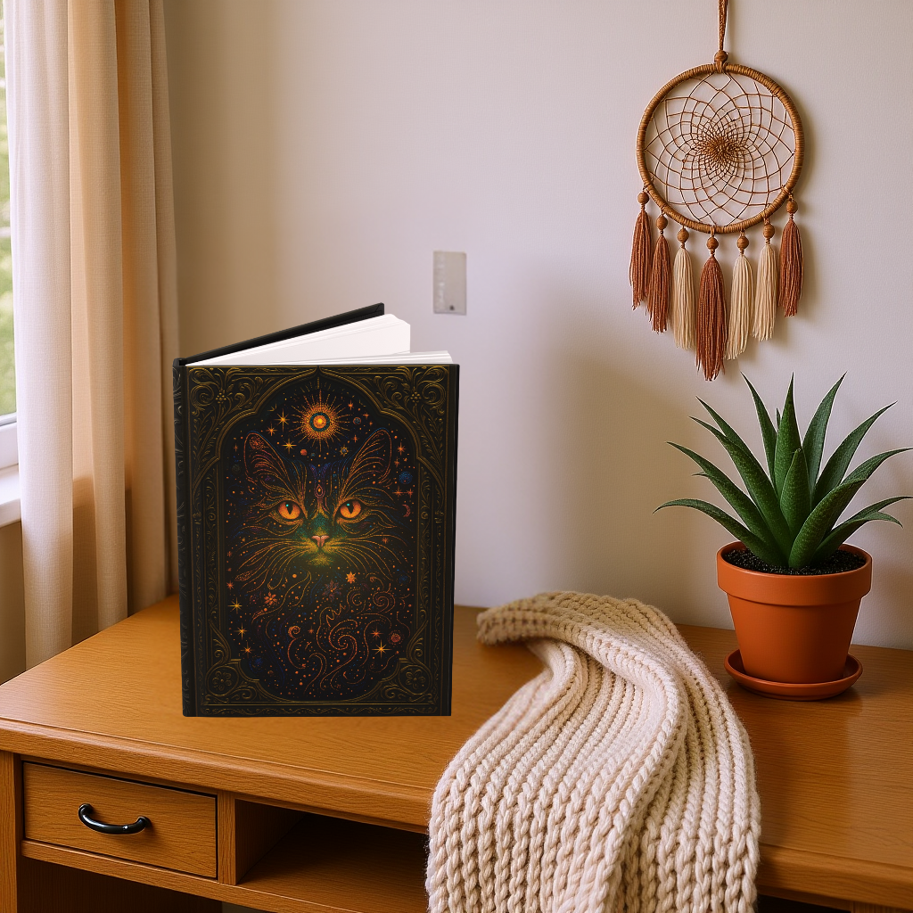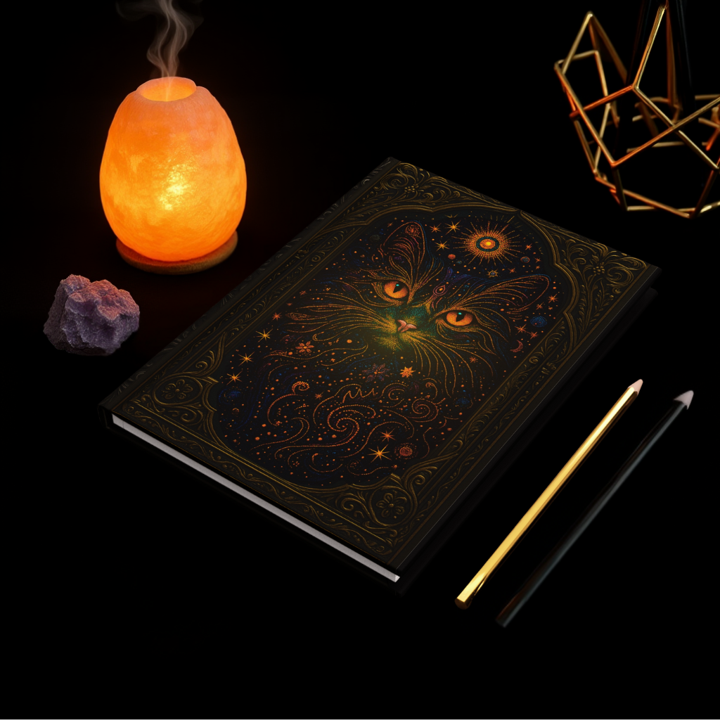 The cat sees beyond the veil, walking between light and shadow. This celestial cat journal channels mystery, intuition, and quiet wisdom. With radiant fur, moonlit accents, and cosmic detailing, itβs a sacred space for self-reflection and creative magic.